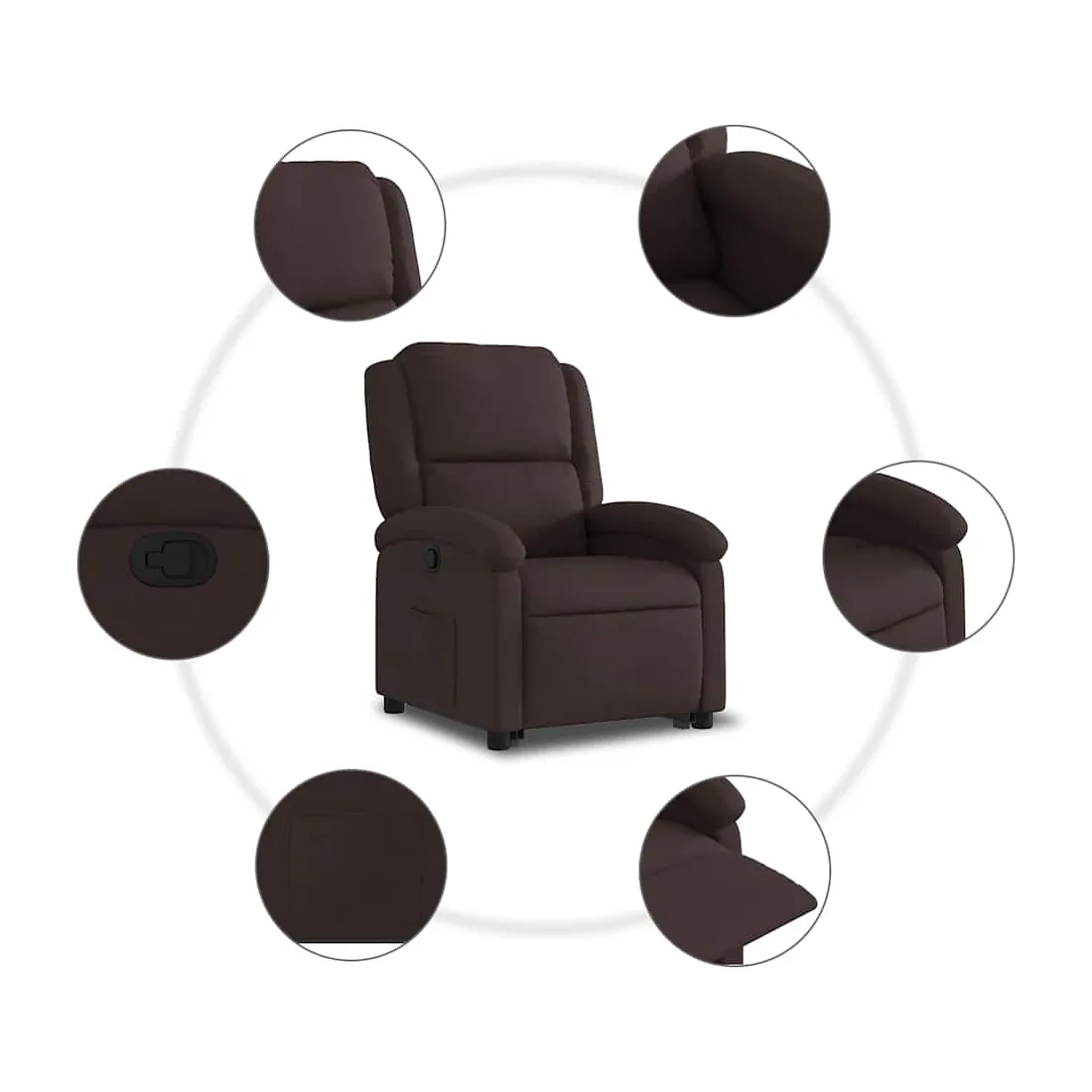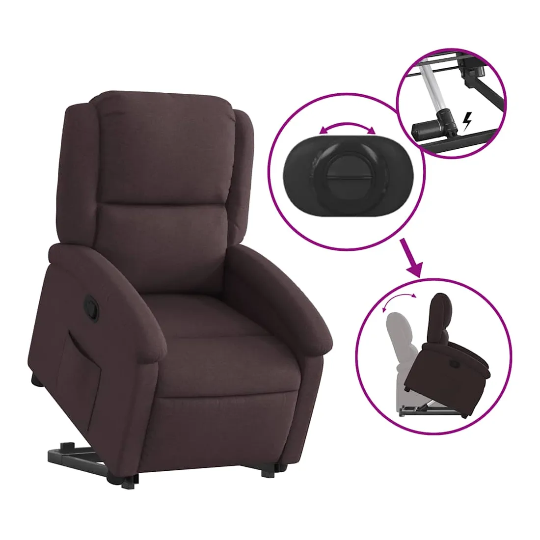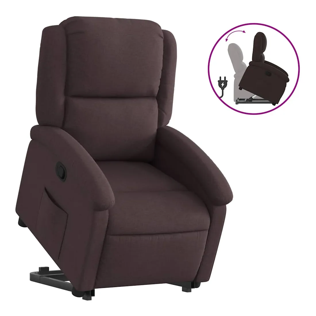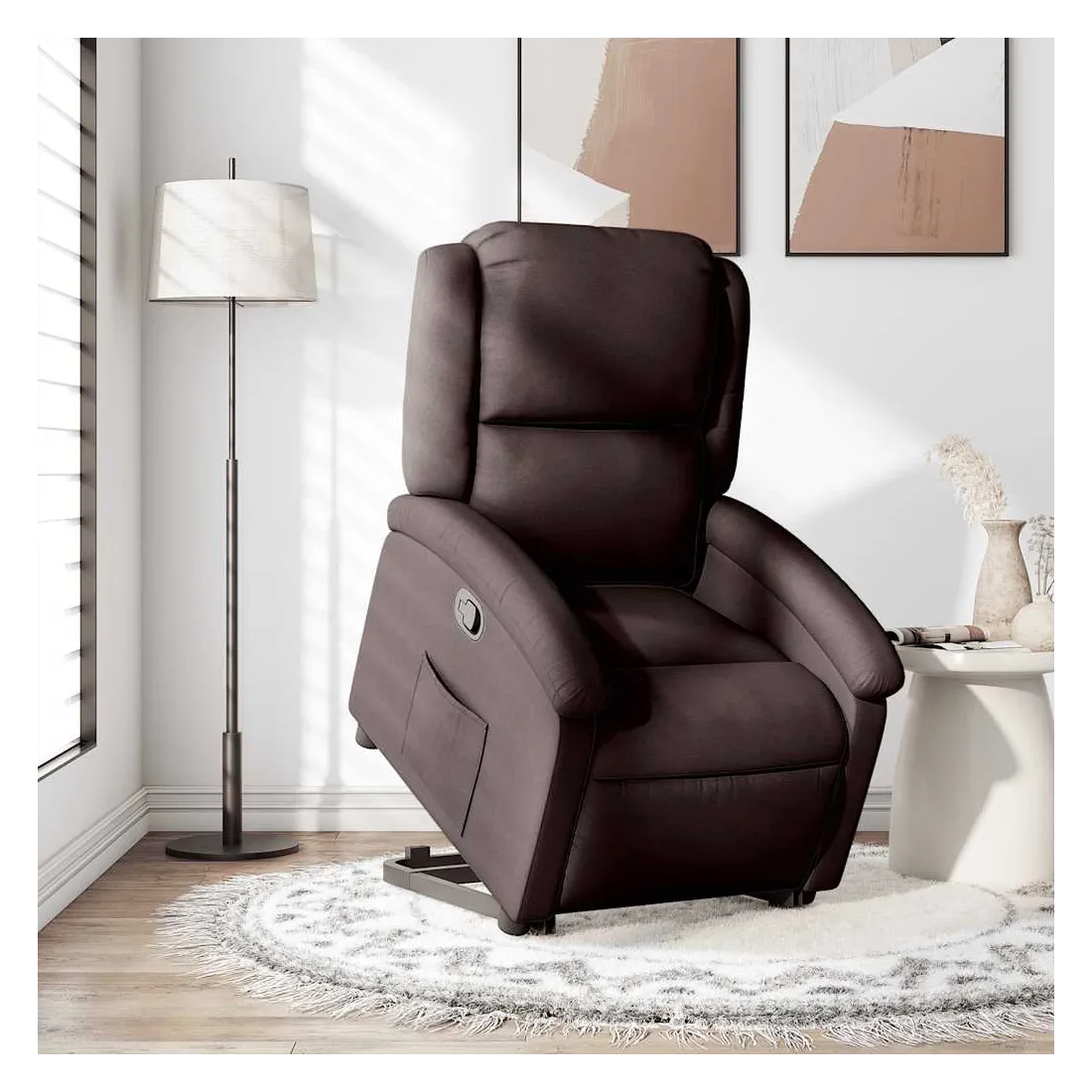 Asseyez-vous et détendez-vous dans ce fauteuil inclinable très confortable ! Fonction de levage électrique : ce fauteuil inclinable pour personnes âgées est équipé d'un moteur électrique pour la fonction de levage. Grâce à la fonction qui pousse toute la chaise vers le haut, vous pouvez facilement vous tenir debout sans stresser votre dos et vos genoux en appuyant simplement sur le bouton.Fonction d'inclinaison manuelle : ce fauteuil inclinable est doté d'une poignée du côté droit. Vous pouvez régler manuellement le repose-pieds et le dossier dans n'importe quelle position selon votre confort en tirant simplement sur la poignée. Cette fonction permet une inclinaison maximale de 135 degrés. De plus, le dossier peut revenir rapidement à sa position d'origine en tirant simplement sur la poignée.Expérience d'assise confortable : le siège, le dossier et les larges accoudoirs bien rembourrés recouverts de tissu procurent une sensation confortable et chaleureuse, vous permettant de vous sentir enveloppé lorsque vous êtes assis. Le tissu présente un aspect simple et épuré et est respirant et durable.Poche latérale pratique : ce fauteuil est doté d'une poche latérale pour vous permettre de garder vos objets essentiels à portée de main.Cadre solide et stable : le cadre en bois et en métal offre une structure solide et une grande stabilité. Ce fauteuil inclinable est confortable et durable.