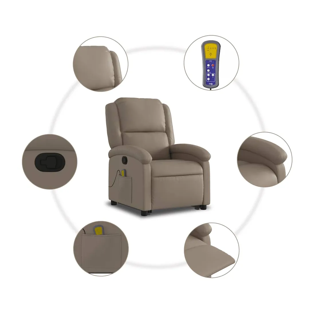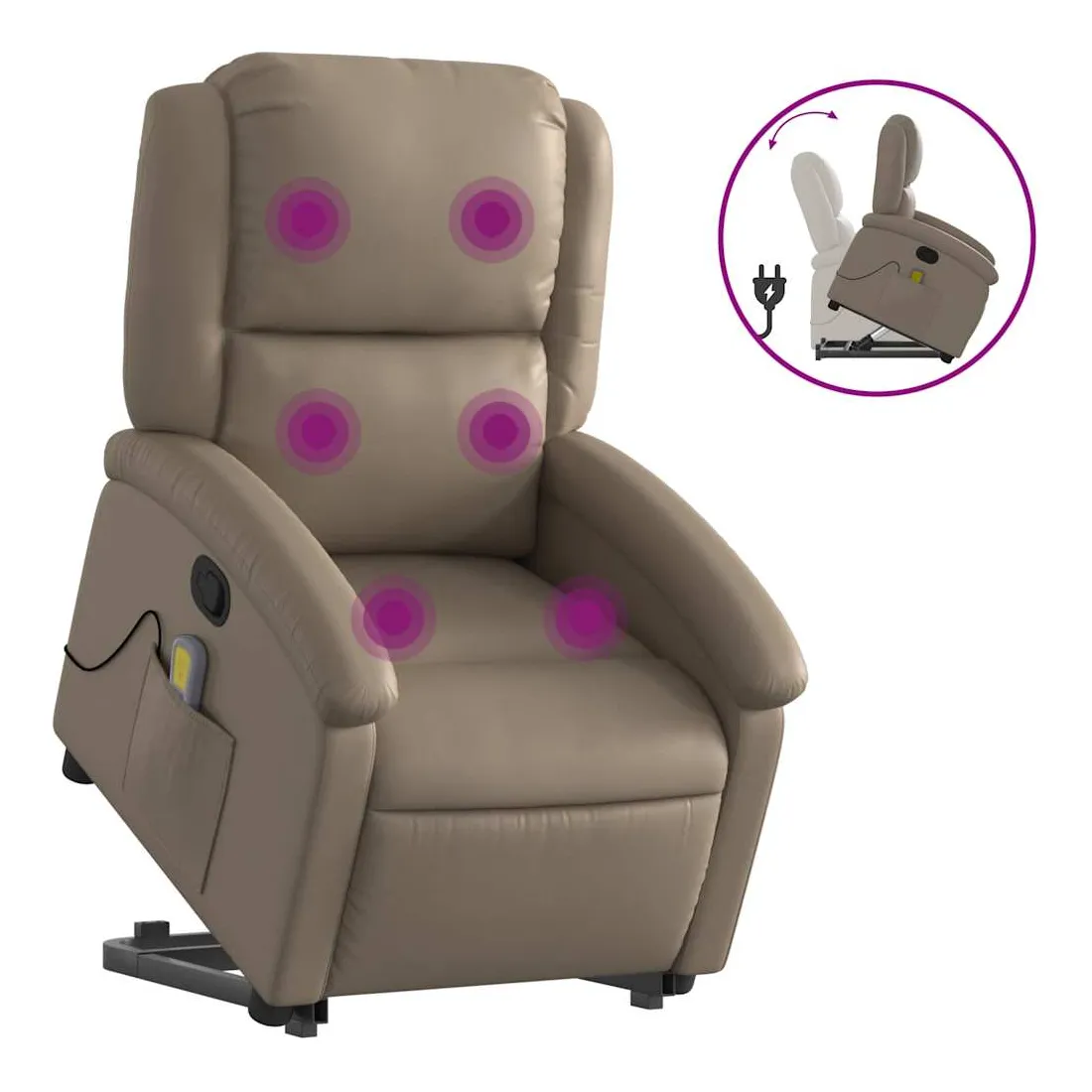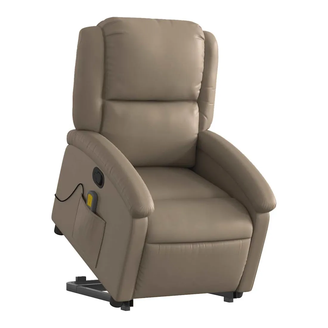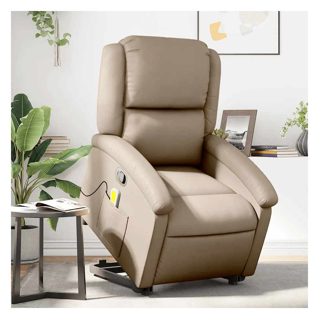 Asseyez-vous et détendez-vous dans ce fauteuil inclinable de massage très confortable ! Fonction de levage électrique : ce fauteuil inclinable pour personnes âgées est équipé d'un moteur électrique pour la fonction de levage. Grâce à la fonction qui pousse toute la chaise vers le haut, vous pouvez facilement vous tenir debout sans stresser votre dos et vos genoux en appuyant simplement sur le bouton.Fonction d'inclinaison manuelle : ce fauteuil inclinable est doté d'une poignée du côté droit. Vous pouvez régler manuellement le repose-pieds et le dossier dans n'importe quelle position selon votre confort en tirant simplement sur la poignée. Cette fonction permet une inclinaison maximale de 135 degrés. De plus, le dossier peut revenir rapidement à sa position d'origine en tirant simplement sur la poignée.Fonction de vibration : les 6 points de massage vous permettent de faire l'expérience d'un massage mieux ciblé. De plus, la télécommande incluse vous permet de choisir différents programmes de massage. La fonction de massage est alimentée par le connecteur USB qui nécessite une source d'alimentation USB certifiée de 5 V (non fournie).Expérience de siège confortable : le siège, le dossier et les larges accoudoirs rembourrés épais recouverts de similicuir procurent une sensation confortable, vous faisant vous sentir enlacé lorsque vous êtes assis. Le similicuir est un matériau très résistant. Il est résistant aux taches, ce qui le rend facile à nettoyer avec un chiffon humide. La surface lisse donne également un aspect luxueux et la beauté du cuir véritable.Poche latérale pratique : ce fauteuil est doté d'une poche latérale pour ranger votre télécommande ou garder vos objets essentiels à portée de main.Cadre solide et stable : le cadre en bois et en métal offre une structure solide et une grande stabilité. Ce fauteuil inclinable est confortable et durable.