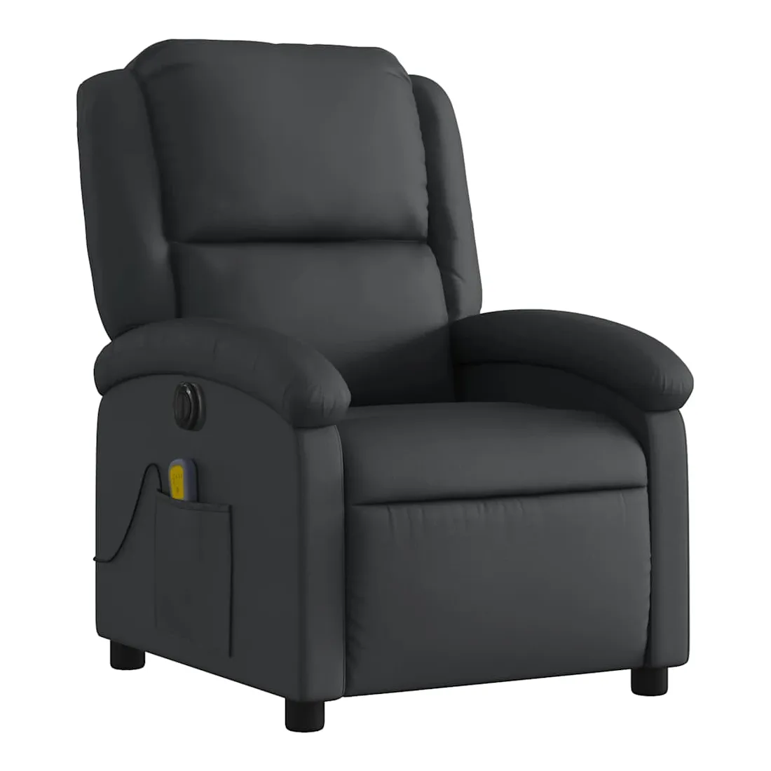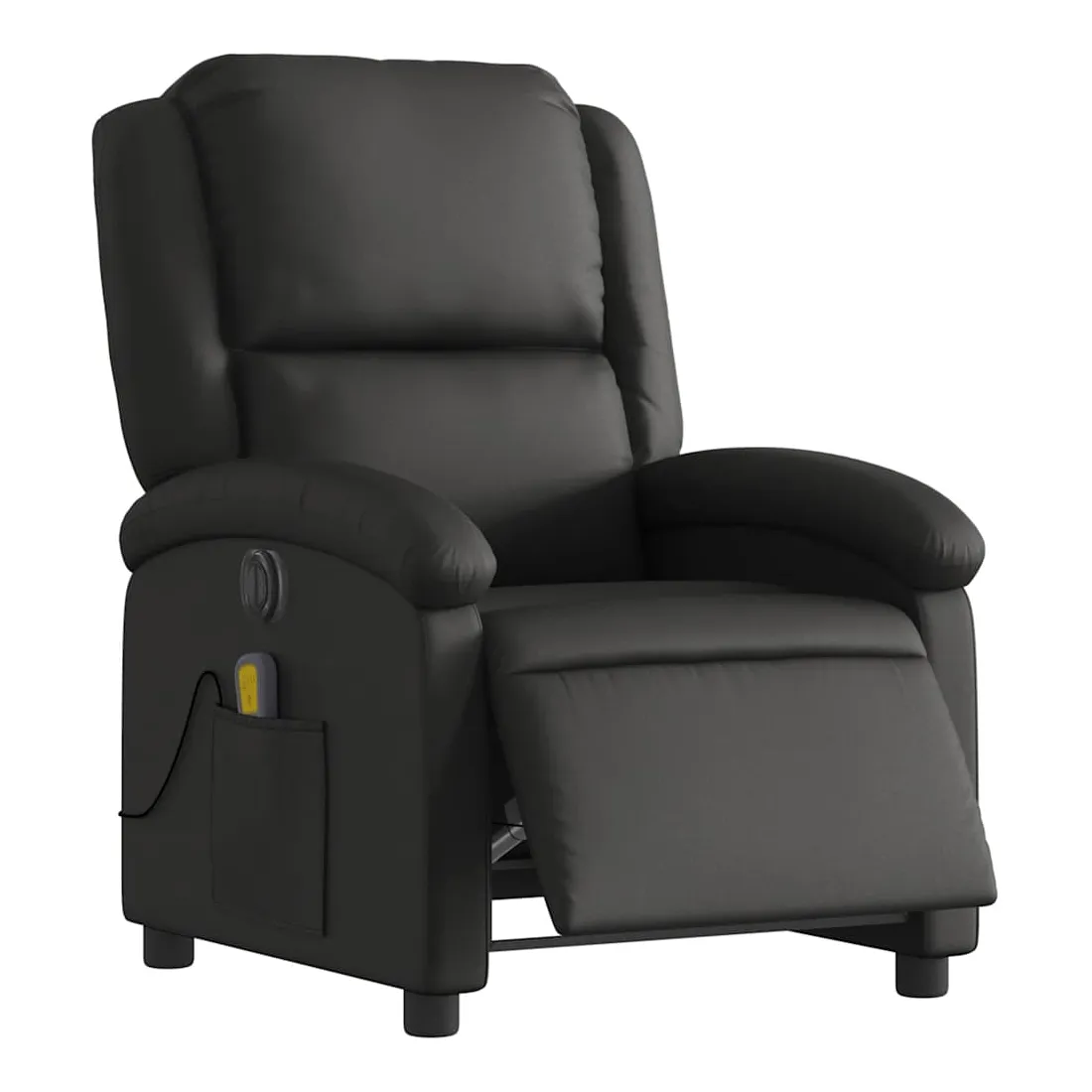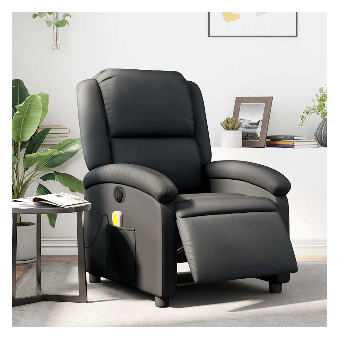 Asseyez-vous et détendez-vous dans ce fauteuil inclinable de massage électrique très confortable ! Fonction d'inclinaison électrique : ce fauteuil inclinable est équipé d'un moteur électrique qui permet de régler automatiquement le repose-pied et le dossier dans n'importe quelle position, selon votre confort, en appuyant simplement sur le bouton situé sur le côté du fauteuil. Cette fonction permet une inclinaison maximale de 135 degrés. En outre, le dossier peut revenir automatiquement à sa position d'origine par une simple pression sur le bouton.Fonction de vibration : les 6 points de massage vous permettent de faire l'expérience d'un massage mieux ciblé. De plus, la télécommande incluse vous permet de choisir différents programmes de massage. La fonction de massage est alimentée par le connecteur USB qui nécessite une source d'alimentation USB certifiée de 5 V (non fournie).Expérience de siège confortable : le siège, le dossier et les larges accoudoirs rembourrés épais recouverts de cuir véritable procurent une sensation confortable et chaleureuse, vous faisant vous sentir enlacé lorsque vous êtes assis. Le cuir véritable est un matériau naturellement intemporel. Il peut durer toute une vie avec des soins et un entretien appropriés. La surface lisse lui donne également un aspect élégant tout en garantissant un confort optimal.Poche latérale pratique : ce fauteuil est doté d'une poche latérale pour ranger votre télécommande ou garder vos objets essentiels à portée de main.Cadre solide et stable : le cadre en bois et en métal offre une structure solide et une grande stabilité. Ce fauteuil inclinable est confortable et durable.