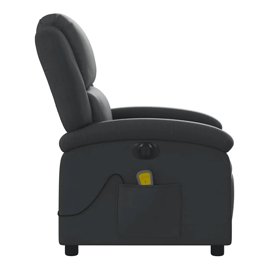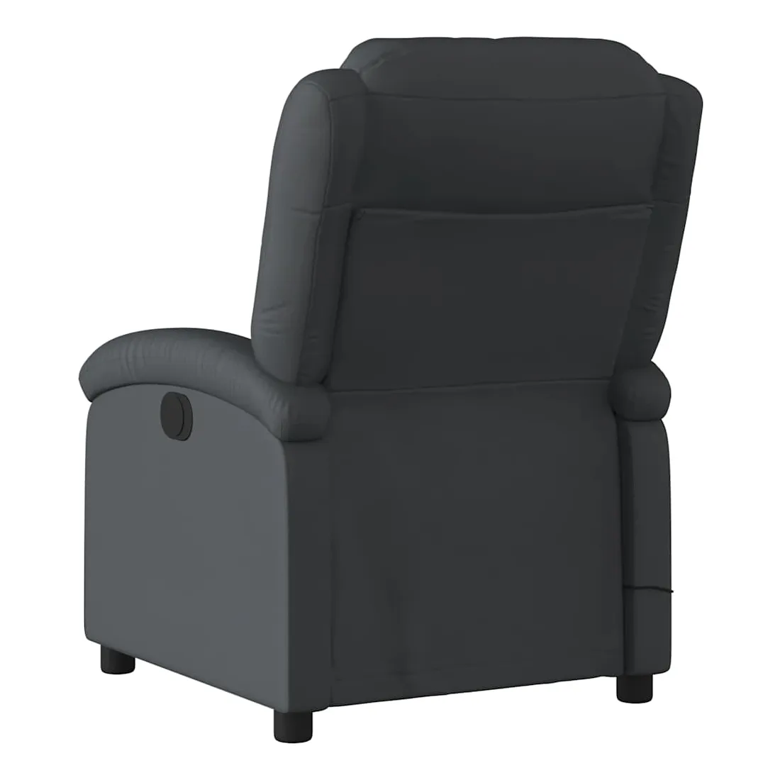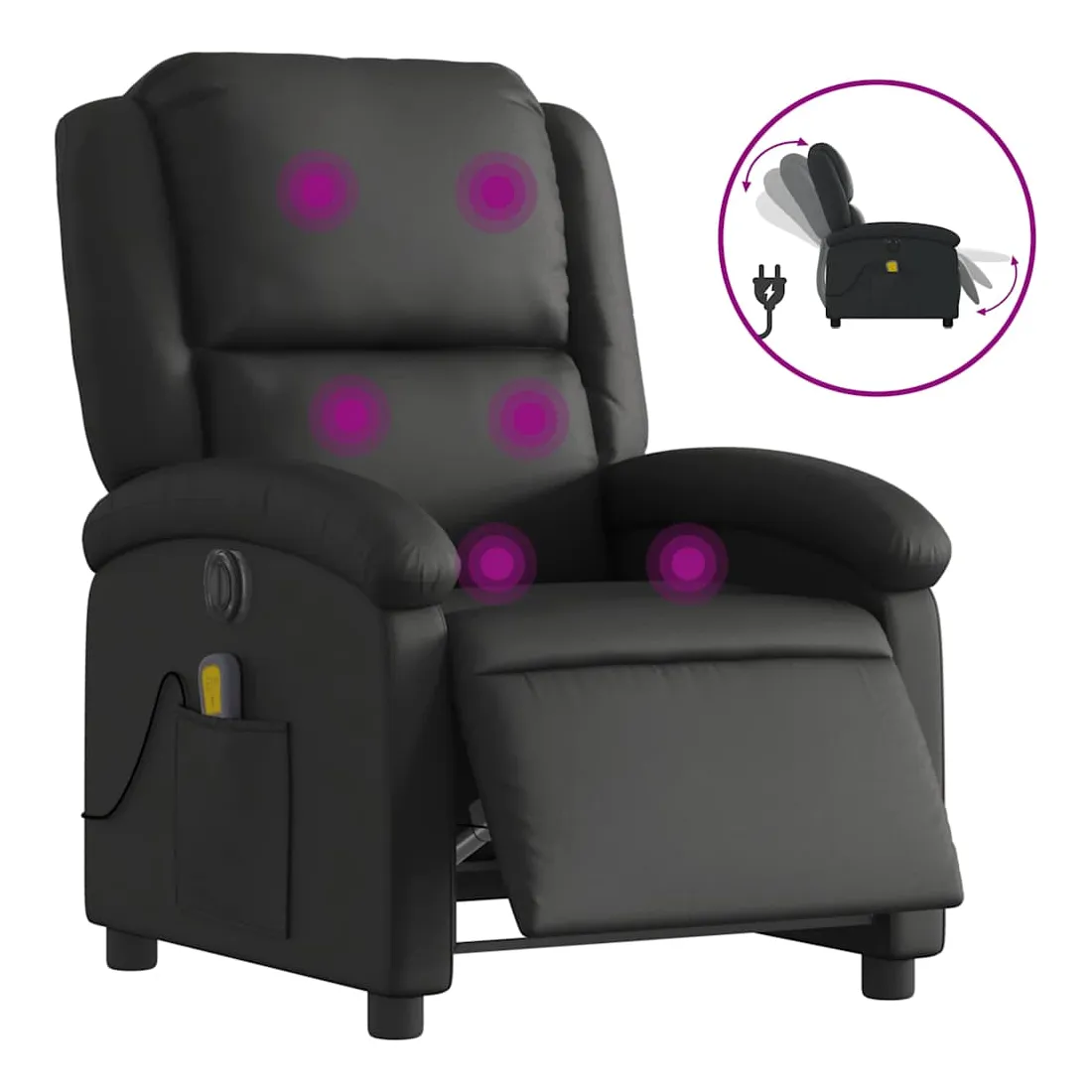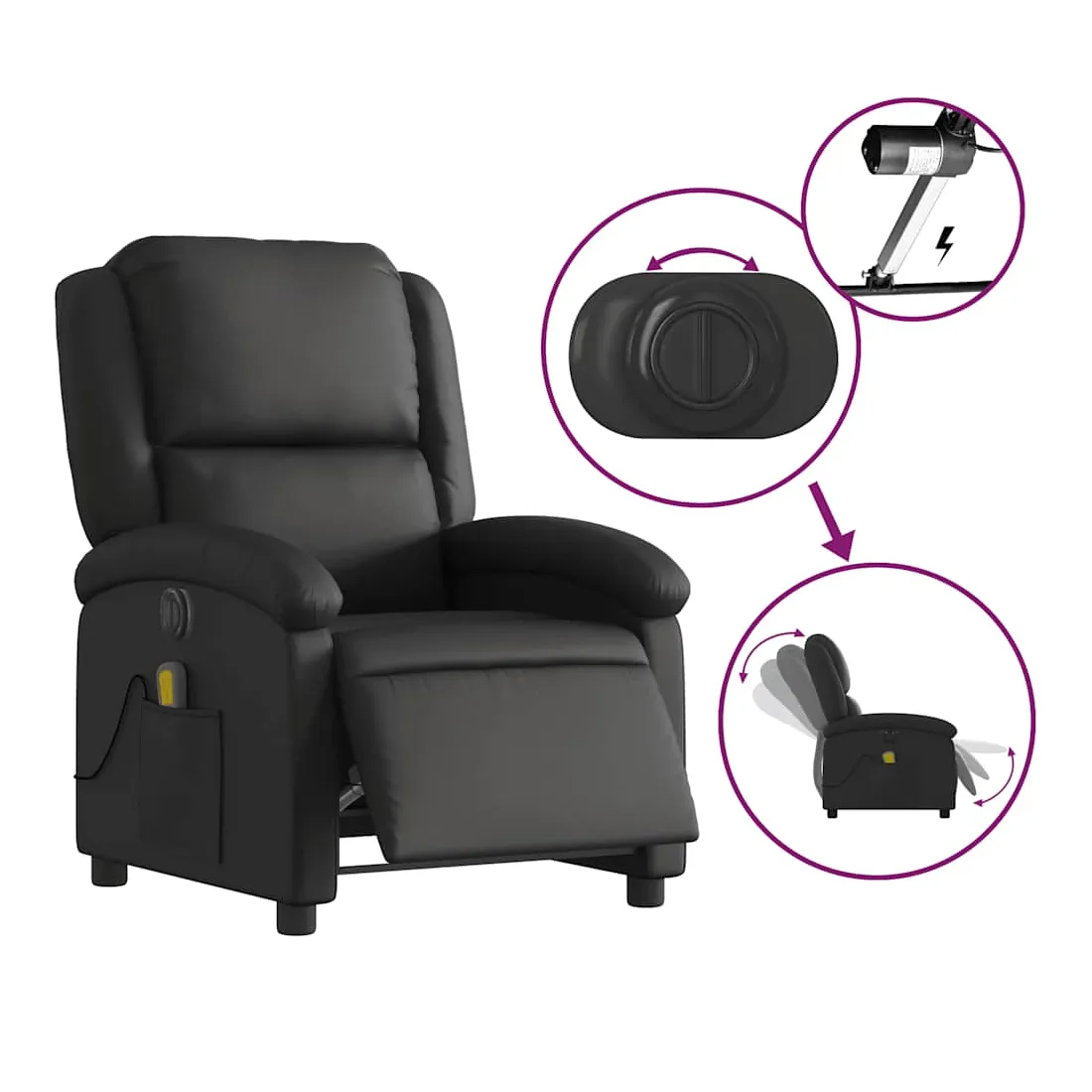 Asseyez-vous et détendez-vous dans ce fauteuil inclinable de massage électrique très confortable ! Fonction d'inclinaison électrique : ce fauteuil inclinable est équipé d'un moteur électrique qui permet de régler automatiquement le repose-pied et le dossier dans n'importe quelle position, selon votre confort, en appuyant simplement sur le bouton situé sur le côté du fauteuil. Cette fonction permet une inclinaison maximale de 135 degrés. En outre, le dossier peut revenir automatiquement à sa position d'origine par une simple pression sur le bouton.Fonction de vibration : les 6 points de massage vous permettent de faire l'expérience d'un massage mieux ciblé. De plus, la télécommande incluse vous permet de choisir différents programmes de massage. La fonction de massage est alimentée par le connecteur USB qui nécessite une source d'alimentation USB certifiée de 5 V (non fournie).Expérience de siège confortable : le siège, le dossier et les larges accoudoirs rembourrés épais recouverts de cuir véritable procurent une sensation confortable et chaleureuse, vous faisant vous sentir enlacé lorsque vous êtes assis. Le cuir véritable est un matériau naturellement intemporel. Il peut durer toute une vie avec des soins et un entretien appropriés. La surface lisse lui donne également un aspect élégant tout en garantissant un confort optimal.Poche latérale pratique : ce fauteuil est doté d'une poche latérale pour ranger votre télécommande ou garder vos objets essentiels à portée de main.Cadre solide et stable : le cadre en bois et en métal offre une structure solide et une grande stabilité. Ce fauteuil inclinable est confortable et durable.