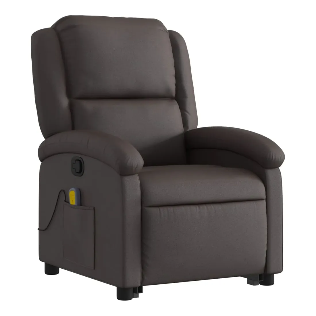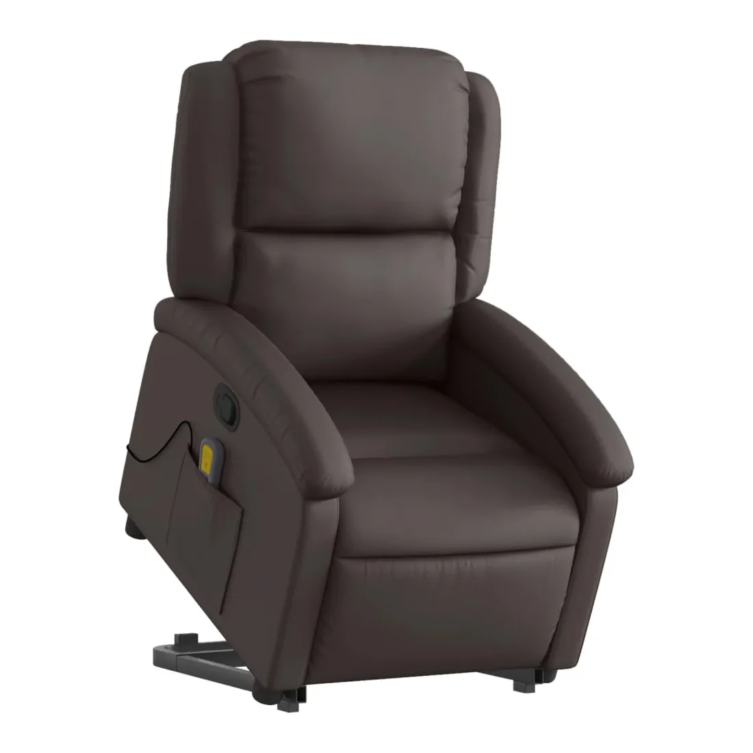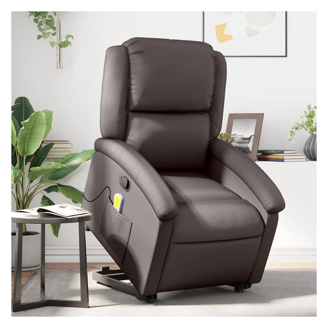 Asseyez-vous et détendez-vous dans ce fauteuil inclinable de massage très confortable ! Fonction de levage électrique : ce fauteuil inclinable pour personnes âgées est équipé d'un moteur électrique pour la fonction de levage. Grâce à la fonction qui pousse toute la chaise vers le haut, vous pouvez facilement vous tenir debout sans stresser votre dos et vos genoux en appuyant simplement sur le bouton.Fonction d'inclinaison manuelle : ce fauteuil inclinable est doté d'une poignée du côté droit. Vous pouvez régler manuellement le repose-pieds et le dossier dans n'importe quelle position selon votre confort en tirant simplement sur la poignée. Cette fonction permet une inclinaison maximale de 135 degrés. De plus, le dossier peut revenir rapidement à sa position d'origine en tirant simplement sur la poignée.Fonction de vibration : les 6 points de massage vous permettent de faire l'expérience d'un massage mieux ciblé. De plus, la télécommande incluse vous permet de choisir différents programmes de massage. La fonction de massage est alimentée par le connecteur USB qui nécessite une source d'alimentation USB certifiée de 5 V (non fournie).Expérience de siège confortable : le siège, le dossier et les larges accoudoirs rembourrés épais recouverts de cuir véritable procurent une sensation confortable et chaleureuse, vous faisant vous sentir enlacé lorsque vous êtes assis. Le cuir véritable est un matériau naturellement intemporel. Il peut durer toute une vie avec des soins et un entretien appropriés. La surface lisse lui donne également un aspect élégant tout en garantissant un confort optimal. Poche latérale pratique : ce fauteuil est doté d'une poche latérale pour ranger votre télécommande ou garder vos objets essentiels à portée de main.Cadre solide et stable : le cadre en bois et en métal offre une structure solide et une grande stabilité. Ce fauteuil inclinable est confortable et durable.