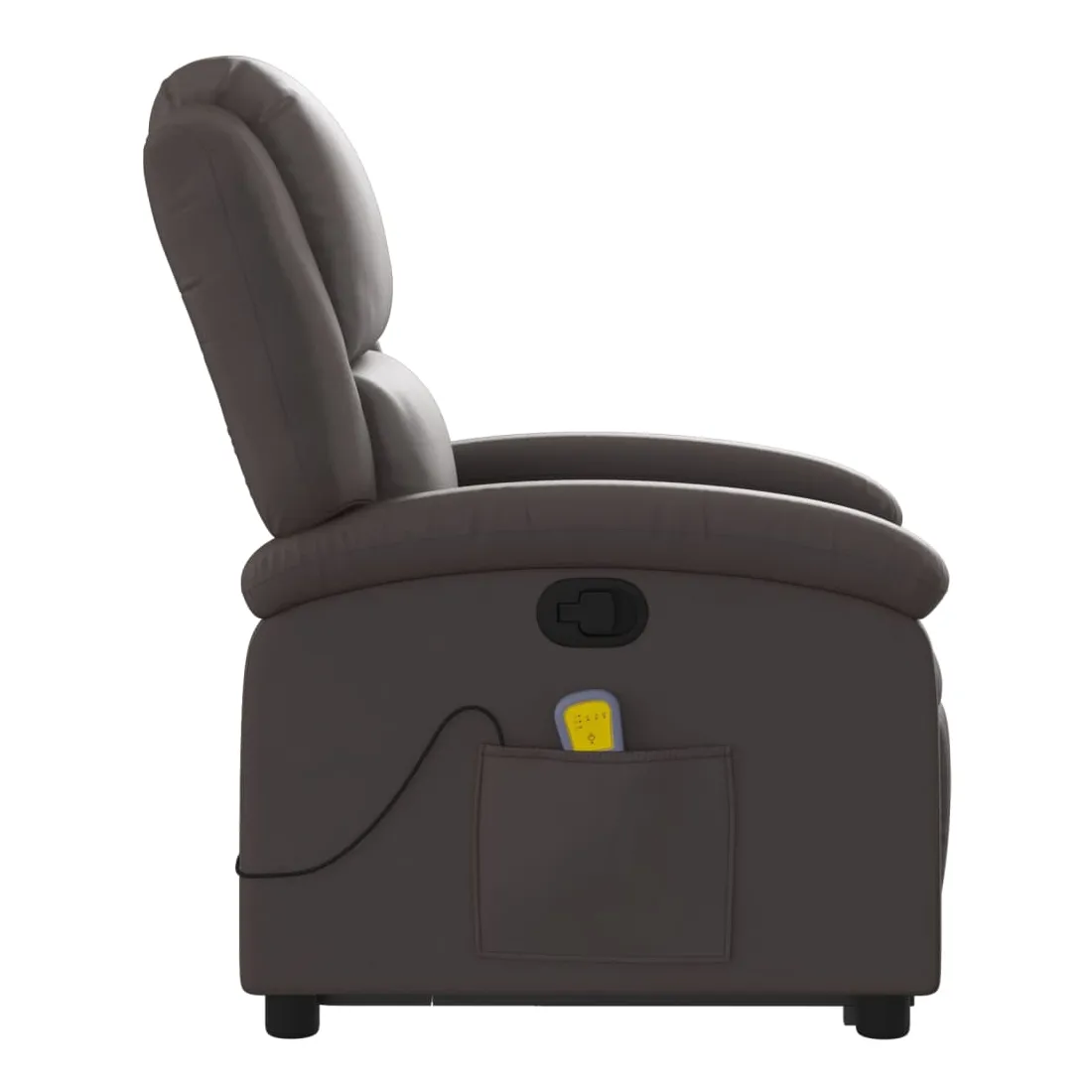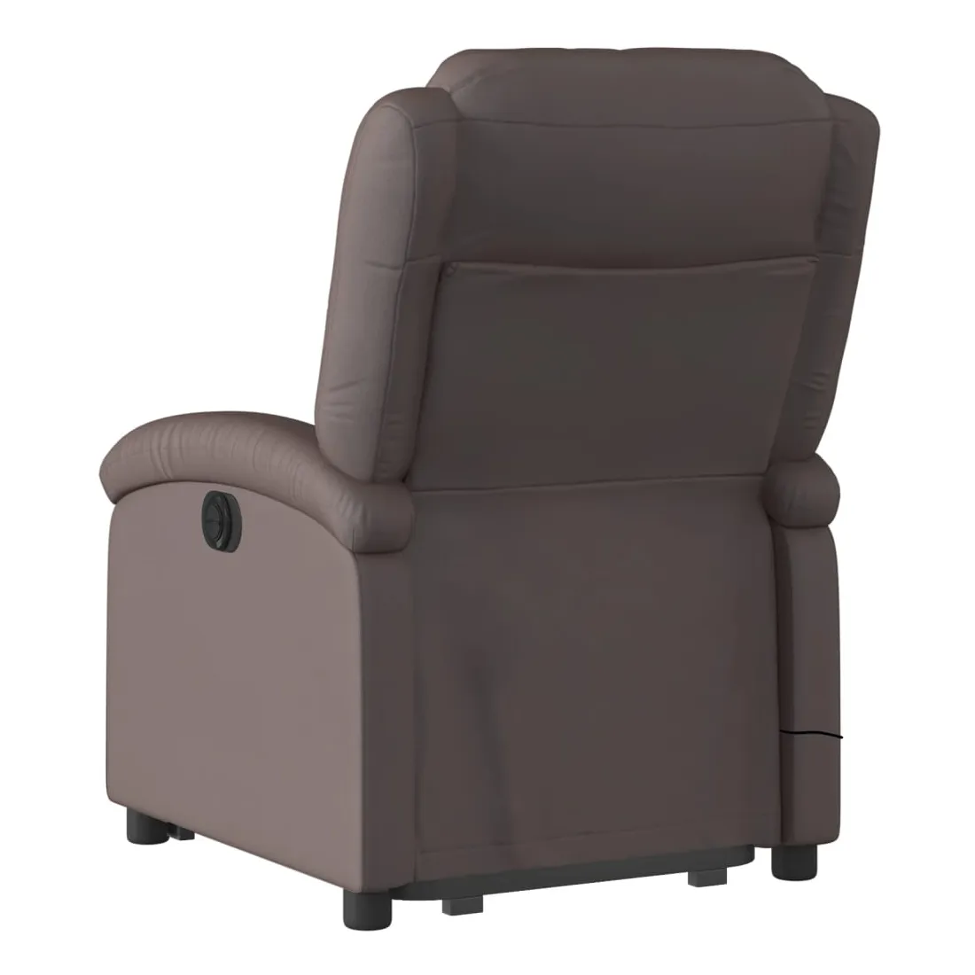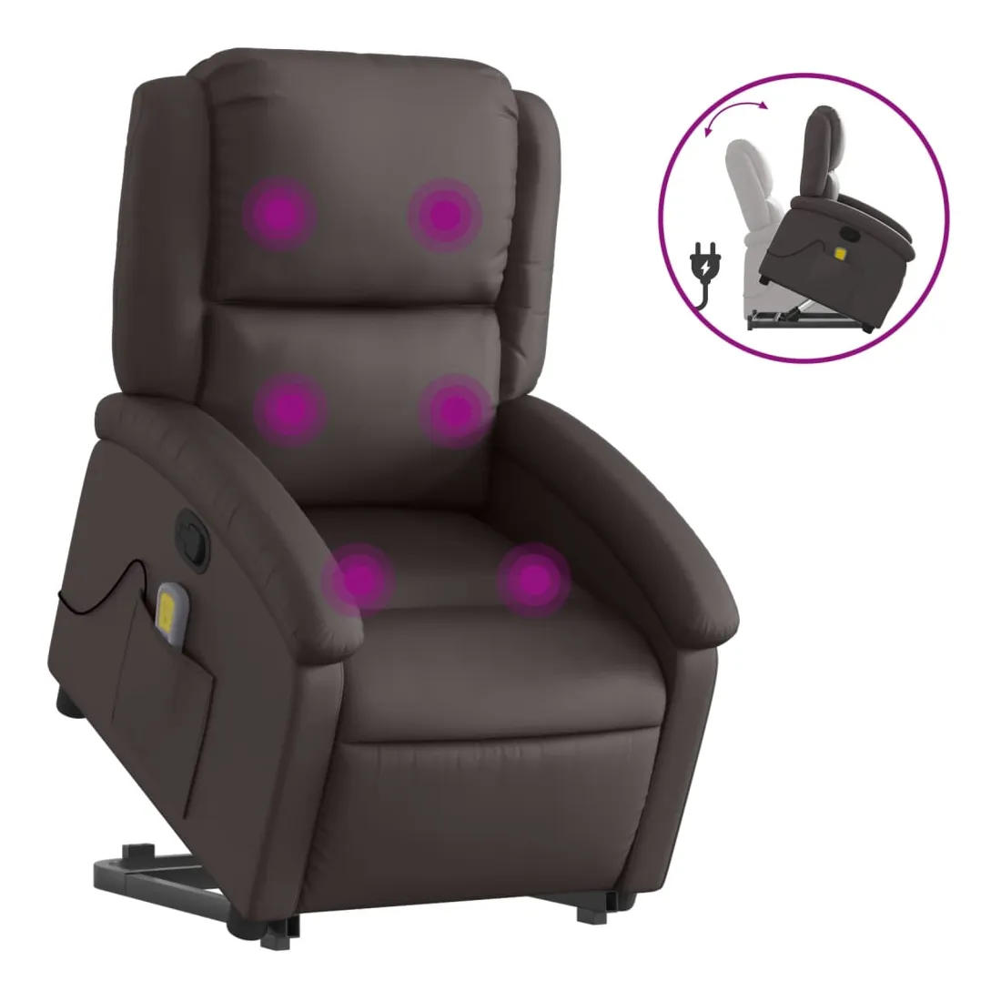 Asseyez-vous et détendez-vous dans ce fauteuil inclinable de massage très confortable ! Fonction de levage électrique : ce fauteuil inclinable pour personnes âgées est équipé d'un moteur électrique pour la fonction de levage. Grâce à la fonction qui pousse toute la chaise vers le haut, vous pouvez facilement vous tenir debout sans stresser votre dos et vos genoux en appuyant simplement sur le bouton.Fonction d'inclinaison manuelle : ce fauteuil inclinable est doté d'une poignée du côté droit. Vous pouvez régler manuellement le repose-pieds et le dossier dans n'importe quelle position selon votre confort en tirant simplement sur la poignée. Cette fonction permet une inclinaison maximale de 135 degrés. De plus, le dossier peut revenir rapidement à sa position d'origine en tirant simplement sur la poignée.Fonction de vibration : les 6 points de massage vous permettent de faire l'expérience d'un massage mieux ciblé. De plus, la télécommande incluse vous permet de choisir différents programmes de massage. La fonction de massage est alimentée par le connecteur USB qui nécessite une source d'alimentation USB certifiée de 5 V (non fournie).Expérience de siège confortable : le siège, le dossier et les larges accoudoirs rembourrés épais recouverts de cuir véritable procurent une sensation confortable et chaleureuse, vous faisant vous sentir enlacé lorsque vous êtes assis. Le cuir véritable est un matériau naturellement intemporel. Il peut durer toute une vie avec des soins et un entretien appropriés. La surface lisse lui donne également un aspect élégant tout en garantissant un confort optimal. Poche latérale pratique : ce fauteuil est doté d'une poche latérale pour ranger votre télécommande ou garder vos objets essentiels à portée de main.Cadre solide et stable : le cadre en bois et en métal offre une structure solide et une grande stabilité. Ce fauteuil inclinable est confortable et durable.