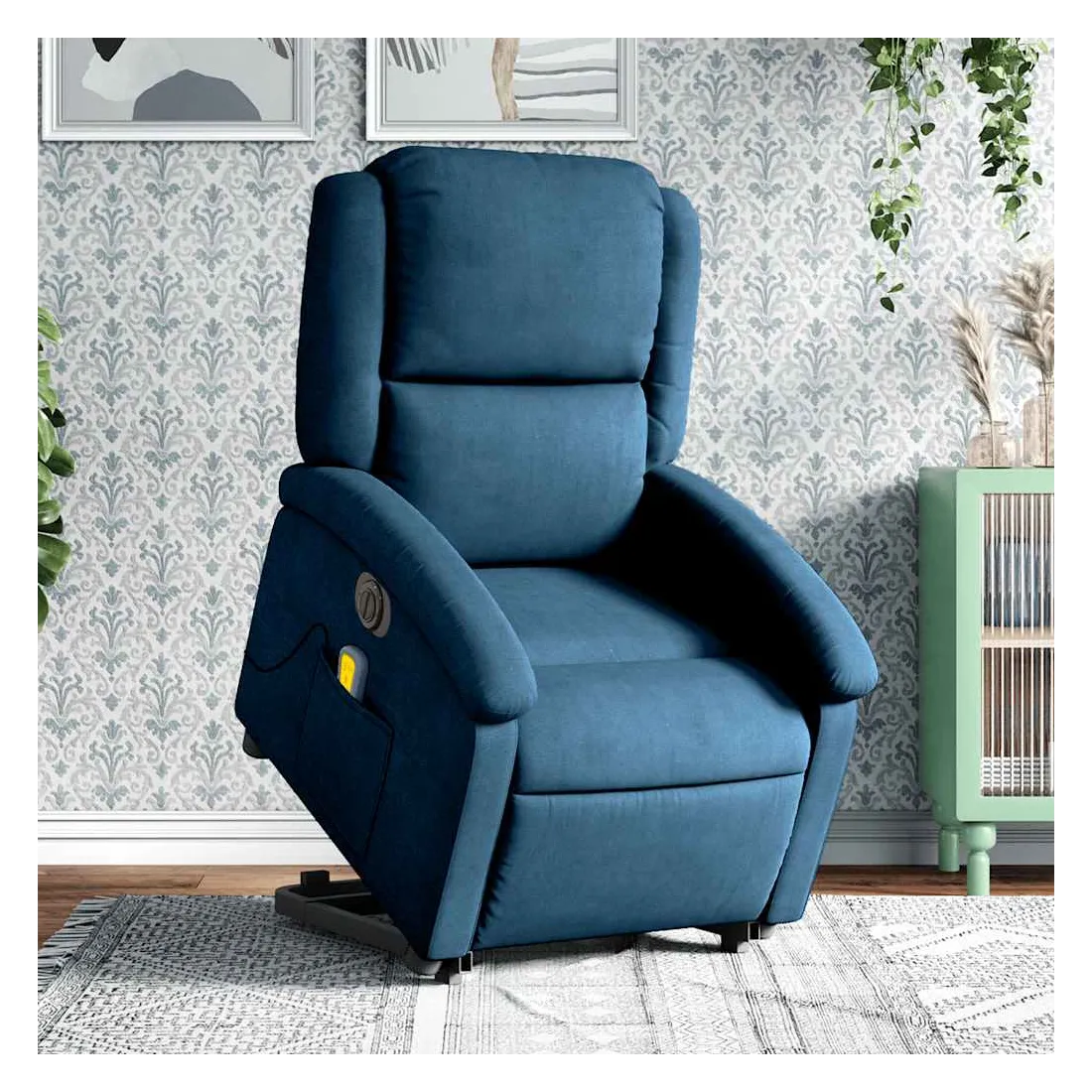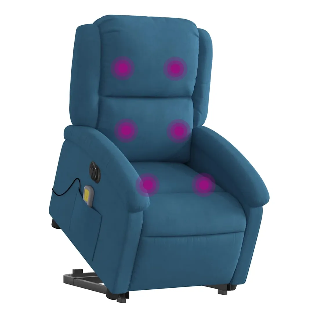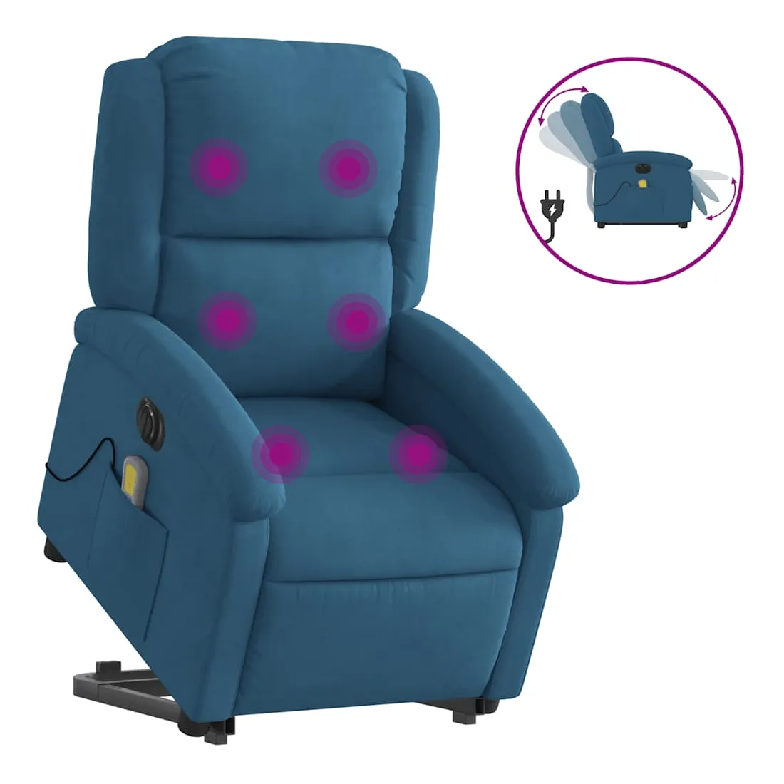 Asseyez-vous et détendez-vous dans ce fauteuil inclinable de massage électrique très confortable ! Fonction de levage électrique : ce fauteuil inclinable pour personnes âgées est équipé d'un moteur électrique pour la fonction de levage. Grâce à la fonction qui pousse toute la chaise vers le haut, vous pouvez facilement vous tenir debout sans stresser votre dos et vos genoux en appuyant simplement sur le bouton.Fonction d'inclinaison électrique : ce fauteuil inclinable est également équipé d'un moteur électrique qui permet de régler automatiquement le repose-pied et le dossier dans n'importe quelle position, selon votre confort, en appuyant simplement sur le bouton situé sur le côté du fauteuil. Cette fonction permet une inclinaison maximale de 135 degrés. En outre, le dossier peut revenir automatiquement à sa position d'origine par une simple pression sur le bouton.Fonction de vibration : les 6 points de massage vous permettent de faire l'expérience d'un massage mieux ciblé. De plus, la télécommande incluse vous permet de choisir différents programmes de massage. La fonction de massage est alimentée par le connecteur USB qui nécessite une source d'alimentation USB certifiée de 5 V (non fournie).Expérience d'assise confortable : le siège, le dossier et les larges accoudoirs rembourrés épais recouverts de velours procurent une sensation confortable et chaleureuse, vous faisant vous sentir enlacé lorsque vous êtes assis. Le velours est un tissu doux et confortable qui est agréable sur la peau.Poche latérale pratique : ce fauteuil est doté d'une poche latérale pour ranger votre télécommande ou garder vos objets essentiels à portée de main.Cadre solide et stable : le cadre en bois et en métal offre une structure solide et une grande stabilité. Ce fauteuil inclinable est confortable et durable.