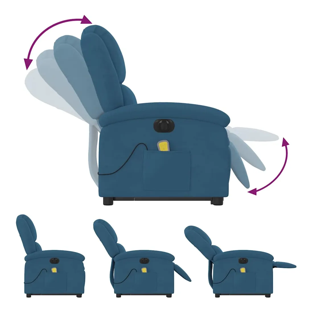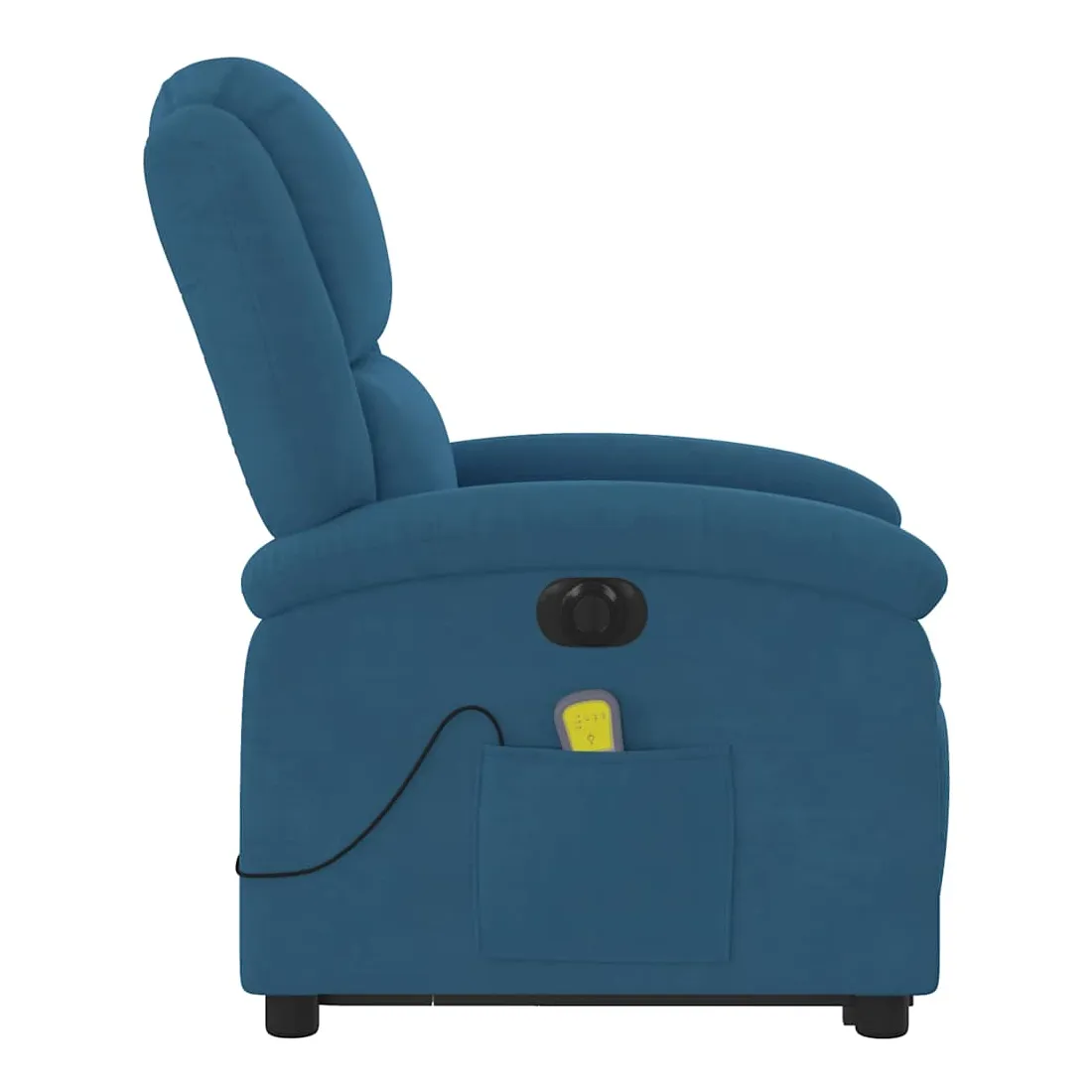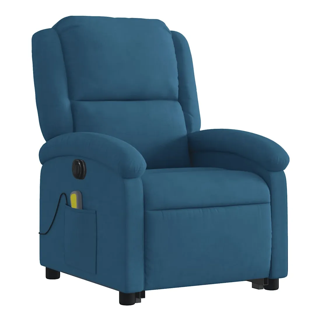 Asseyez-vous et détendez-vous dans ce fauteuil inclinable de massage électrique très confortable ! Fonction de levage électrique : ce fauteuil inclinable pour personnes âgées est équipé d'un moteur électrique pour la fonction de levage. Grâce à la fonction qui pousse toute la chaise vers le haut, vous pouvez facilement vous tenir debout sans stresser votre dos et vos genoux en appuyant simplement sur le bouton.Fonction d'inclinaison électrique : ce fauteuil inclinable est également équipé d'un moteur électrique qui permet de régler automatiquement le repose-pied et le dossier dans n'importe quelle position, selon votre confort, en appuyant simplement sur le bouton situé sur le côté du fauteuil. Cette fonction permet une inclinaison maximale de 135 degrés. En outre, le dossier peut revenir automatiquement à sa position d'origine par une simple pression sur le bouton.Fonction de vibration : les 6 points de massage vous permettent de faire l'expérience d'un massage mieux ciblé. De plus, la télécommande incluse vous permet de choisir différents programmes de massage. La fonction de massage est alimentée par le connecteur USB qui nécessite une source d'alimentation USB certifiée de 5 V (non fournie).Expérience d'assise confortable : le siège, le dossier et les larges accoudoirs rembourrés épais recouverts de velours procurent une sensation confortable et chaleureuse, vous faisant vous sentir enlacé lorsque vous êtes assis. Le velours est un tissu doux et confortable qui est agréable sur la peau.Poche latérale pratique : ce fauteuil est doté d'une poche latérale pour ranger votre télécommande ou garder vos objets essentiels à portée de main.Cadre solide et stable : le cadre en bois et en métal offre une structure solide et une grande stabilité. Ce fauteuil inclinable est confortable et durable.