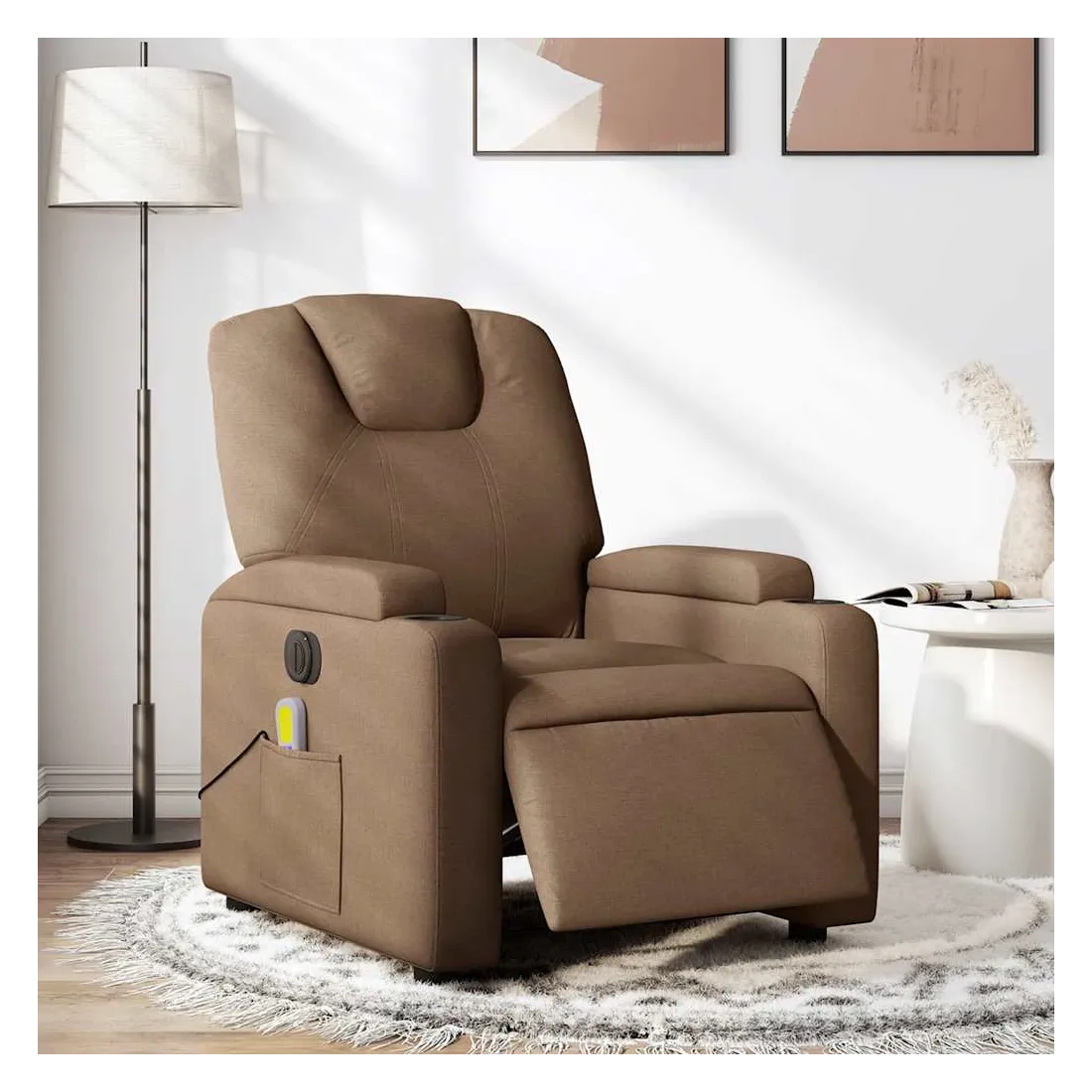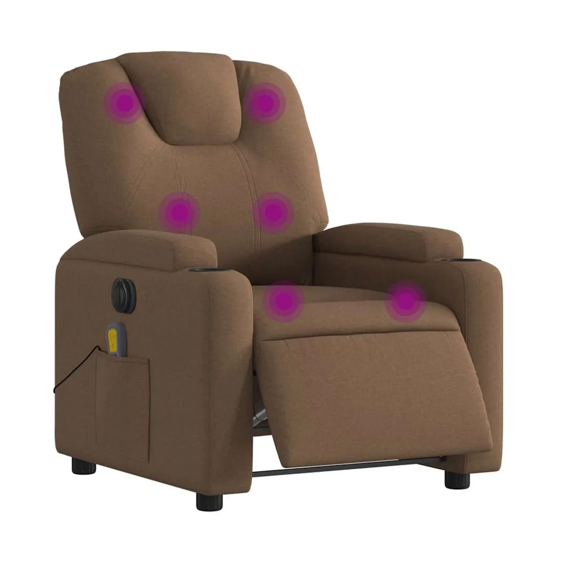 Asseyez-vous et détendez-vous dans ce fauteuil inclinable de massage électrique très confortable ! Fonction d'inclinaison électrique : ce fauteuil inclinable est équipé d'un moteur électrique qui permet de régler automatiquement le repose-pied et le dossier dans n'importe quelle position, selon votre confort, en appuyant simplement sur le bouton situé sur le côté du fauteuil. Cette fonction permet une inclinaison maximale de 135 degrés. En outre, le dossier peut revenir automatiquement à sa position d'origine par une simple pression sur le bouton.Fonction de vibration : les 6 points de massage vous permettent de faire l'expérience d'un massage mieux ciblé. De plus, la télécommande incluse vous permet de choisir différents programmes de massage. La fonction de massage est alimentée par le connecteur USB qui nécessite une source d'alimentation USB certifiée de 5 V (non fournie).Expérience d'assise confortable : le siège, le dossier et les larges accoudoirs bien rembourrés recouverts de tissu procurent une sensation confortable et chaleureuse, vous permettant de vous sentir enveloppé lorsque vous êtes assis. Le tissu présente un aspect simple et épuré et est respirant et durable.Porte-gobelets et poche latérale pratiques : ce fauteuil dispose de deux porte-gobelets pratiques pour vos boissons et d'une poche latérale pour votre télécommande ou pour garder vos objets essentiels à portée de main.Cadre solide et stable : le cadre en bois et en métal offre une structure solide et une grande stabilité. Ce fauteuil inclinable est confortable et durable.