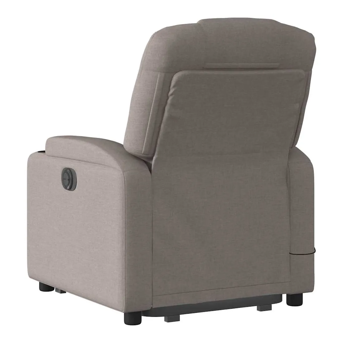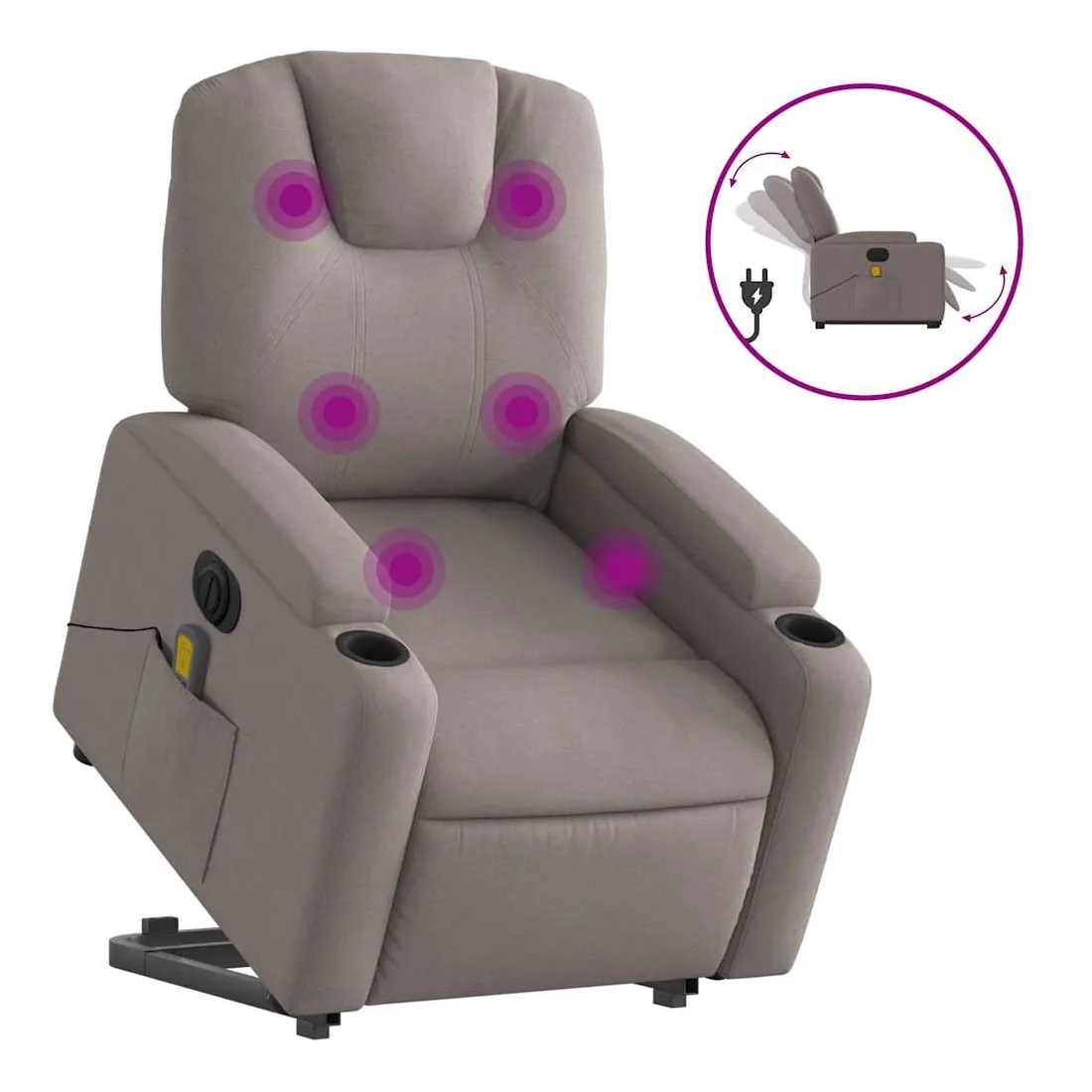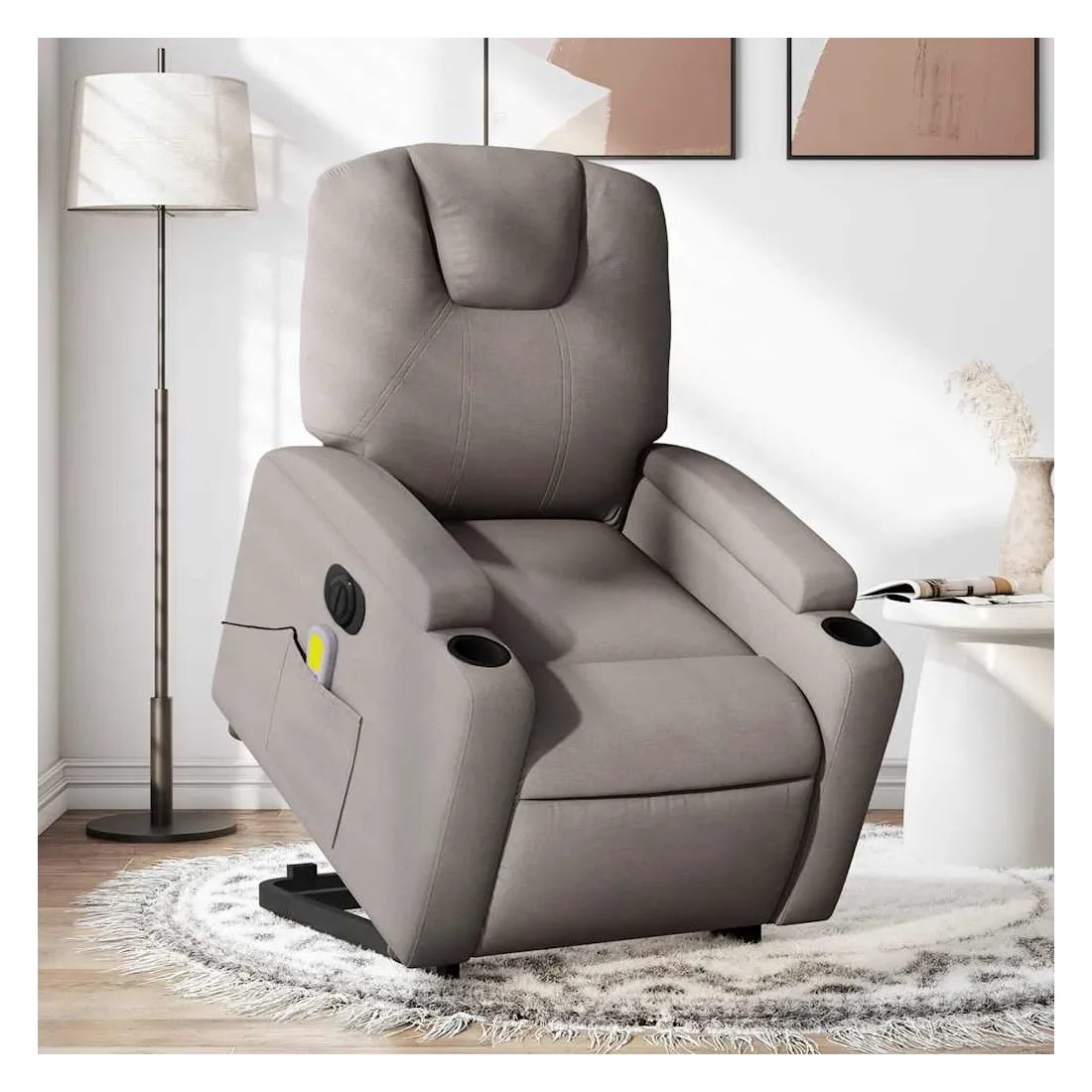 Asseyez-vous et détendez-vous dans ce fauteuil inclinable de massage électrique très confortable ! Fonction de levage électrique : ce fauteuil inclinable pour personnes âgées est équipé d'un moteur électrique pour la fonction de levage. Grâce à la fonction qui pousse toute la chaise vers le haut, vous pouvez facilement vous tenir debout sans stresser votre dos et vos genoux en appuyant simplement sur le bouton.Fonction d'inclinaison électrique : ce fauteuil inclinable est également équipé d'un moteur électrique qui permet de régler automatiquement le repose-pied et le dossier dans n'importe quelle position, selon votre confort, en appuyant simplement sur le bouton situé sur le côté du fauteuil. Cette fonction permet une inclinaison maximale de 135 degrés. En outre, le dossier peut revenir automatiquement à sa position d'origine par une simple pression sur le bouton.Fonction de vibration : les 6 points de massage vous permettent de faire l'expérience d'un massage mieux ciblé. De plus, la télécommande incluse vous permet de choisir différents programmes de massage. La fonction de massage est alimentée par le connecteur USB qui nécessite une source d'alimentation USB certifiée de 5 V (non fournie).Expérience d'assise confortable : le siège, le dossier et les larges accoudoirs bien rembourrés recouverts de tissu procurent une sensation confortable et chaleureuse, vous permettant de vous sentir enveloppé lorsque vous êtes assis. Le tissu présente un aspect simple et épuré et est respirant et durable.Porte-gobelets et poche latérale pratiques : ce fauteuil dispose de deux porte-gobelets pratiques pour vos boissons et d'une poche latérale pour votre télécommande ou pour garder vos objets essentiels à portée de main.Cadre solide et stable : le cadre en bois et en métal offre une structure solide et une grande stabilité. Ce fauteuil inclinable est confortable et durable.