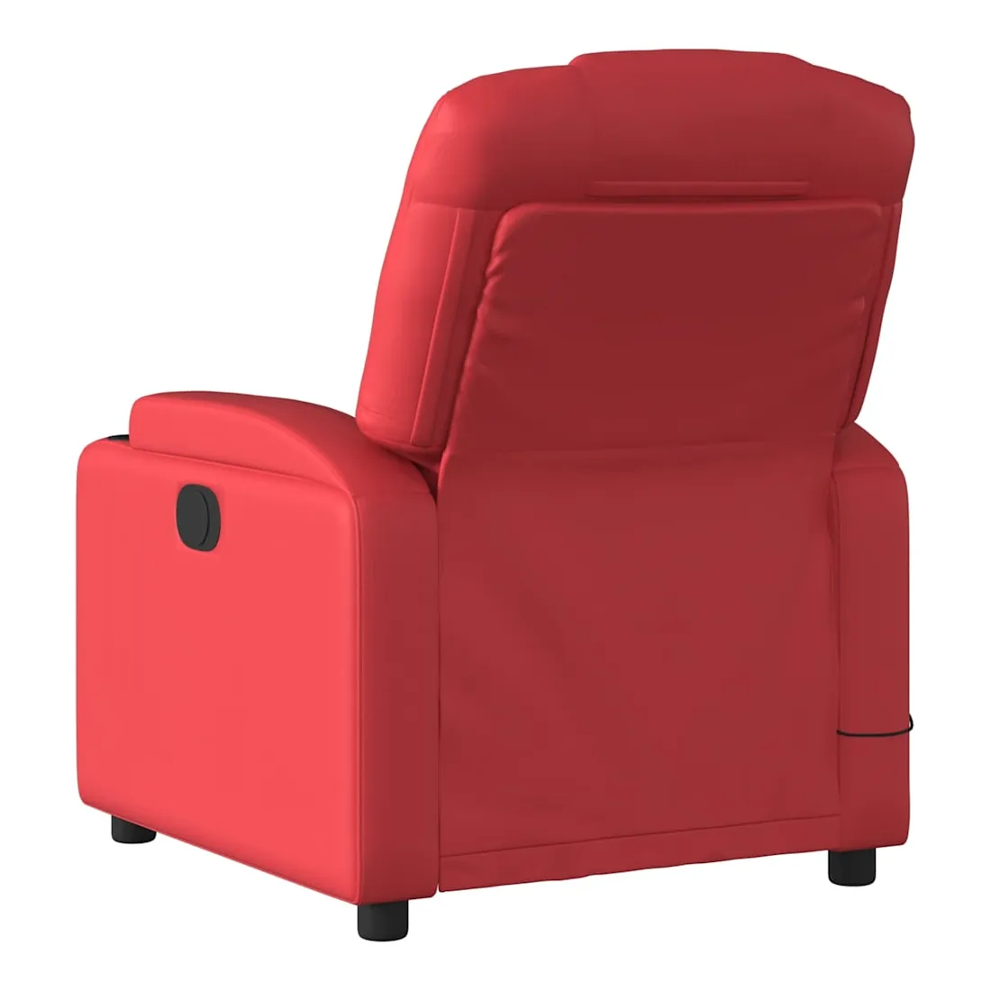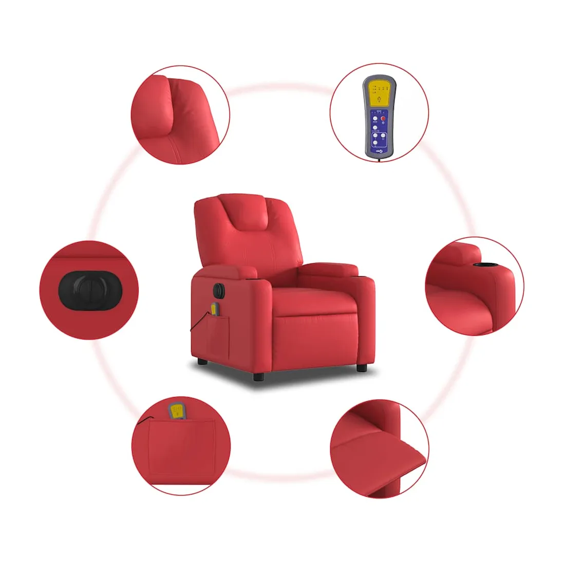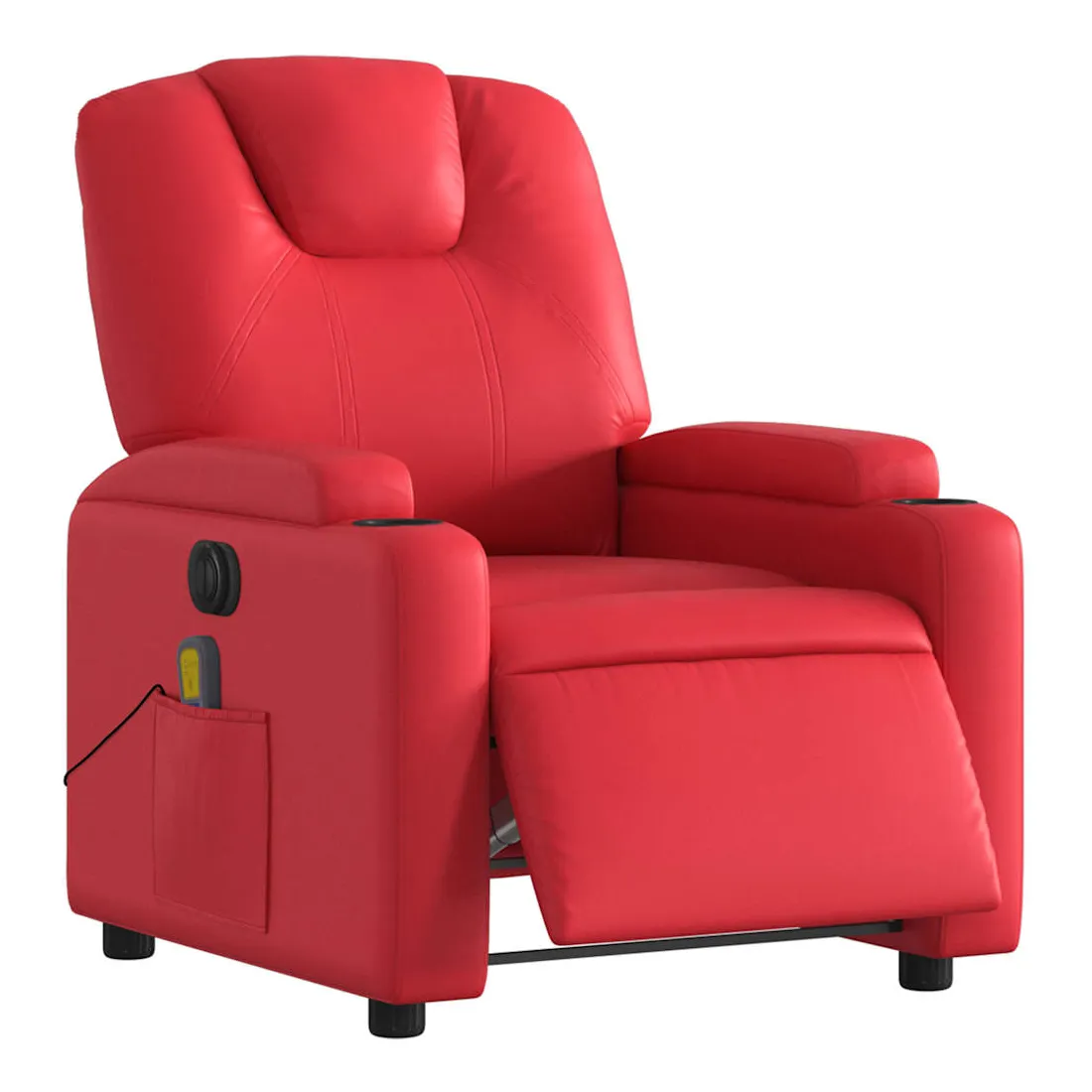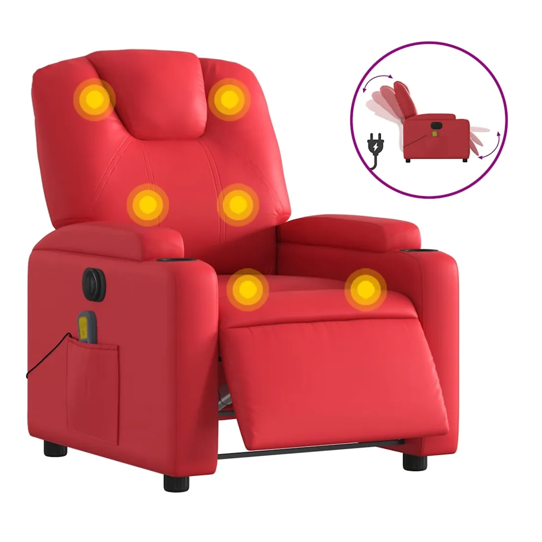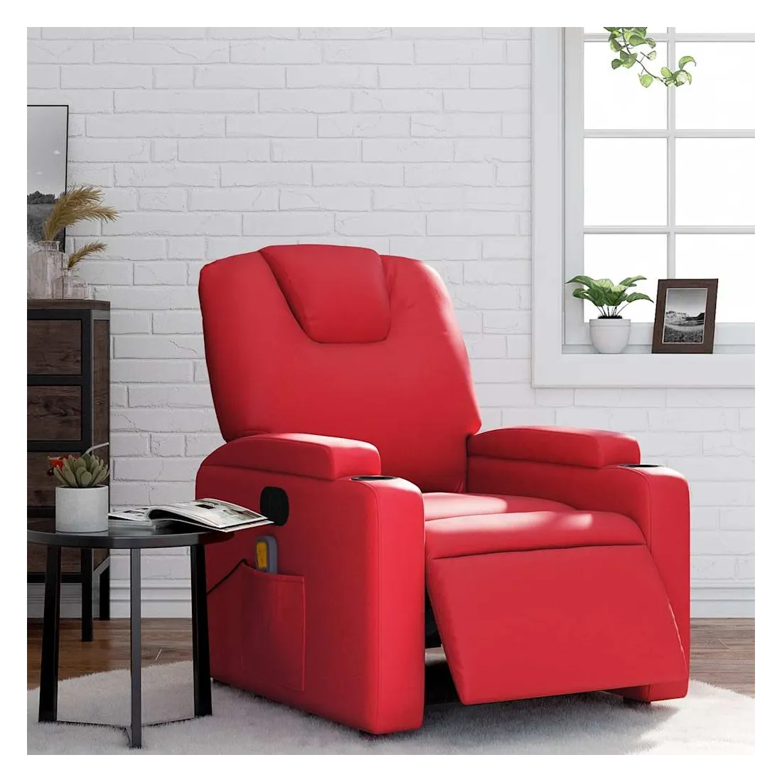 Asseyez-vous et détendez-vous dans ce fauteuil inclinable de massage électrique très confortable ! Fonction d'inclinaison électrique : ce fauteuil inclinable est équipé d'un moteur électrique qui permet de régler automatiquement le repose-pied et le dossier dans n'importe quelle position, selon votre confort, en appuyant simplement sur le bouton situé sur le côté du fauteuil. Cette fonction permet une inclinaison maximale de 135 degrés. En outre, le dossier peut revenir automatiquement à sa position d'origine par une simple pression sur le bouton.Fonction de vibration : les 6 points de massage vous permettent de faire l'expérience d'un massage mieux ciblé. De plus, la télécommande incluse vous permet de choisir différents programmes de massage. La fonction de massage est alimentée par le connecteur USB qui nécessite une source d'alimentation USB certifiée de 5 V (non fournie).Expérience de siège confortable : le siège, le dossier et les larges accoudoirs rembourrés épais recouverts de similicuir procurent une sensation confortable, vous faisant vous sentir enlacé lorsque vous êtes assis. Le similicuir est un matériau très résistant. Il est résistant aux taches, ce qui le rend facile à nettoyer avec un chiffon humide. La surface lisse donne également un aspect luxueux et la beauté du cuir véritable.Porte-gobelets et poche latérale pratiques : ce fauteuil dispose de deux porte-gobelets pratiques pour vos boissons et d'une poche latérale pour votre télécommande ou pour garder vos objets essentiels à portée de main.Cadre solide et stable : le cadre en bois et en métal offre une structure solide et une grande stabilité. Ce fauteuil inclinable est confortable et durable.