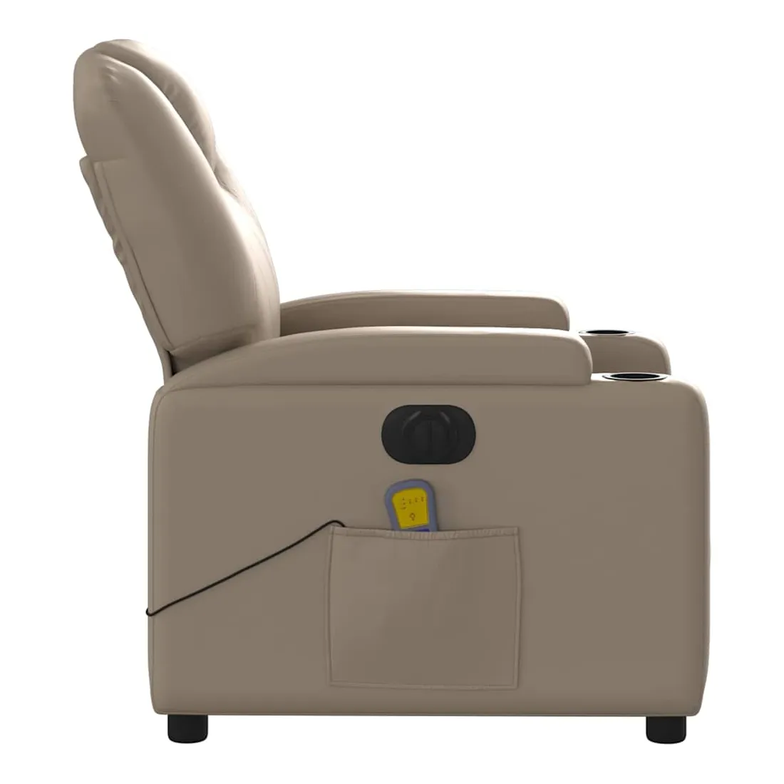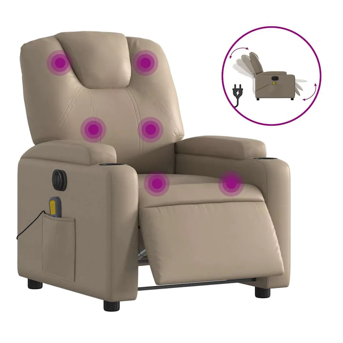 Asseyez-vous et détendez-vous dans ce fauteuil inclinable de massage électrique très confortable ! Fonction d'inclinaison électrique : ce fauteuil inclinable est équipé d'un moteur électrique qui permet de régler automatiquement le repose-pied et le dossier dans n'importe quelle position, selon votre confort, en appuyant simplement sur le bouton situé sur le côté du fauteuil. Cette fonction permet une inclinaison maximale de 135 degrés. En outre, le dossier peut revenir automatiquement à sa position d'origine par une simple pression sur le bouton.Fonction de vibration : les 6 points de massage vous permettent de faire l'expérience d'un massage mieux ciblé. De plus, la télécommande incluse vous permet de choisir différents programmes de massage. La fonction de massage est alimentée par le connecteur USB qui nécessite une source d'alimentation USB certifiée de 5 V (non fournie).Expérience de siège confortable : le siège, le dossier et les larges accoudoirs rembourrés épais recouverts de similicuir procurent une sensation confortable, vous faisant vous sentir enlacé lorsque vous êtes assis. Le similicuir est un matériau très résistant. Il est résistant aux taches, ce qui le rend facile à nettoyer avec un chiffon humide. La surface lisse donne également un aspect luxueux et la beauté du cuir véritable.Porte-gobelets et poche latérale pratiques : ce fauteuil dispose de deux porte-gobelets pratiques pour vos boissons et d'une poche latérale pour votre télécommande ou pour garder vos objets essentiels à portée de main.Cadre solide et stable : le cadre en bois et en métal offre une structure solide et une grande stabilité. Ce fauteuil inclinable est confortable et durable.
