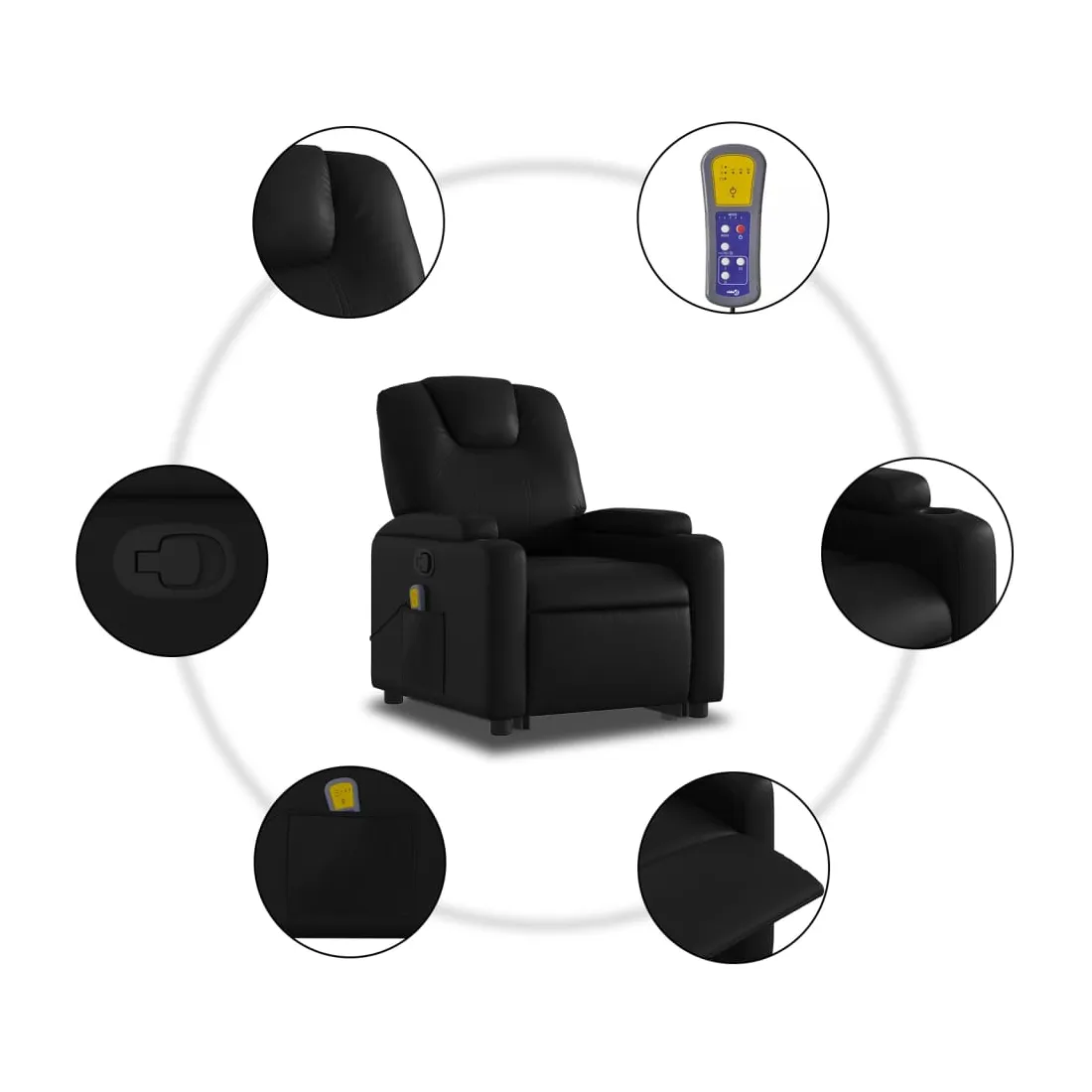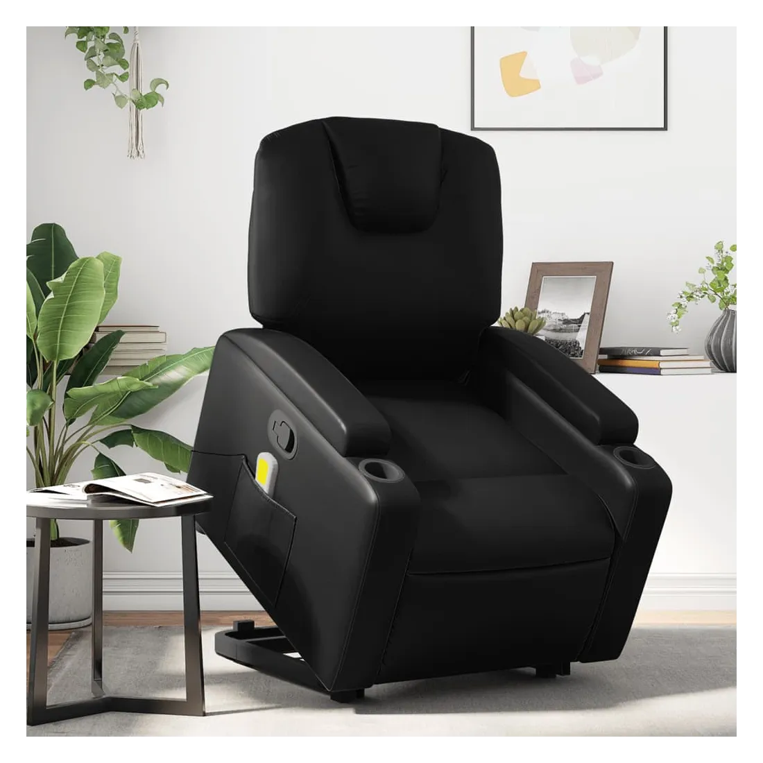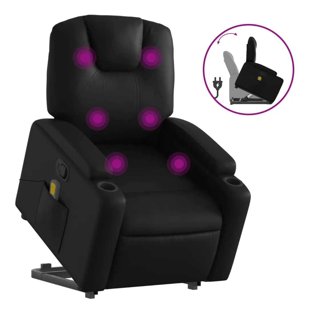 Asseyez-vous et détendez-vous dans ce fauteuil inclinable de massage très confortable ! Fonction de levage électrique : ce fauteuil inclinable pour personnes âgées est équipé d'un moteur électrique pour la fonction de levage. Grâce à la fonction qui pousse toute la chaise vers le haut, vous pouvez facilement vous tenir debout sans stresser votre dos et vos genoux en appuyant simplement sur le bouton.Fonction d'inclinaison manuelle : ce fauteuil inclinable est doté d'une poignée du côté droit. Vous pouvez régler manuellement le repose-pieds et le dossier dans n'importe quelle position selon votre confort en tirant simplement sur la poignée. Cette fonction permet une inclinaison maximale de 135 degrés. De plus, le dossier peut revenir rapidement à sa position d'origine en tirant simplement sur la poignée.Fonction de vibration : les 6 points de massage vous permettent de faire l'expérience d'un massage mieux ciblé. De plus, la télécommande incluse vous permet de choisir différents programmes de massage. La fonction de massage est alimentée par le connecteur USB qui nécessite une source d'alimentation USB certifiée de 5 V (non fournie).Expérience de siège confortable : le siège, le dossier et les larges accoudoirs rembourrés épais recouverts de similicuir procurent une sensation confortable, vous faisant vous sentir enlacé lorsque vous êtes assis. Le similicuir est un matériau très résistant. Il est résistant aux taches, ce qui le rend facile à nettoyer avec un chiffon humide. La surface lisse donne également un aspect luxueux et la beauté du cuir véritable.Porte-gobelets et poche latérale pratiques : ce fauteuil dispose de deux porte-gobelets pratiques pour vos boissons et d'une poche latérale pour votre télécommande ou pour garder vos objets essentiels à portée de main.Cadre solide et stable : le cadre en bois et en métal offre une structure solide et une grande stabilité. Ce fauteuil inclinable est confortable et durable.