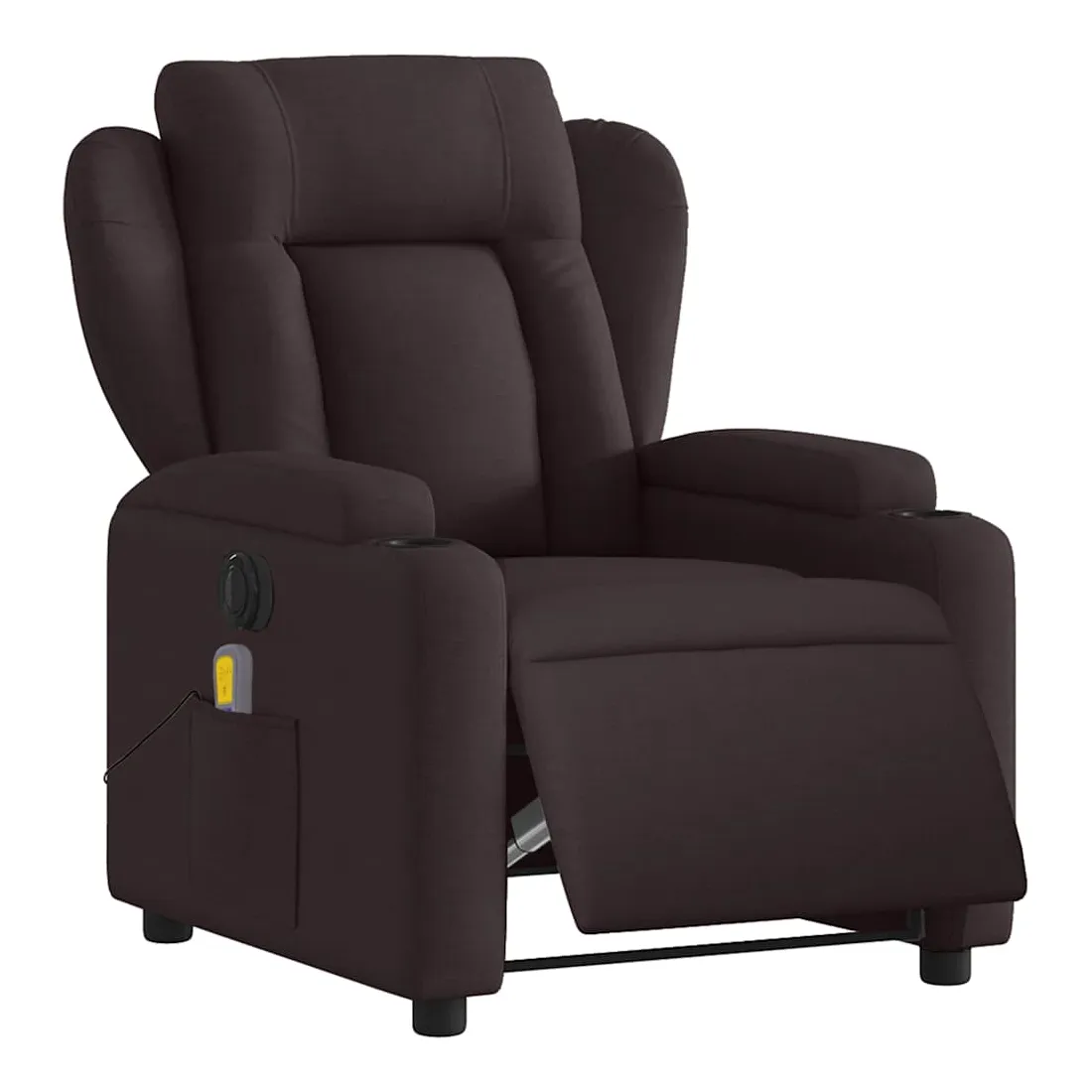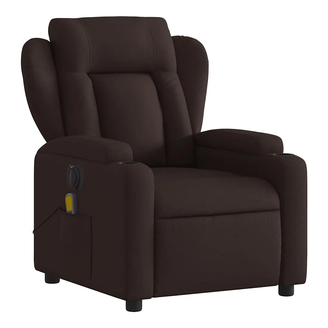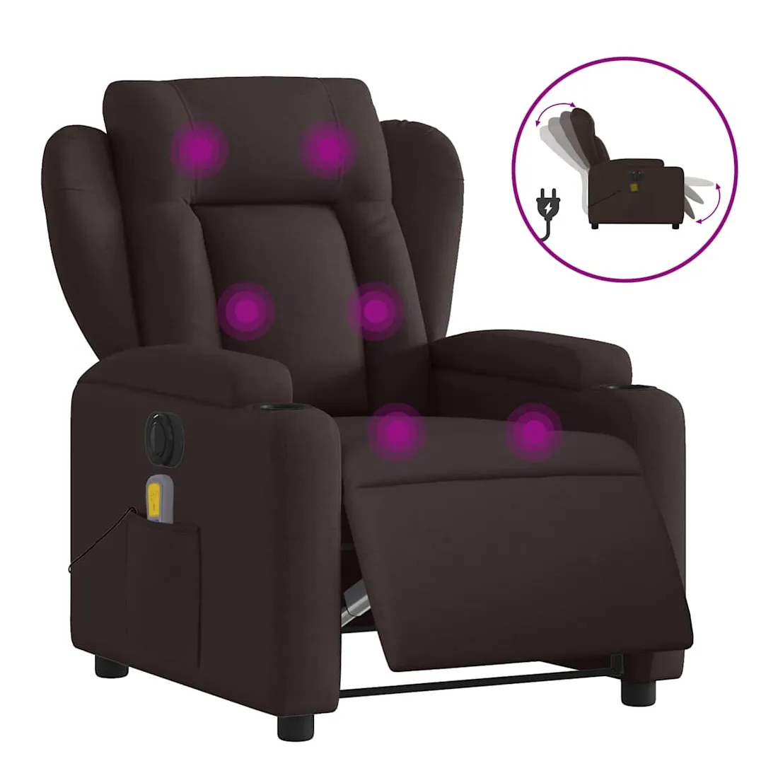 Asseyez-vous et détendez-vous dans ce fauteuil inclinable de massage électrique très confortable ! Fonction d'inclinaison électrique : ce fauteuil inclinable est équipé d'un moteur électrique qui permet de régler automatiquement le repose-pied et le dossier dans n'importe quelle position, selon votre confort, en appuyant simplement sur le bouton situé sur le côté du fauteuil. Cette fonction permet une inclinaison maximale de 135 degrés. En outre, le dossier peut revenir automatiquement à sa position d'origine par une simple pression sur le bouton.Fonction de vibration : les 6 points de massage vous permettent de faire l'expérience d'un massage mieux ciblé. De plus, la télécommande incluse vous permet de choisir différents programmes de massage. La fonction de massage est alimentée par le connecteur USB qui nécessite une source d'alimentation USB certifiée de 5 V (non fournie).Expérience d'assise confortable : le siège, le dossier et les larges accoudoirs bien rembourrés recouverts de tissu procurent une sensation confortable et chaleureuse, vous permettant de vous sentir enveloppé lorsque vous êtes assis. Le tissu présente un aspect simple et épuré et est respirant et durable.Porte-gobelets et poche latérale pratiques : ce fauteuil dispose de deux porte-gobelets pratiques pour vos boissons et d'une poche latérale pour votre télécommande ou pour garder vos objets essentiels à portée de main.Cadre solide et stable : le cadre en bois et en métal offre une structure solide et une grande stabilité. Ce fauteuil inclinable est confortable et durable.