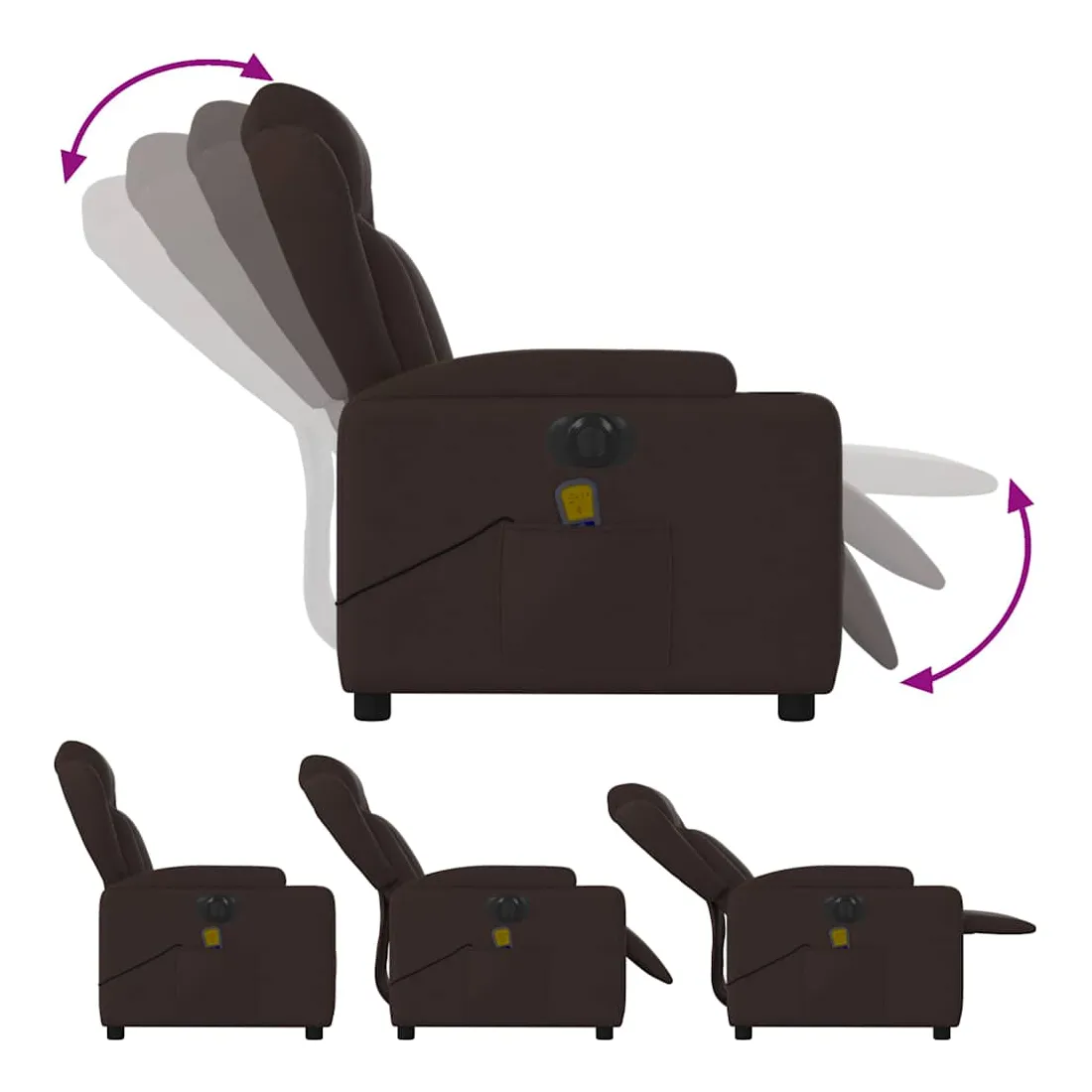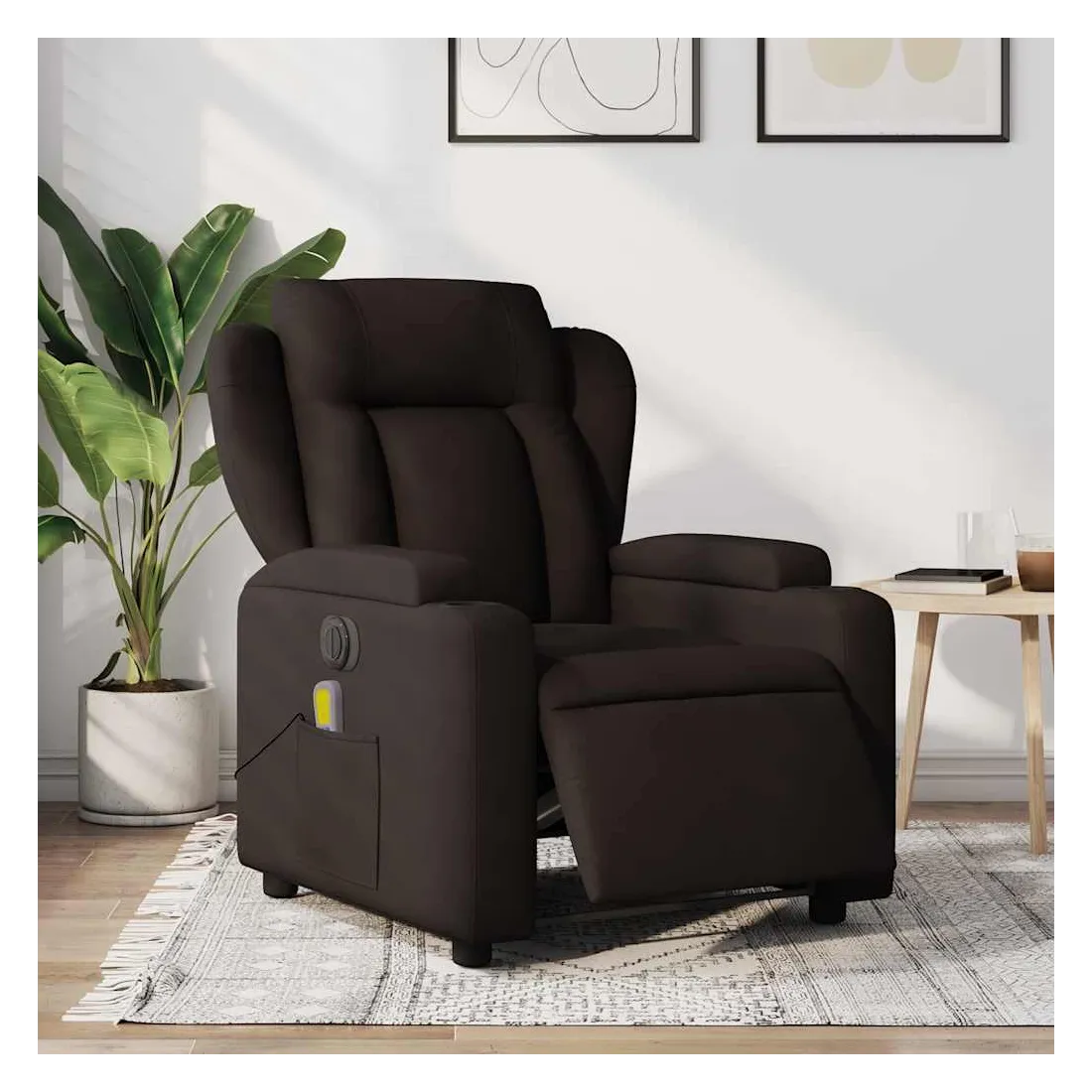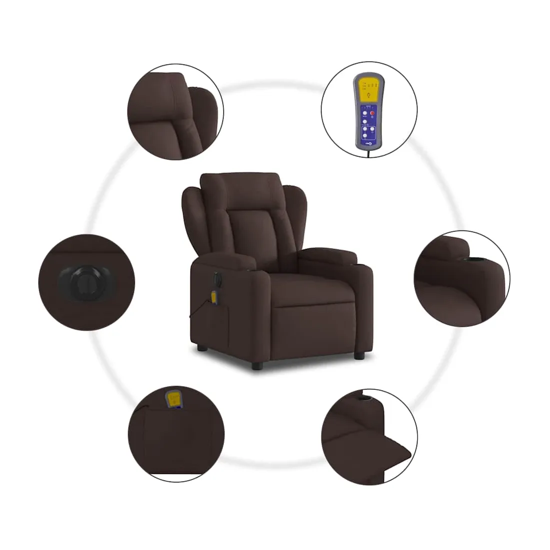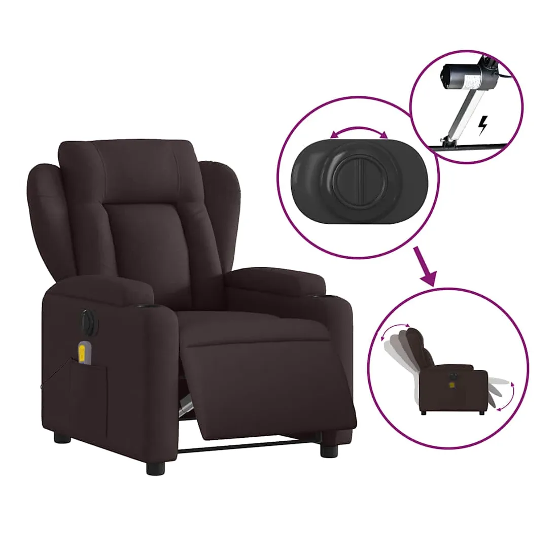 Asseyez-vous et détendez-vous dans ce fauteuil inclinable de massage électrique très confortable ! Fonction d'inclinaison électrique : ce fauteuil inclinable est équipé d'un moteur électrique qui permet de régler automatiquement le repose-pied et le dossier dans n'importe quelle position, selon votre confort, en appuyant simplement sur le bouton situé sur le côté du fauteuil. Cette fonction permet une inclinaison maximale de 135 degrés. En outre, le dossier peut revenir automatiquement à sa position d'origine par une simple pression sur le bouton.Fonction de vibration : les 6 points de massage vous permettent de faire l'expérience d'un massage mieux ciblé. De plus, la télécommande incluse vous permet de choisir différents programmes de massage. La fonction de massage est alimentée par le connecteur USB qui nécessite une source d'alimentation USB certifiée de 5 V (non fournie).Expérience d'assise confortable : le siège, le dossier et les larges accoudoirs bien rembourrés recouverts de tissu procurent une sensation confortable et chaleureuse, vous permettant de vous sentir enveloppé lorsque vous êtes assis. Le tissu présente un aspect simple et épuré et est respirant et durable.Porte-gobelets et poche latérale pratiques : ce fauteuil dispose de deux porte-gobelets pratiques pour vos boissons et d'une poche latérale pour votre télécommande ou pour garder vos objets essentiels à portée de main.Cadre solide et stable : le cadre en bois et en métal offre une structure solide et une grande stabilité. Ce fauteuil inclinable est confortable et durable.