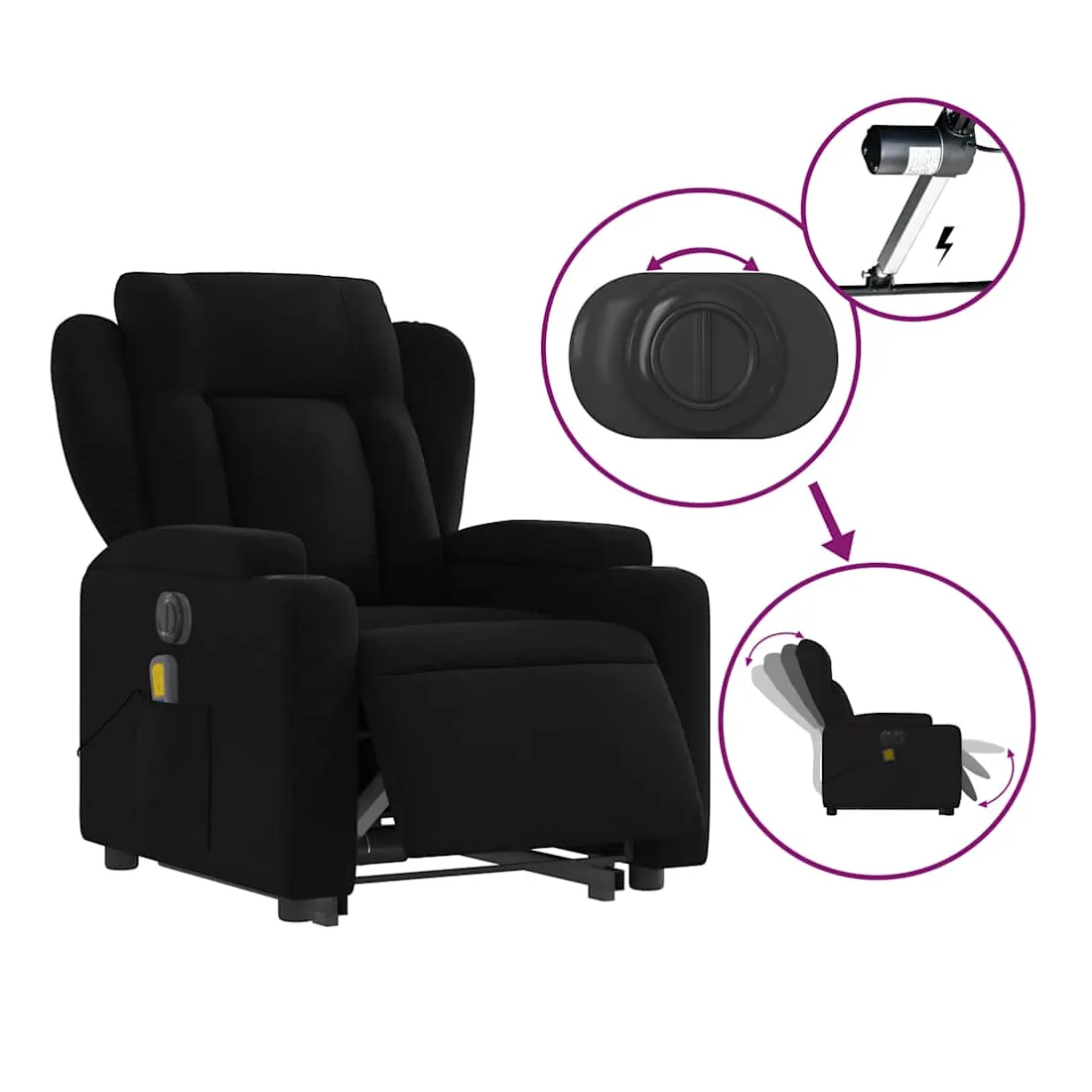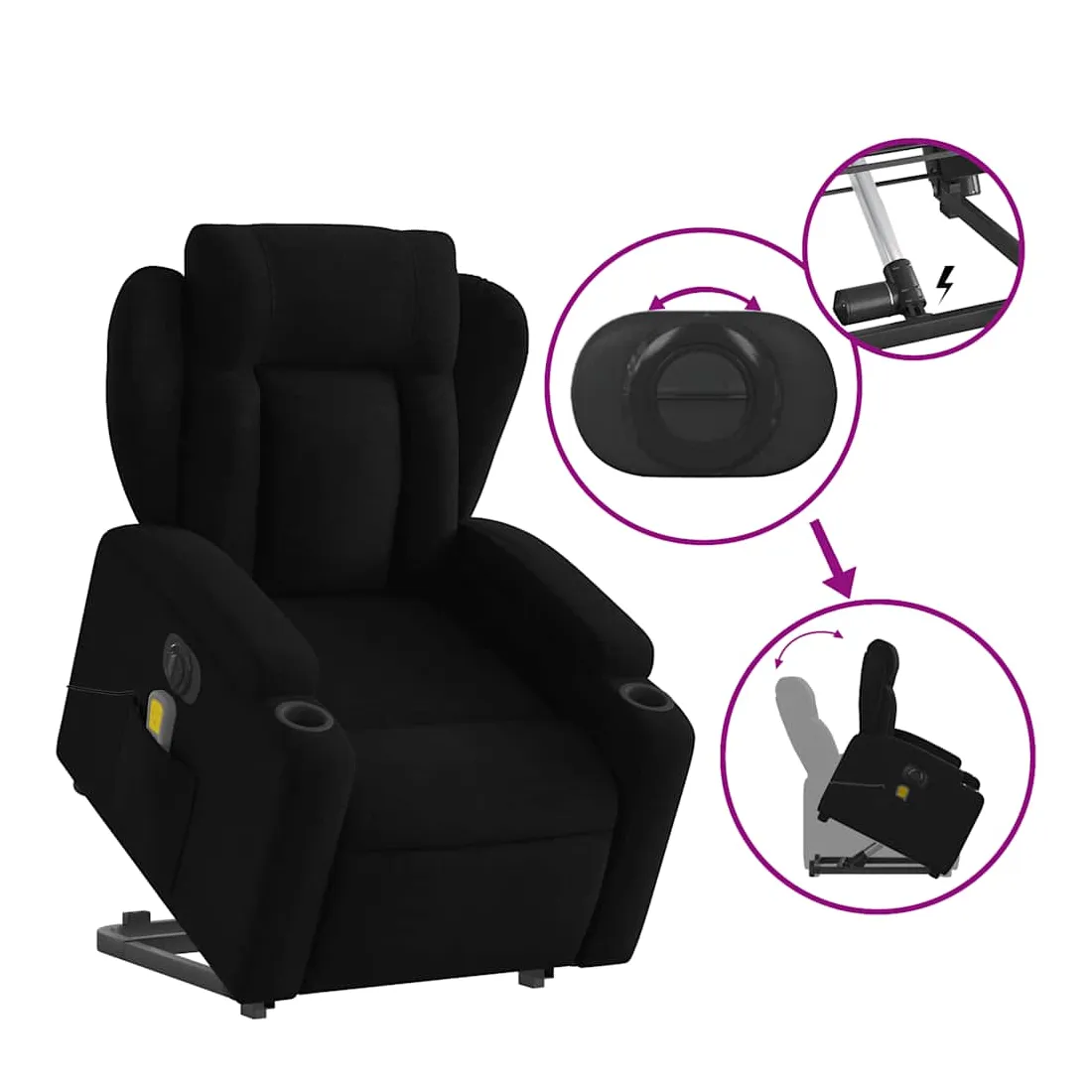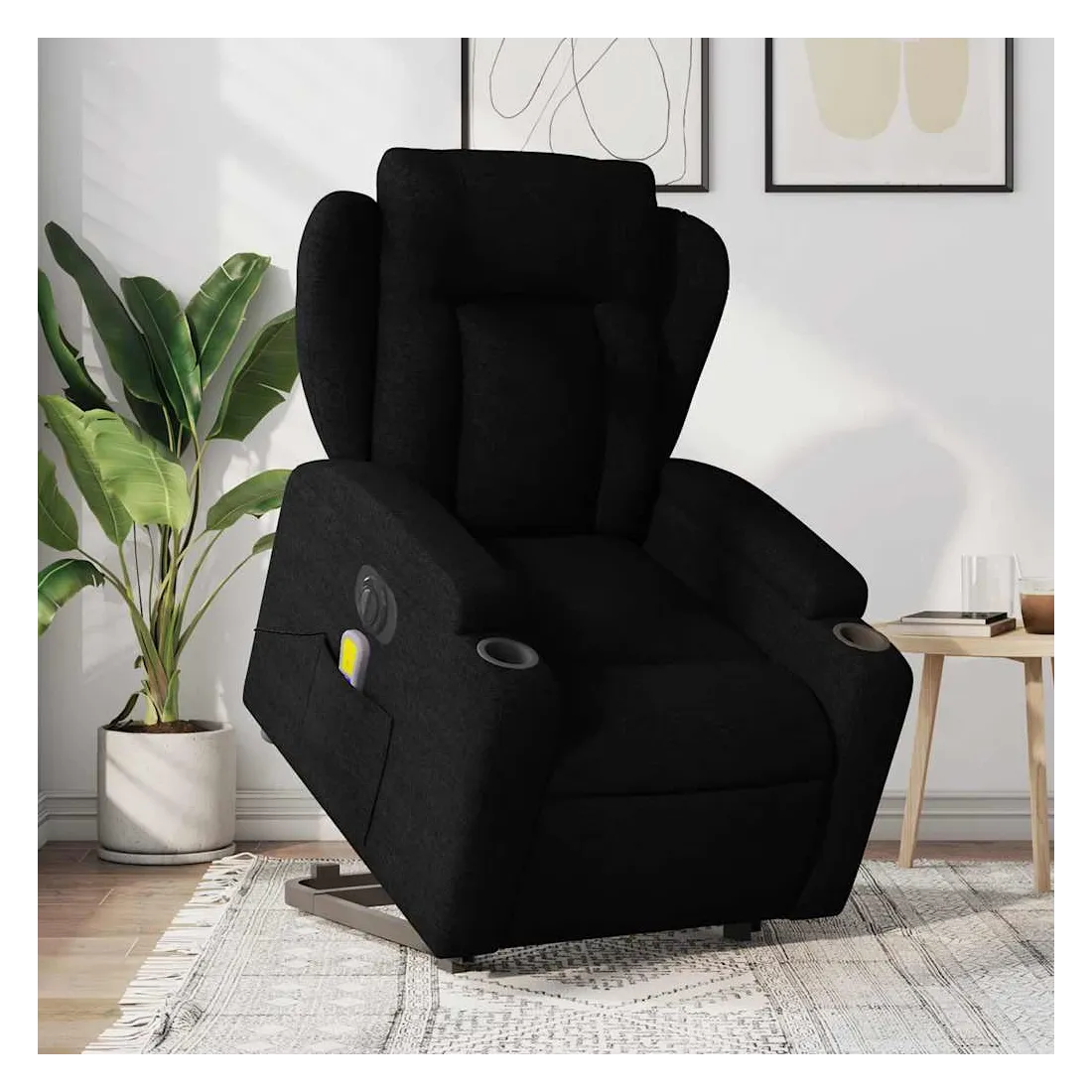 Asseyez-vous et détendez-vous dans ce fauteuil inclinable de massage électrique très confortable ! Fonction de levage électrique : ce fauteuil inclinable pour personnes âgées est équipé d'un moteur électrique pour la fonction de levage. Grâce à la fonction qui pousse toute la chaise vers le haut, vous pouvez facilement vous tenir debout sans stresser votre dos et vos genoux en appuyant simplement sur le bouton.Fonction d'inclinaison électrique : ce fauteuil inclinable est également équipé d'un moteur électrique qui permet de régler automatiquement le repose-pied et le dossier dans n'importe quelle position, selon votre confort, en appuyant simplement sur le bouton situé sur le côté du fauteuil. Cette fonction permet une inclinaison maximale de 135 degrés. En outre, le dossier peut revenir automatiquement à sa position d'origine par une simple pression sur le bouton.Fonction de vibration : les 6 points de massage vous permettent de faire l'expérience d'un massage mieux ciblé. De plus, la télécommande incluse vous permet de choisir différents programmes de massage. La fonction de massage est alimentée par le connecteur USB qui nécessite une source d'alimentation USB certifiée de 5 V (non fournie).Expérience d'assise confortable : le siège, le dossier et les larges accoudoirs bien rembourrés recouverts de tissu procurent une sensation confortable et chaleureuse, vous permettant de vous sentir enveloppé lorsque vous êtes assis. Le tissu présente un aspect simple et épuré et est respirant et durable.Porte-gobelets et poche latérale pratiques : ce fauteuil dispose de deux porte-gobelets pratiques pour vos boissons et d'une poche latérale pour garder vos objets essentiels à portée de main.Cadre solide et stable : le cadre en bois et en métal offre une structure solide et une grande stabilité. Ce fauteuil inclinable est confortable et durable.
