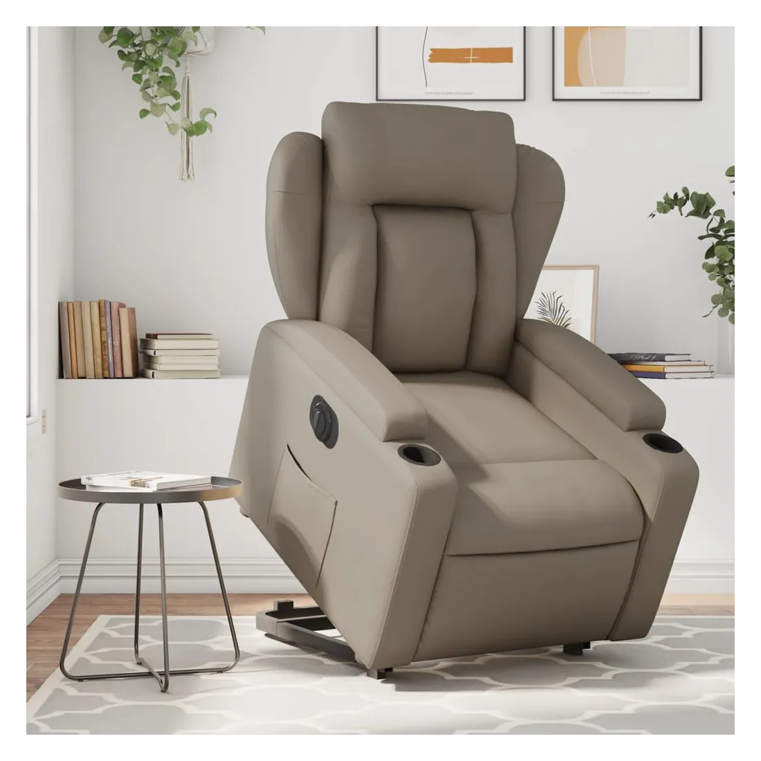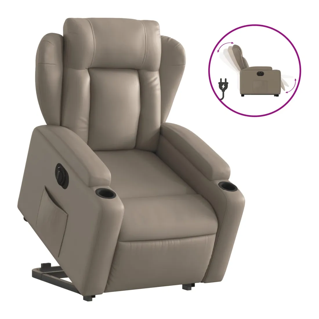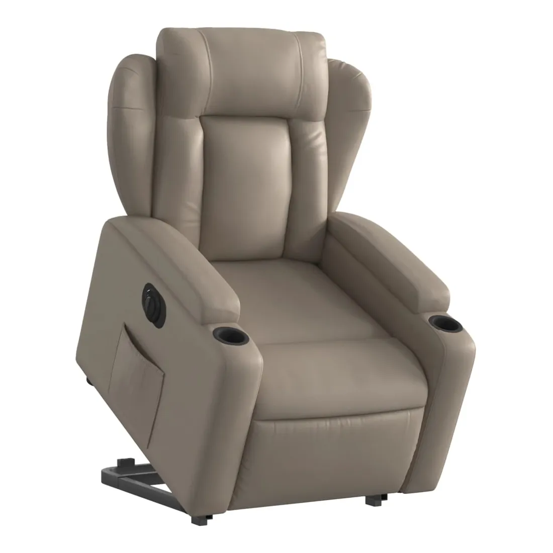 Asseyez-vous et détendez-vous dans ce fauteuil inclinable électrique très confortable ! Fonction de levage électrique : ce fauteuil inclinable pour personnes âgées est équipé d'un moteur électrique pour la fonction de levage. Grâce à la fonction qui pousse toute la chaise vers le haut, vous pouvez facilement vous tenir debout sans stresser votre dos et vos genoux en appuyant simplement sur le bouton.Fonction d'inclinaison électrique : ce fauteuil inclinable est également équipé d'un moteur électrique qui permet de régler automatiquement le repose-pied et le dossier dans n'importe quelle position, selon votre confort, en appuyant simplement sur le bouton situé sur le côté du fauteuil. Cette fonction permet une inclinaison maximale de 135 degrés. En outre, le dossier peut revenir automatiquement à sa position d'origine par une simple pression sur le bouton.Expérience de siège confortable : le siège, le dossier et les larges accoudoirs rembourrés épais recouverts de similicuir procurent une sensation confortable, vous faisant vous sentir enlacé lorsque vous êtes assis. Le similicuir est un matériau très résistant. Il est résistant aux taches, ce qui le rend facile à nettoyer avec un chiffon humide. La surface lisse donne également un aspect luxueux et la beauté du cuir véritable.Porte-gobelets et poche latérale pratiques : ce fauteuil dispose de deux porte-gobelets pratiques pour vos boissons et d'une poche latérale pour garder vos objets essentiels à portée de main.Cadre solide et stable : le cadre en bois et en métal offre une structure solide et une grande stabilité. Ce fauteuil inclinable est confortable et durable.