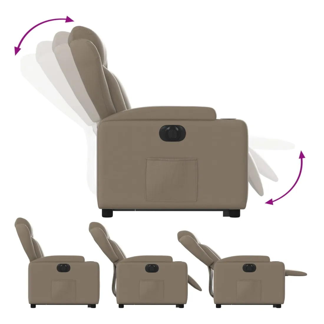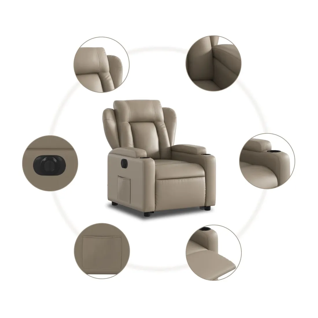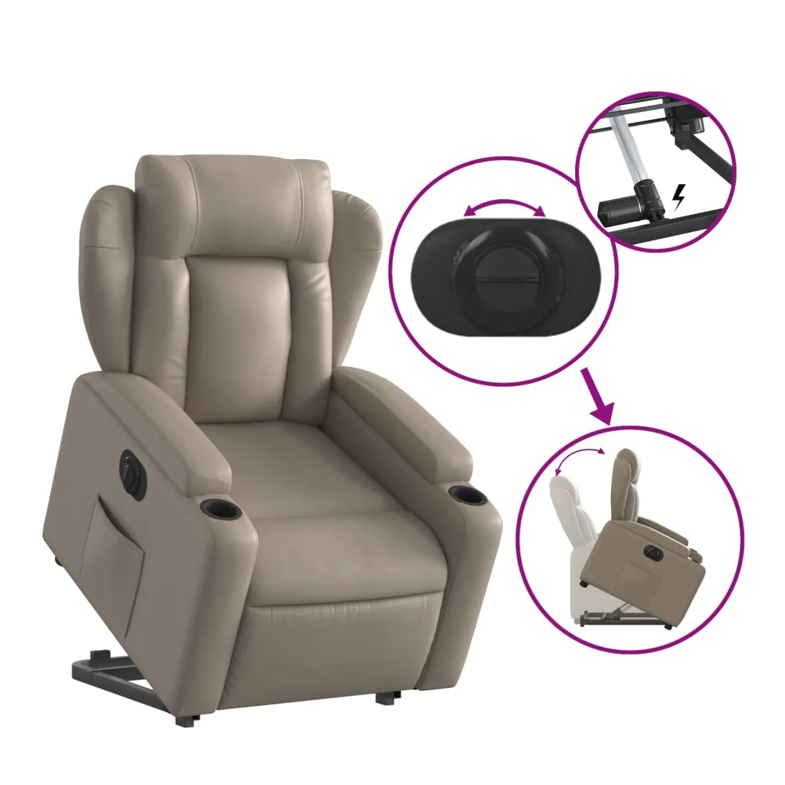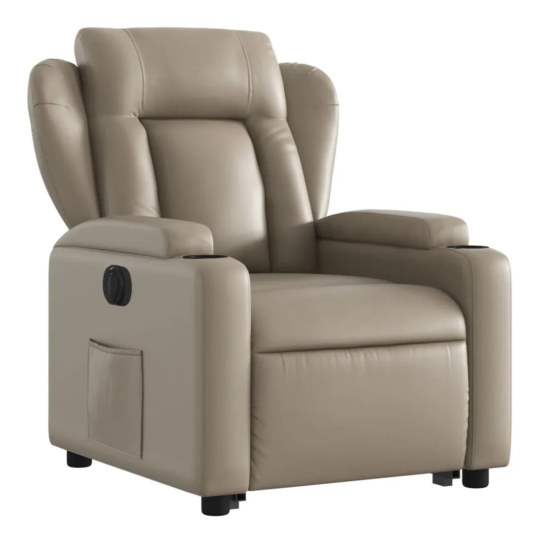 Asseyez-vous et détendez-vous dans ce fauteuil inclinable électrique très confortable ! Fonction de levage électrique : ce fauteuil inclinable pour personnes âgées est équipé d'un moteur électrique pour la fonction de levage. Grâce à la fonction qui pousse toute la chaise vers le haut, vous pouvez facilement vous tenir debout sans stresser votre dos et vos genoux en appuyant simplement sur le bouton.Fonction d'inclinaison électrique : ce fauteuil inclinable est également équipé d'un moteur électrique qui permet de régler automatiquement le repose-pied et le dossier dans n'importe quelle position, selon votre confort, en appuyant simplement sur le bouton situé sur le côté du fauteuil. Cette fonction permet une inclinaison maximale de 135 degrés. En outre, le dossier peut revenir automatiquement à sa position d'origine par une simple pression sur le bouton.Expérience de siège confortable : le siège, le dossier et les larges accoudoirs rembourrés épais recouverts de similicuir procurent une sensation confortable, vous faisant vous sentir enlacé lorsque vous êtes assis. Le similicuir est un matériau très résistant. Il est résistant aux taches, ce qui le rend facile à nettoyer avec un chiffon humide. La surface lisse donne également un aspect luxueux et la beauté du cuir véritable.Porte-gobelets et poche latérale pratiques : ce fauteuil dispose de deux porte-gobelets pratiques pour vos boissons et d'une poche latérale pour garder vos objets essentiels à portée de main.Cadre solide et stable : le cadre en bois et en métal offre une structure solide et une grande stabilité. Ce fauteuil inclinable est confortable et durable.