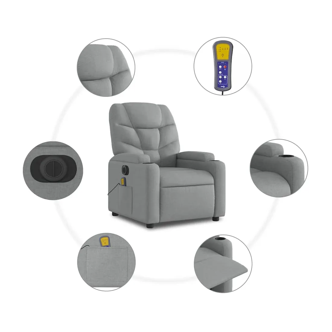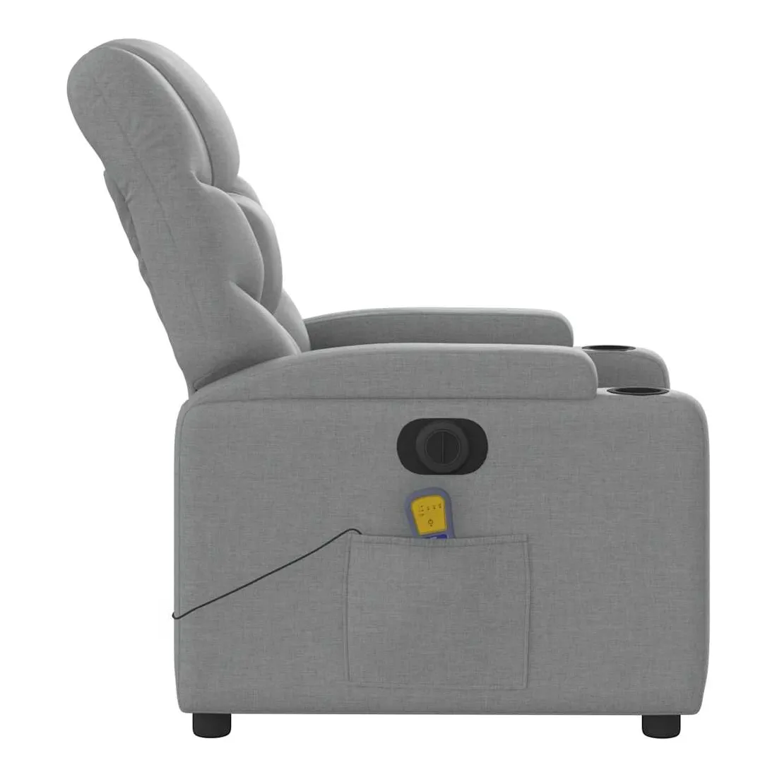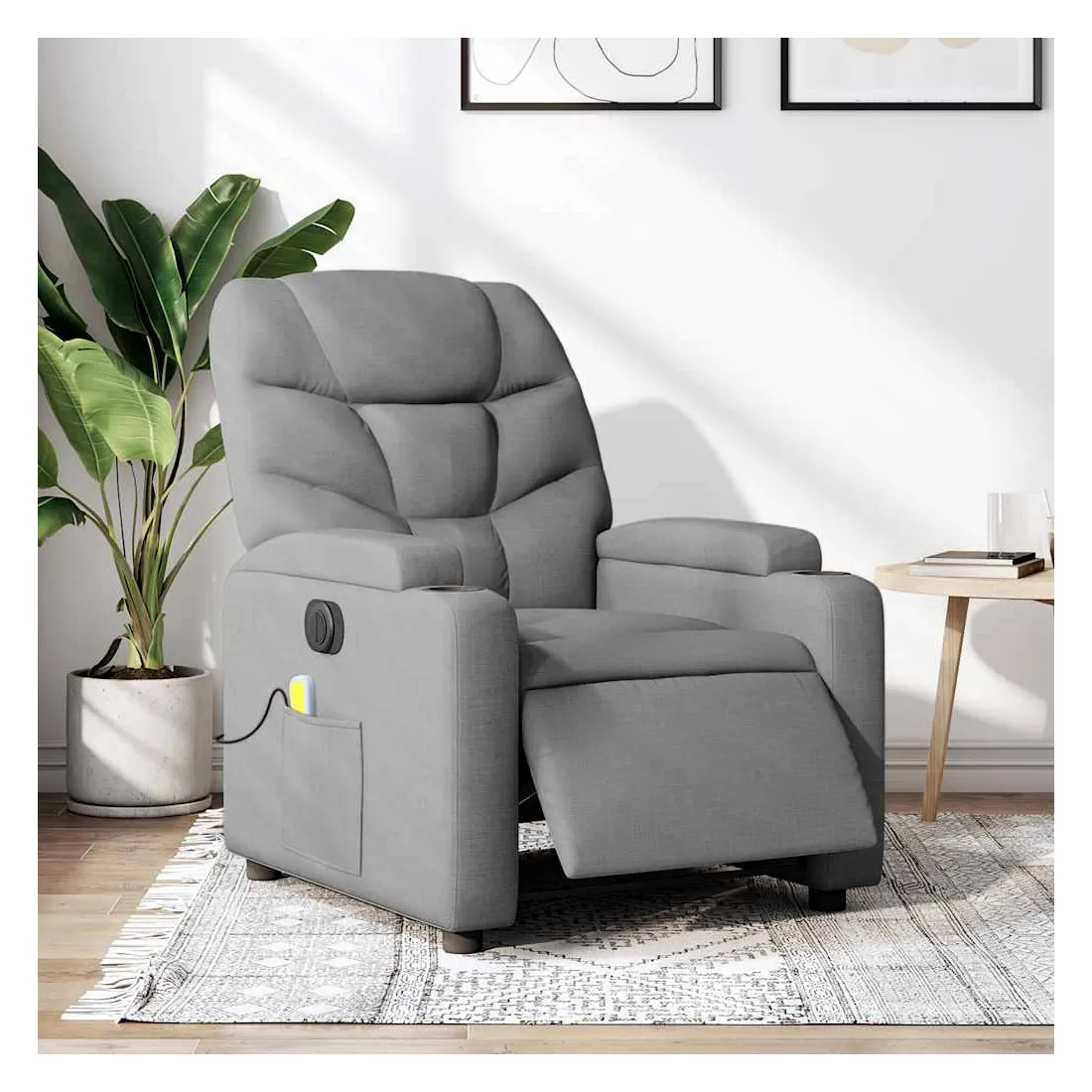Asseyez-vous et détendez-vous dans ce fauteuil inclinable de massage électrique très confortable ! Fonction d'inclinaison électrique : ce fauteuil inclinable est équipé d'un moteur électrique qui permet de régler automatiquement le repose-pied et le dossier dans n'importe quelle position, selon votre confort, en appuyant simplement sur le bouton situé sur le côté du fauteuil. Cette fonction permet une inclinaison maximale de 135 degrés. En outre, le dossier peut revenir automatiquement à sa position d'origine par une simple pression sur le bouton.Fonction de vibration : les 6 points de massage vous permettent de faire l'expérience d'un massage mieux ciblé. De plus, la télécommande incluse vous permet de choisir différents programmes de massage. La fonction de massage est alimentée par le connecteur USB qui nécessite une source d'alimentation USB certifiée de 5 V (non fournie).Expérience d'assise confortable : le siège, le dossier et les larges accoudoirs bien rembourrés recouverts de tissu procurent une sensation confortable et chaleureuse, vous permettant de vous sentir enveloppé lorsque vous êtes assis. Le tissu présente un aspect simple et épuré et est respirant et durable.Porte-gobelets et poche latérale pratiques : ce fauteuil dispose de deux porte-gobelets pratiques pour vos boissons et d'une poche latérale pour garder vos objets essentiels à portée de main.Cadre solide et stable : le cadre en bois et en métal offre une structure solide et une grande stabilité. Ce fauteuil inclinable est confortable et durable.