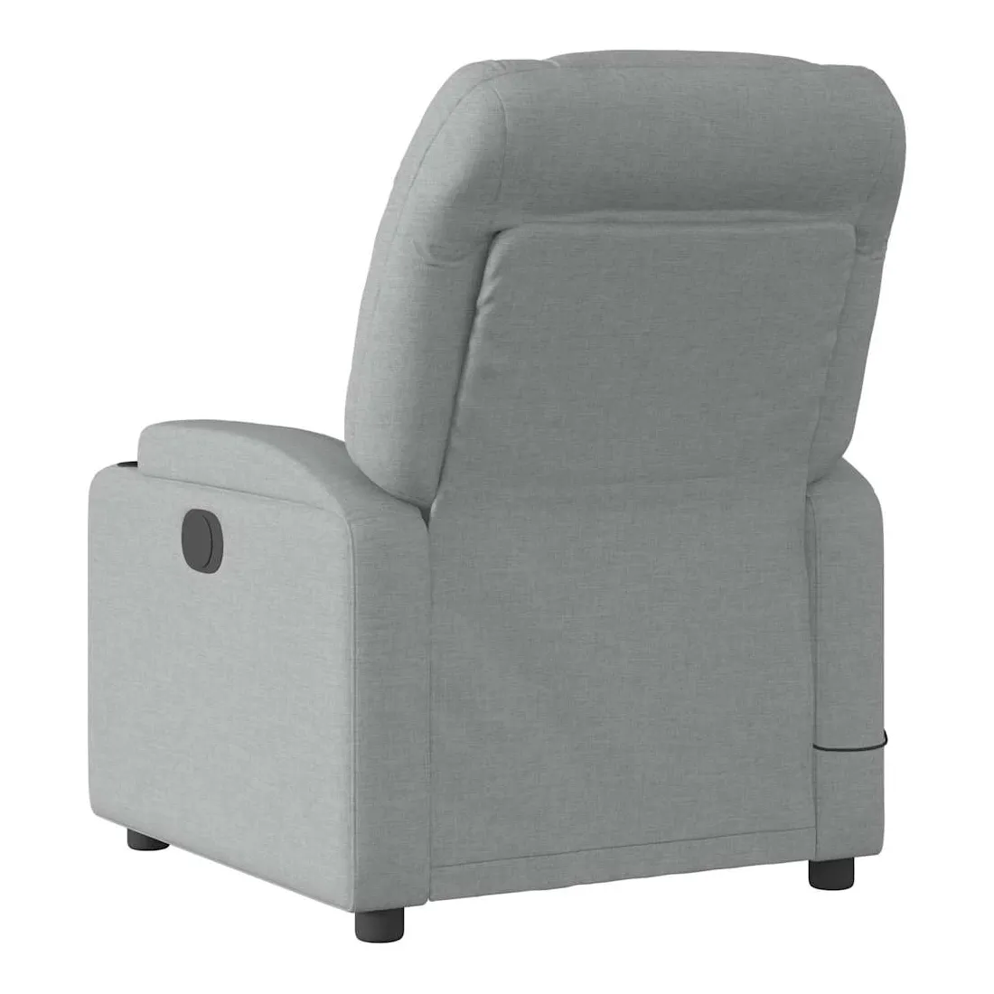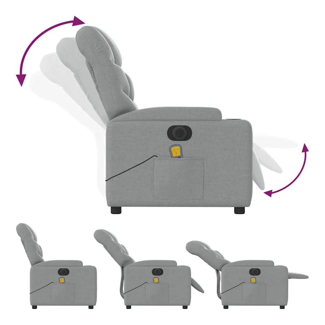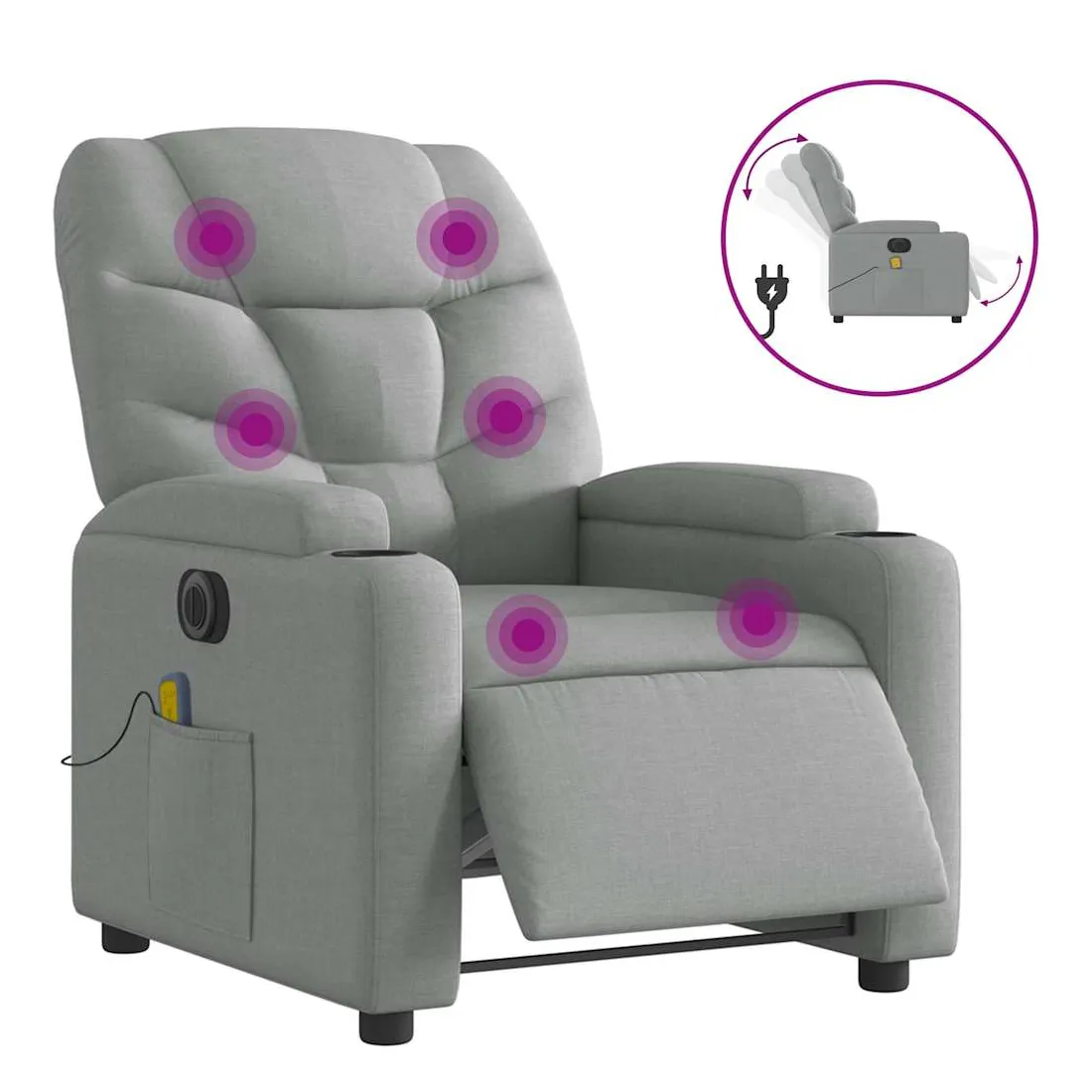 Asseyez-vous et détendez-vous dans ce fauteuil inclinable de massage électrique très confortable ! Fonction d'inclinaison électrique : ce fauteuil inclinable est équipé d'un moteur électrique qui permet de régler automatiquement le repose-pied et le dossier dans n'importe quelle position, selon votre confort, en appuyant simplement sur le bouton situé sur le côté du fauteuil. Cette fonction permet une inclinaison maximale de 135 degrés. En outre, le dossier peut revenir automatiquement à sa position d'origine par une simple pression sur le bouton.Fonction de vibration : les 6 points de massage vous permettent de faire l'expérience d'un massage mieux ciblé. De plus, la télécommande incluse vous permet de choisir différents programmes de massage. La fonction de massage est alimentée par le connecteur USB qui nécessite une source d'alimentation USB certifiée de 5 V (non fournie).Expérience d'assise confortable : le siège, le dossier et les larges accoudoirs bien rembourrés recouverts de tissu procurent une sensation confortable et chaleureuse, vous permettant de vous sentir enveloppé lorsque vous êtes assis. Le tissu présente un aspect simple et épuré et est respirant et durable.Porte-gobelets et poche latérale pratiques : ce fauteuil dispose de deux porte-gobelets pratiques pour vos boissons et d'une poche latérale pour garder vos objets essentiels à portée de main.Cadre solide et stable : le cadre en bois et en métal offre une structure solide et une grande stabilité. Ce fauteuil inclinable est confortable et durable.