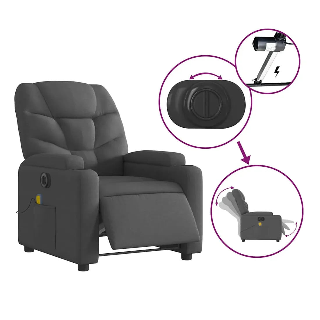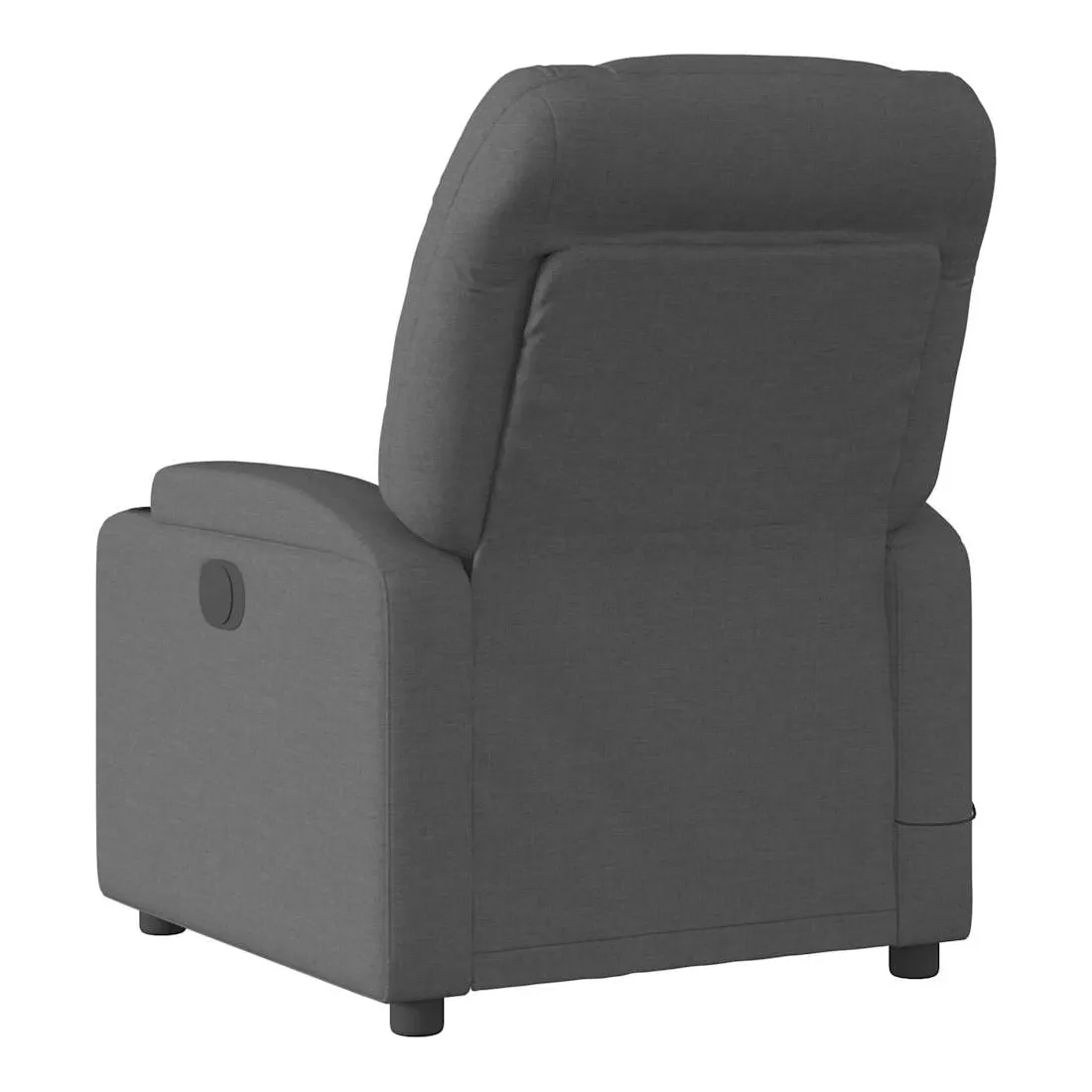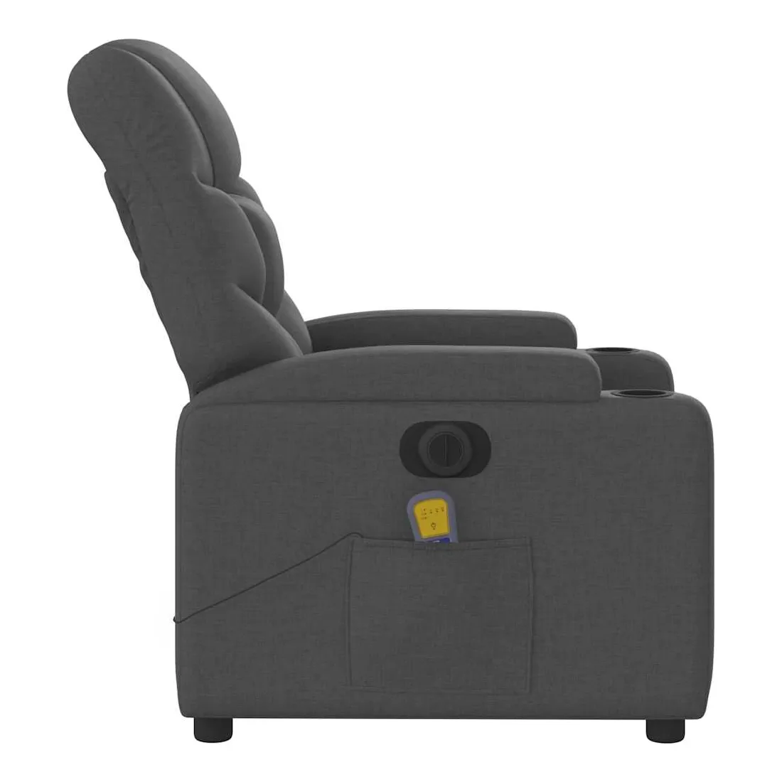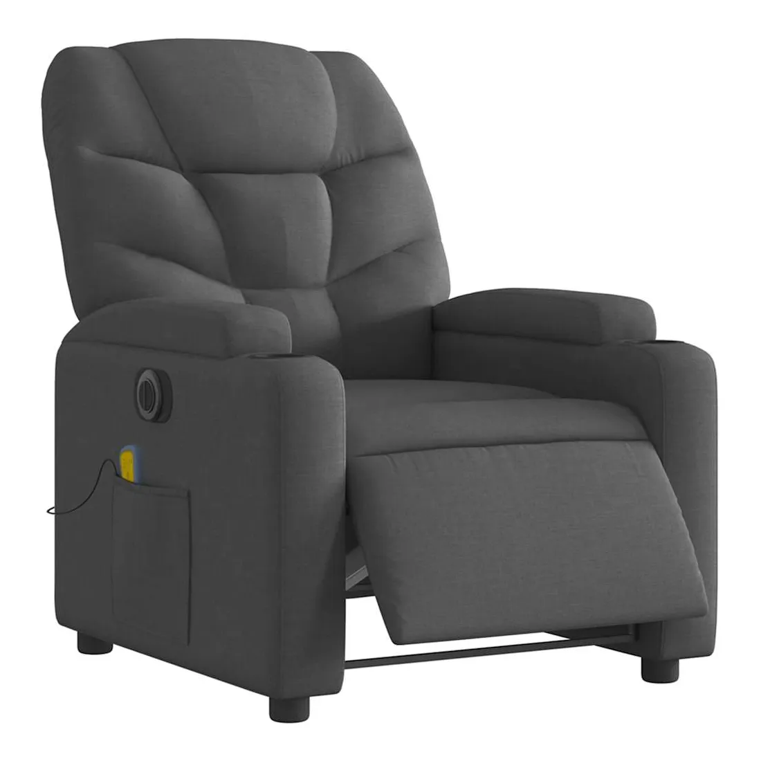 Asseyez-vous et détendez-vous dans ce fauteuil inclinable de massage électrique très confortable ! Fonction d'inclinaison électrique : ce fauteuil inclinable est équipé d'un moteur électrique qui permet de régler automatiquement le repose-pied et le dossier dans n'importe quelle position, selon votre confort, en appuyant simplement sur le bouton situé sur le côté du fauteuil. Cette fonction permet une inclinaison maximale de 135 degrés. En outre, le dossier peut revenir automatiquement à sa position d'origine par une simple pression sur le bouton.Fonction de vibration : les 6 points de massage vous permettent de faire l'expérience d'un massage mieux ciblé. De plus, la télécommande incluse vous permet de choisir différents programmes de massage. La fonction de massage est alimentée par le connecteur USB qui nécessite une source d'alimentation USB certifiée de 5 V (non fournie).Expérience d'assise confortable : le siège, le dossier et les larges accoudoirs bien rembourrés recouverts de tissu procurent une sensation confortable et chaleureuse, vous permettant de vous sentir enveloppé lorsque vous êtes assis. Le tissu présente un aspect simple et épuré et est respirant et durable.Porte-gobelets et poche latérale pratiques : ce fauteuil dispose de deux porte-gobelets pratiques pour vos boissons et d'une poche latérale pour garder vos objets essentiels à portée de main.Cadre solide et stable : le cadre en bois et en métal offre une structure solide et une grande stabilité. Ce fauteuil inclinable est confortable et durable.
