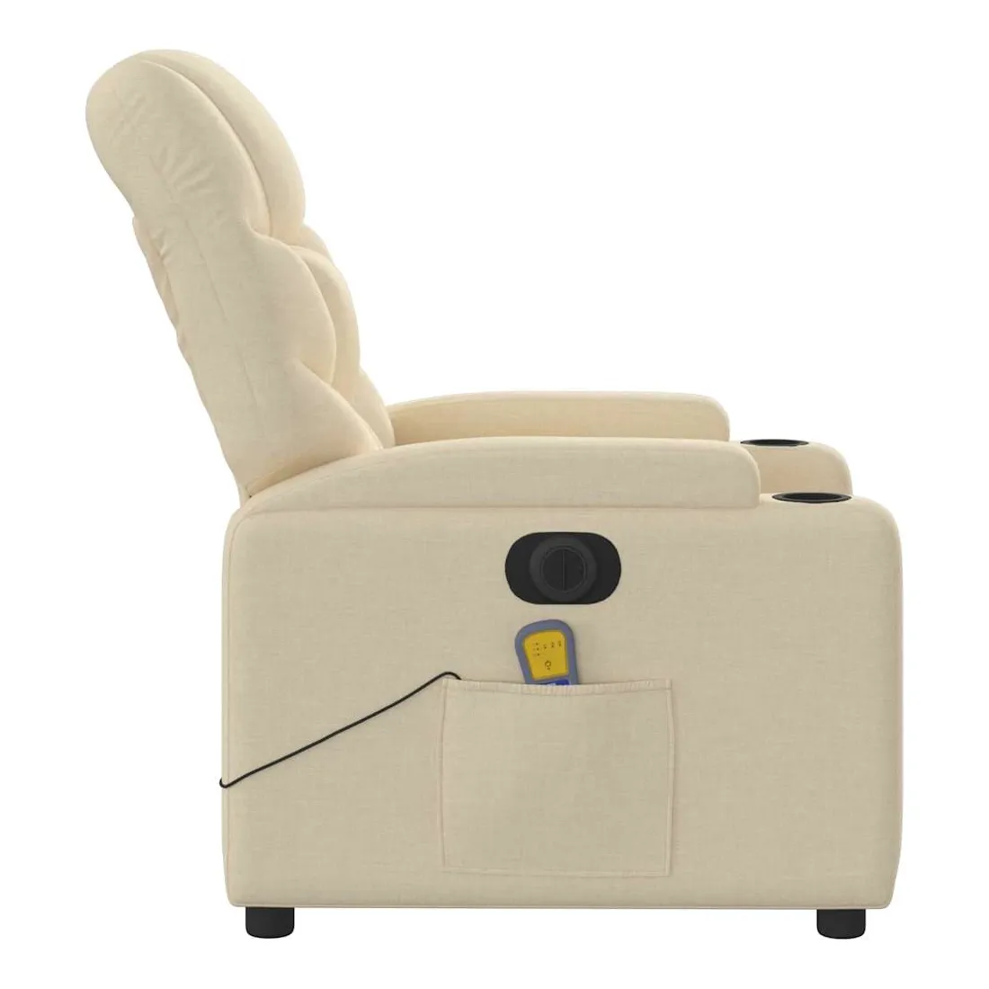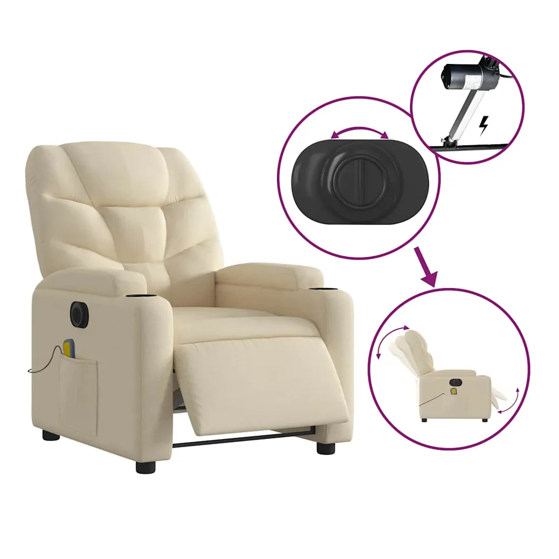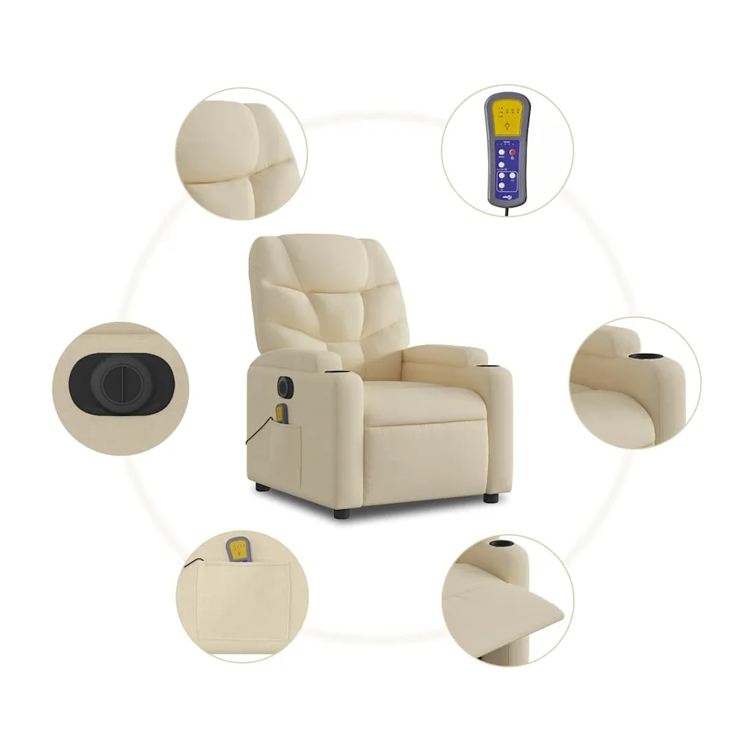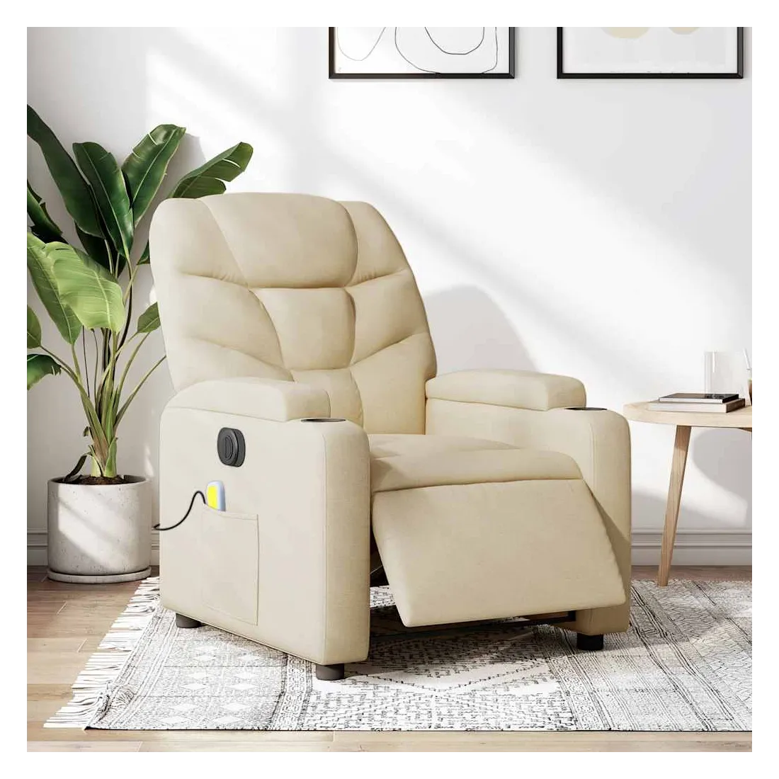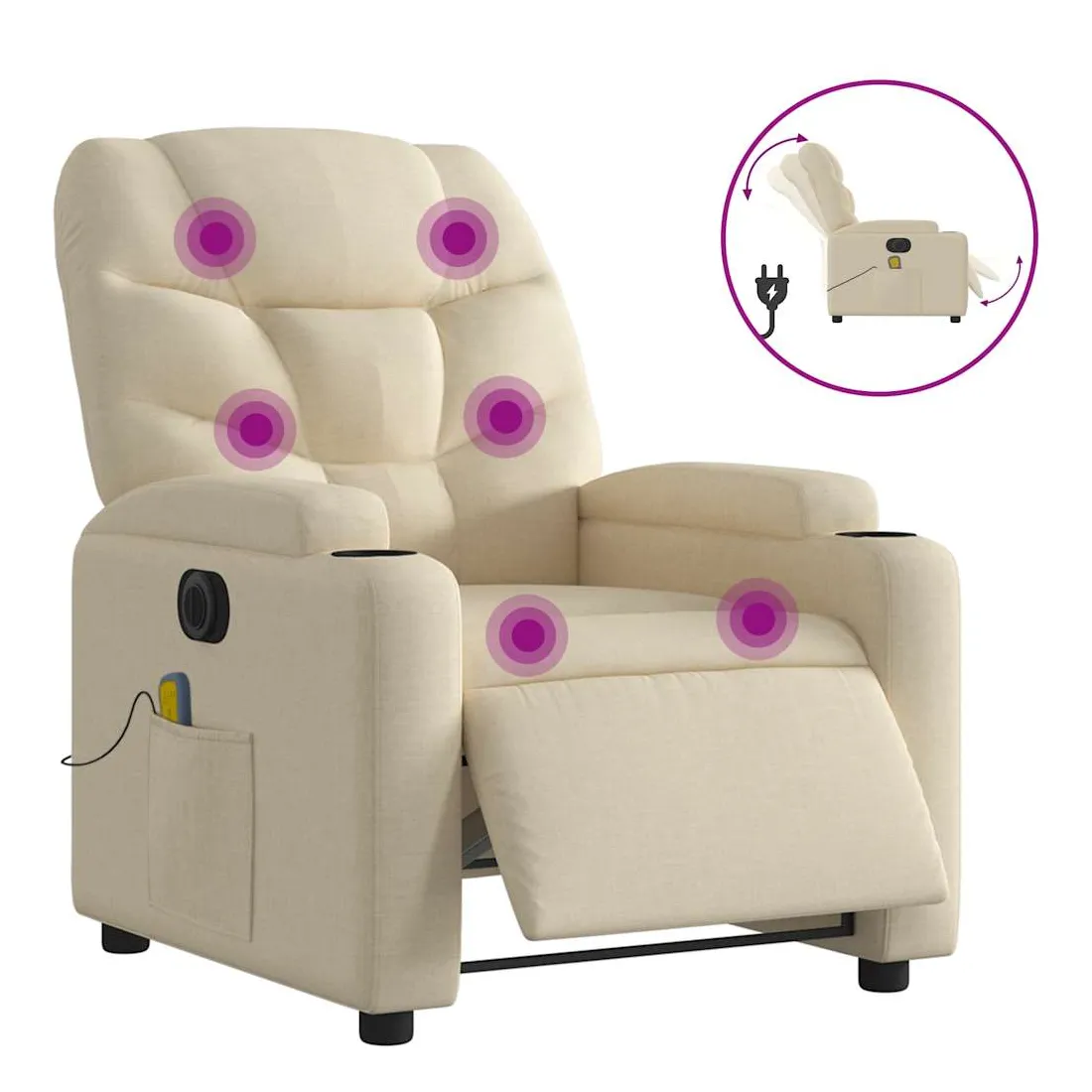 Asseyez-vous et détendez-vous dans ce fauteuil inclinable de massage électrique très confortable ! Fonction d'inclinaison électrique : ce fauteuil inclinable est équipé d'un moteur électrique qui permet de régler automatiquement le repose-pied et le dossier dans n'importe quelle position, selon votre confort, en appuyant simplement sur le bouton situé sur le côté du fauteuil. Cette fonction permet une inclinaison maximale de 135 degrés. En outre, le dossier peut revenir automatiquement à sa position d'origine par une simple pression sur le bouton.Fonction de vibration : les 6 points de massage vous permettent de faire l'expérience d'un massage mieux ciblé. De plus, la télécommande incluse vous permet de choisir différents programmes de massage. La fonction de massage est alimentée par le connecteur USB qui nécessite une source d'alimentation USB certifiée de 5 V (non fournie).Expérience d'assise confortable : le siège, le dossier et les larges accoudoirs bien rembourrés recouverts de tissu procurent une sensation confortable et chaleureuse, vous permettant de vous sentir enveloppé lorsque vous êtes assis. Le tissu présente un aspect simple et épuré et est respirant et durable.Porte-gobelets et poche latérale pratiques : ce fauteuil dispose de deux porte-gobelets pratiques pour vos boissons et d'une poche latérale pour garder vos objets essentiels à portée de main.Cadre solide et stable : le cadre en bois et en métal offre une structure solide et une grande stabilité. Ce fauteuil inclinable est confortable et durable.