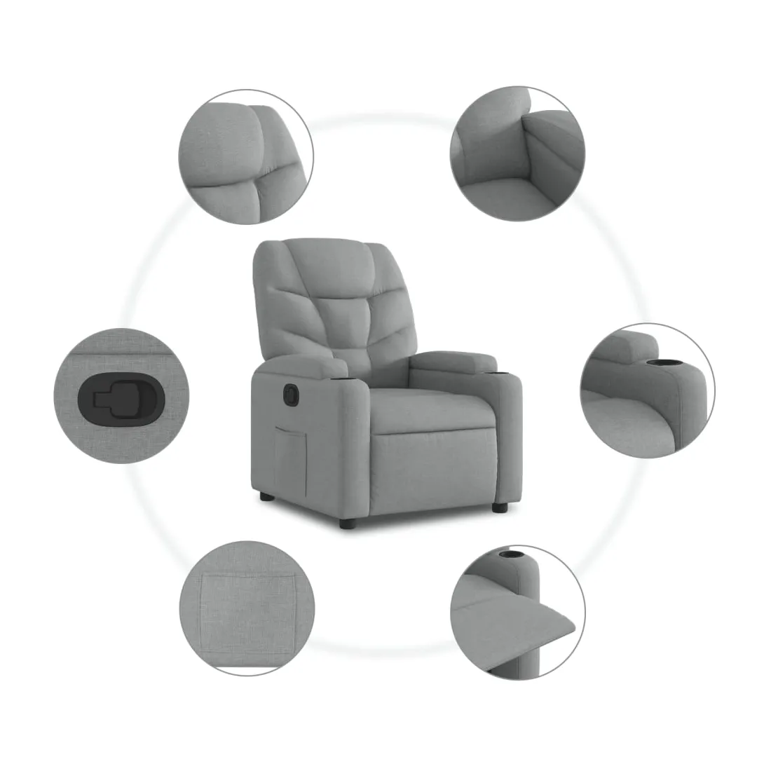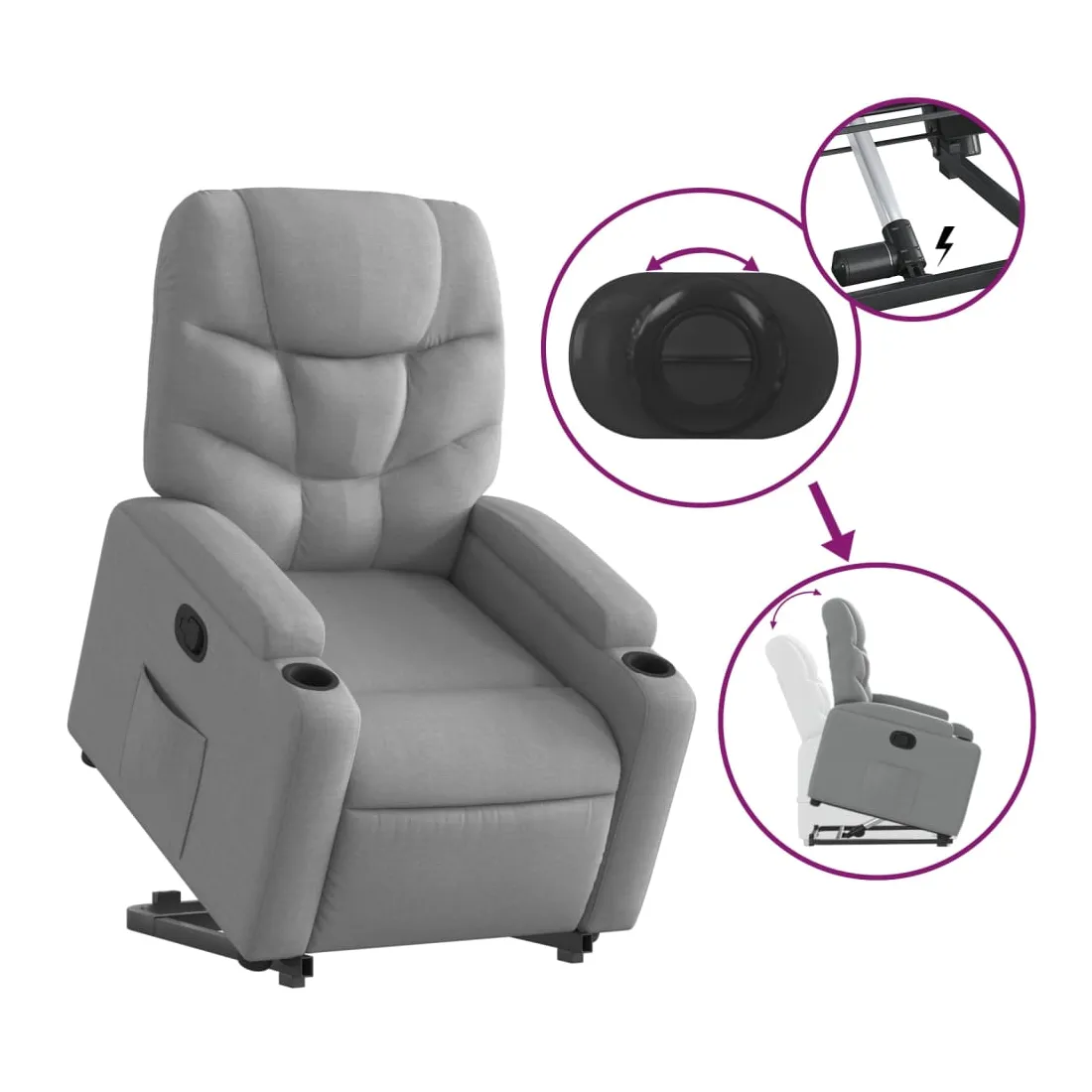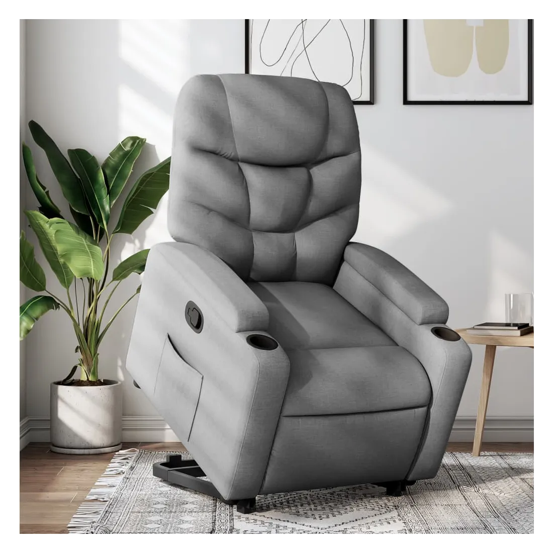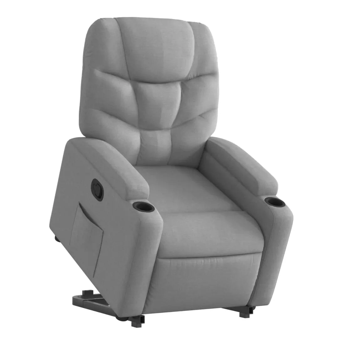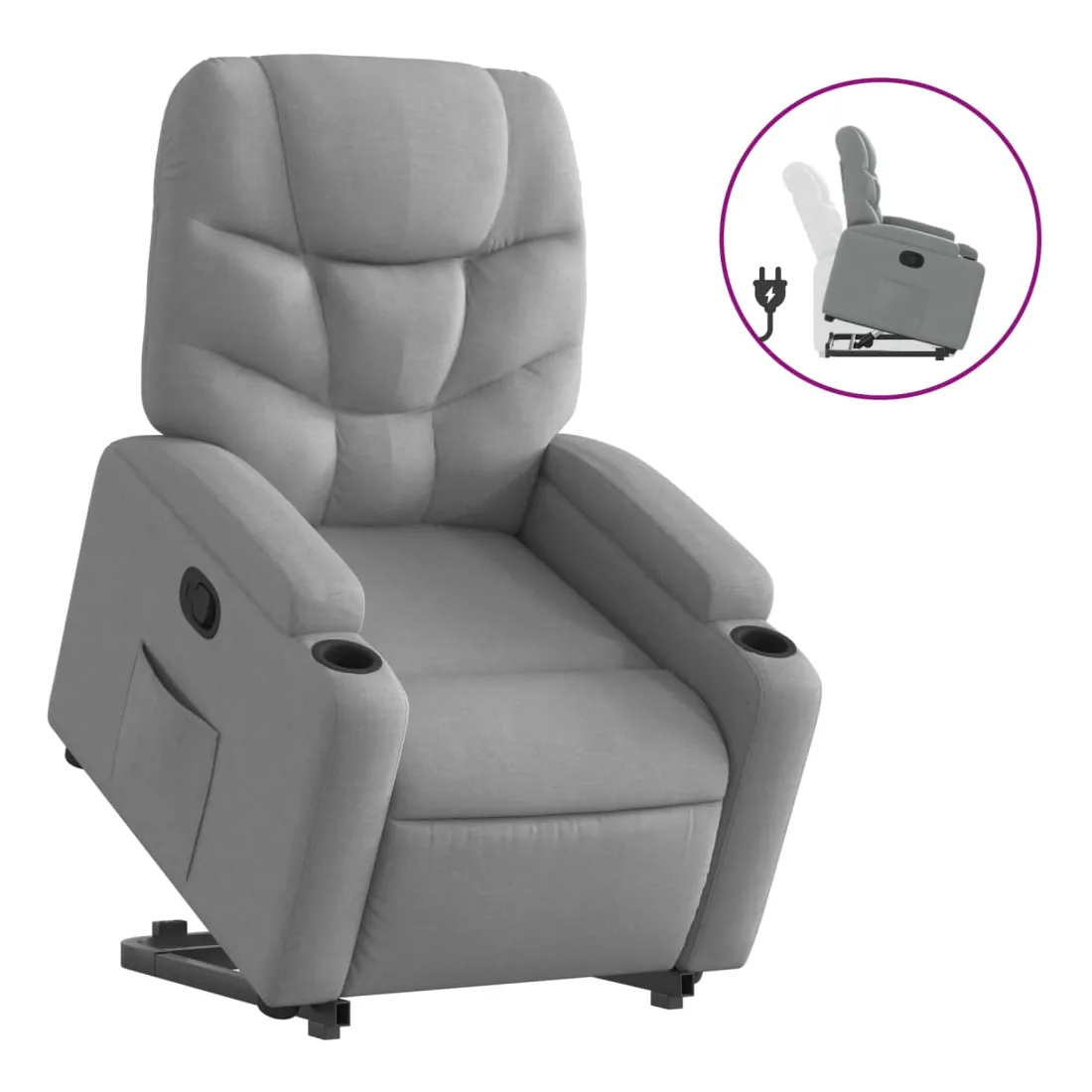 Asseyez-vous et détendez-vous dans ce fauteuil inclinable très confortable ! Fonction de levage électrique : ce fauteuil inclinable pour personnes âgées est équipé d'un moteur électrique pour la fonction de levage. Grâce à la fonction qui pousse toute la chaise vers le haut, vous pouvez facilement vous tenir debout sans stresser votre dos et vos genoux en appuyant simplement sur le bouton.Fonction d'inclinaison manuelle : ce fauteuil inclinable est doté d'une poignée du côté droit. Vous pouvez régler manuellement le repose-pieds et le dossier dans n'importe quelle position selon votre confort en tirant simplement sur la poignée. Cette fonction permet une inclinaison maximale de 135 degrés. De plus, le dossier peut revenir rapidement à sa position d'origine en tirant simplement sur la poignée.Expérience d'assise confortable : le siège, le dossier et les larges accoudoirs bien rembourrés recouverts de tissu procurent une sensation confortable et chaleureuse, vous permettant de vous sentir enveloppé lorsque vous êtes assis. Le tissu présente un aspect simple et épuré et est respirant et durable.Porte-gobelets et poche latérale pratiques : ce fauteuil dispose de deux porte-gobelets pratiques pour vos boissons et d'une poche latérale pour garder vos objets essentiels à portée de main.Cadre solide et stable : le cadre en bois et en métal offre une structure solide et une grande stabilité. Ce fauteuil inclinable est confortable et durable.