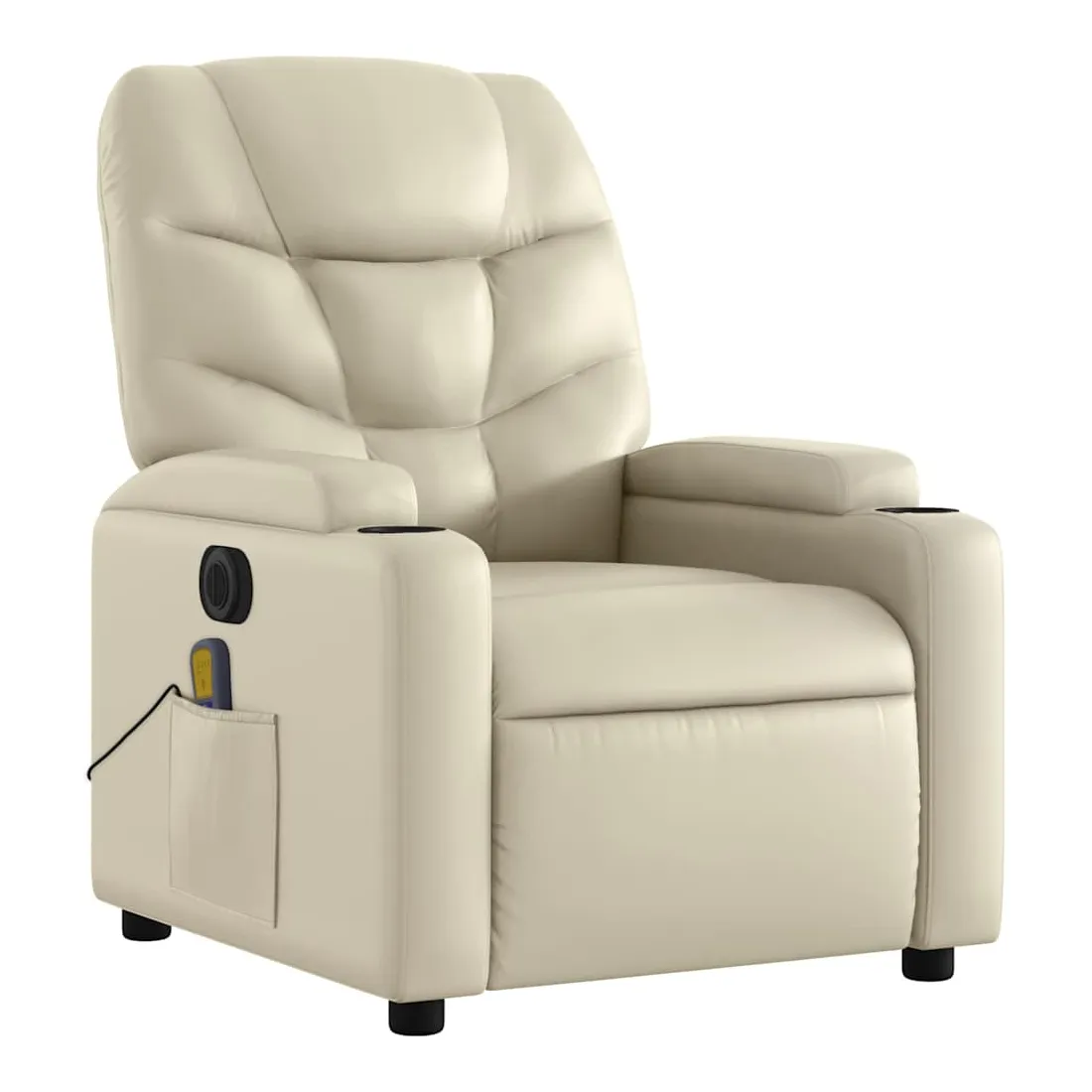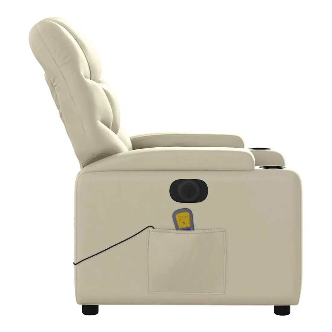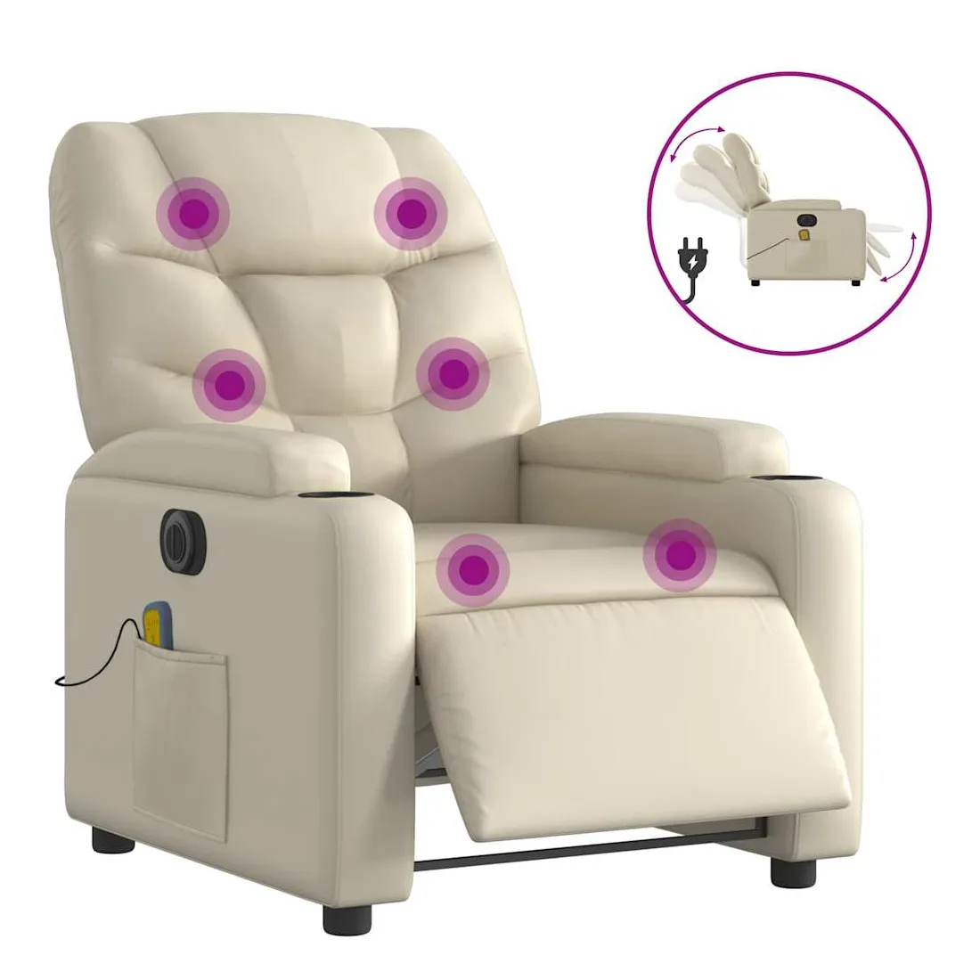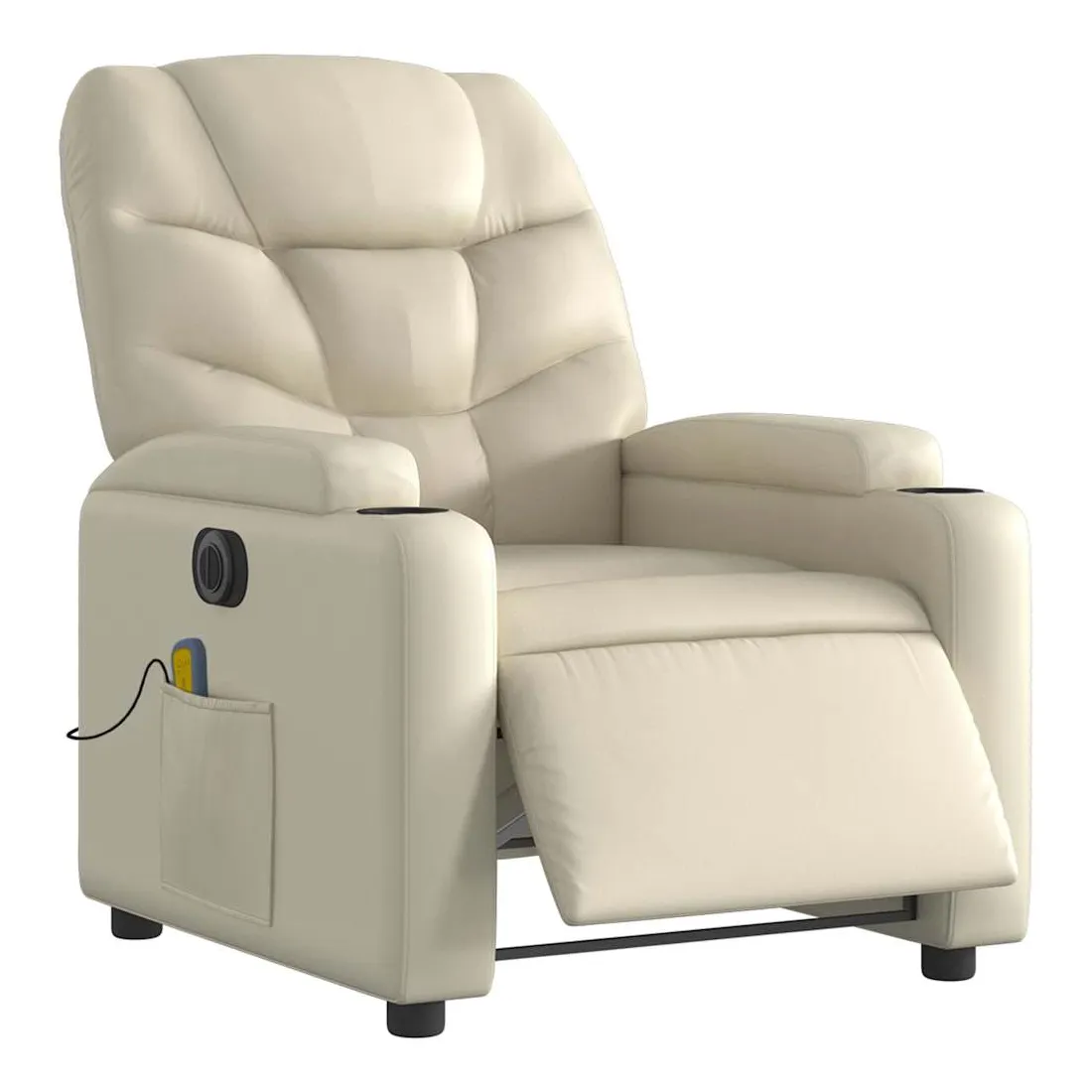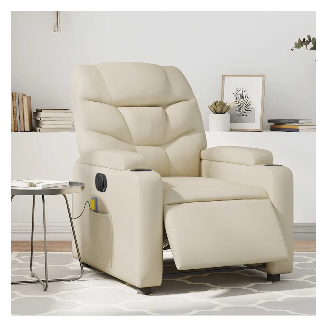 Asseyez-vous et détendez-vous dans ce fauteuil inclinable de massage électrique très confortable ! Fonction d'inclinaison électrique : ce fauteuil inclinable est équipé d'un moteur électrique qui permet de régler automatiquement le repose-pied et le dossier dans n'importe quelle position, selon votre confort, en appuyant simplement sur le bouton situé sur le côté du fauteuil. Cette fonction permet une inclinaison maximale de 135 degrés. En outre, le dossier peut revenir automatiquement à sa position d'origine par une simple pression sur le bouton.Fonction de vibration : les 6 points de massage vous permettent de faire l'expérience d'un massage mieux ciblé. De plus, la télécommande incluse vous permet de choisir différents programmes de massage. La fonction de massage est alimentée par le connecteur USB qui nécessite une source d'alimentation USB certifiée de 5 V (non fournie).Expérience de siège confortable : le siège, le dossier et les larges accoudoirs rembourrés épais recouverts de similicuir procurent une sensation confortable, vous faisant vous sentir enlacé lorsque vous êtes assis. Le similicuir est un matériau très résistant. Il est résistant aux taches, ce qui le rend facile à nettoyer avec un chiffon humide. La surface lisse donne également un aspect luxueux et la beauté du cuir véritable.Porte-gobelets et poche latérale pratiques : ce fauteuil dispose de deux porte-gobelets pratiques pour vos boissons et d'une poche latérale pour garder vos objets essentiels à portée de main.Cadre solide et stable : le cadre en bois et en métal offre une structure solide et une grande stabilité. Ce fauteuil inclinable est confortable et durable.