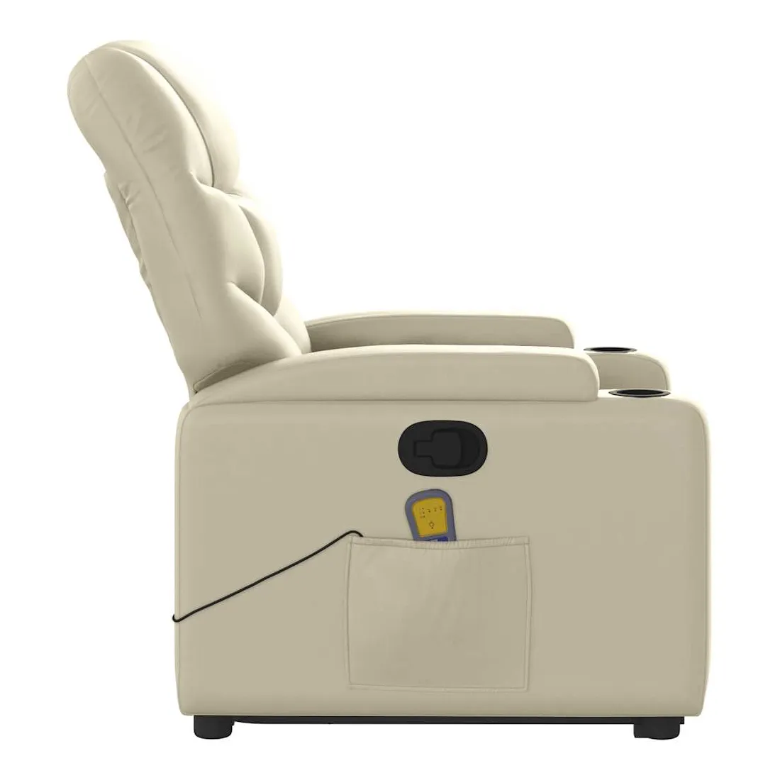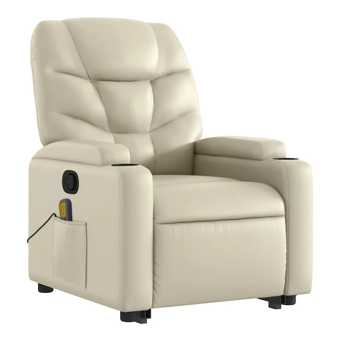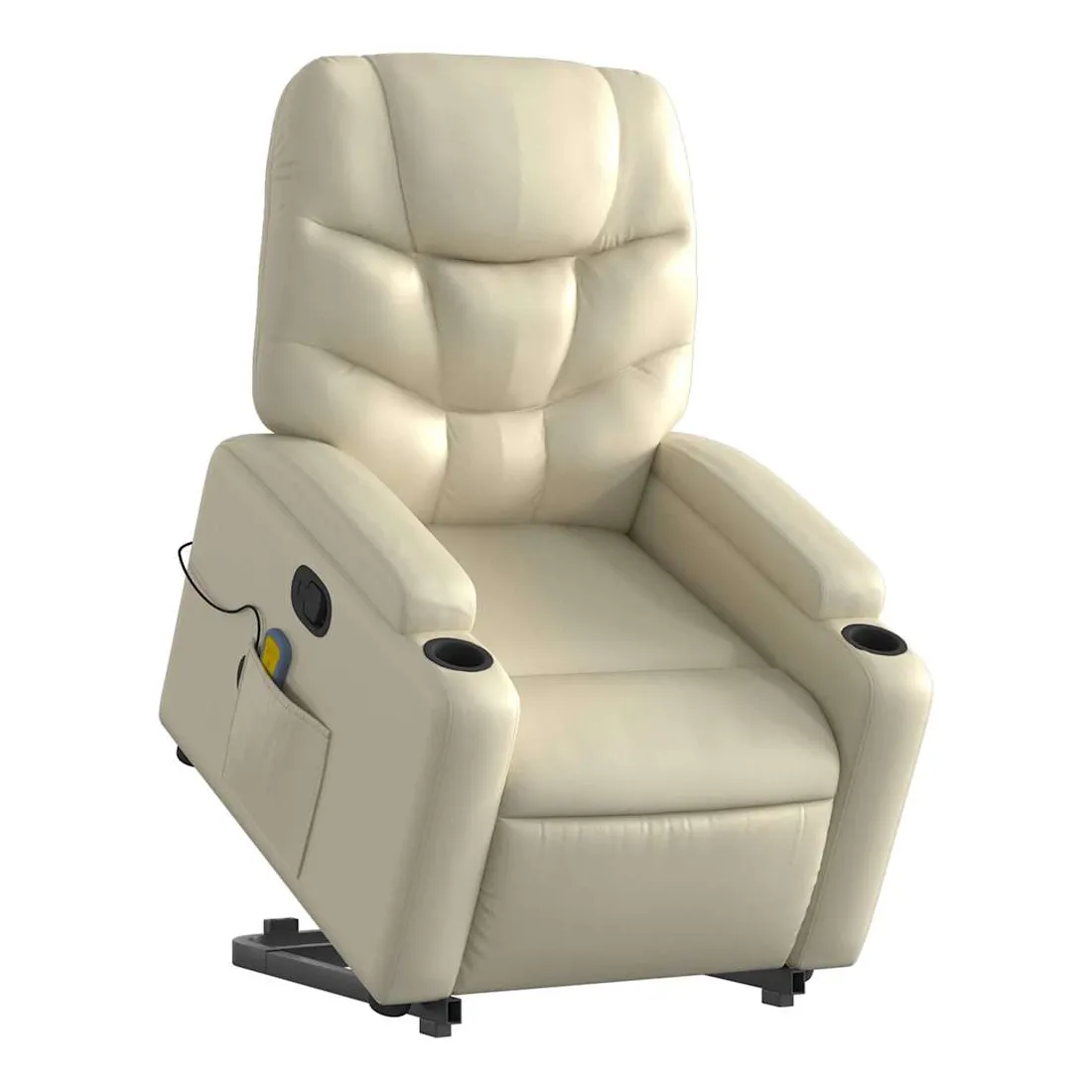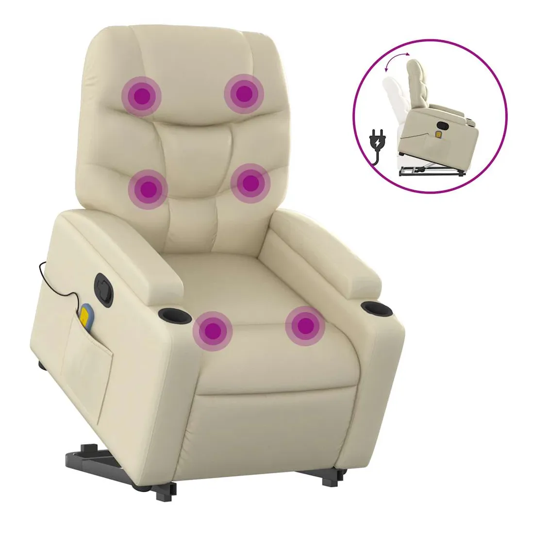 Asseyez-vous et détendez-vous dans ce fauteuil inclinable de massage très confortable ! Fonction de levage électrique : ce fauteuil inclinable pour personnes âgées est équipé d'un moteur électrique pour la fonction de levage. Grâce à la fonction qui pousse toute la chaise vers le haut, vous pouvez facilement vous tenir debout sans stresser votre dos et vos genoux en appuyant simplement sur le bouton.Fonction d'inclinaison manuelle : ce fauteuil inclinable est doté d'une poignée du côté droit. Vous pouvez régler manuellement le repose-pieds et le dossier dans n'importe quelle position selon votre confort en tirant simplement sur la poignée. Cette fonction permet une inclinaison maximale de 135 degrés. De plus, le dossier peut revenir rapidement à sa position d'origine en tirant simplement sur la poignée.Fonction de vibration : les 6 points de massage vous permettent de faire l'expérience d'un massage mieux ciblé. De plus, la télécommande incluse vous permet de choisir différents programmes de massage. La fonction de massage est alimentée par le connecteur USB qui nécessite une source d'alimentation USB certifiée de 5 V (non fournie).Expérience de siège confortable : le siège, le dossier et les larges accoudoirs rembourrés épais recouverts de similicuir procurent une sensation confortable, vous faisant vous sentir enlacé lorsque vous êtes assis. Le similicuir est un matériau très résistant. Il est résistant aux taches, ce qui le rend facile à nettoyer avec un chiffon humide. La surface lisse donne également un aspect luxueux et la beauté du cuir véritable.Porte-gobelets et poche latérale pratiques : ce fauteuil dispose de deux porte-gobelets pratiques pour vos boissons et d'une poche latérale pour garder vos objets essentiels à portée de main.Cadre solide et stable : le cadre en bois et en métal offre une structure solide et une grande stabilité. Ce fauteuil inclinable est confortable et durable.