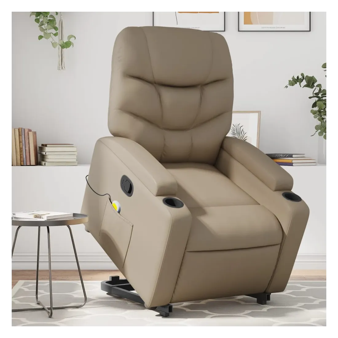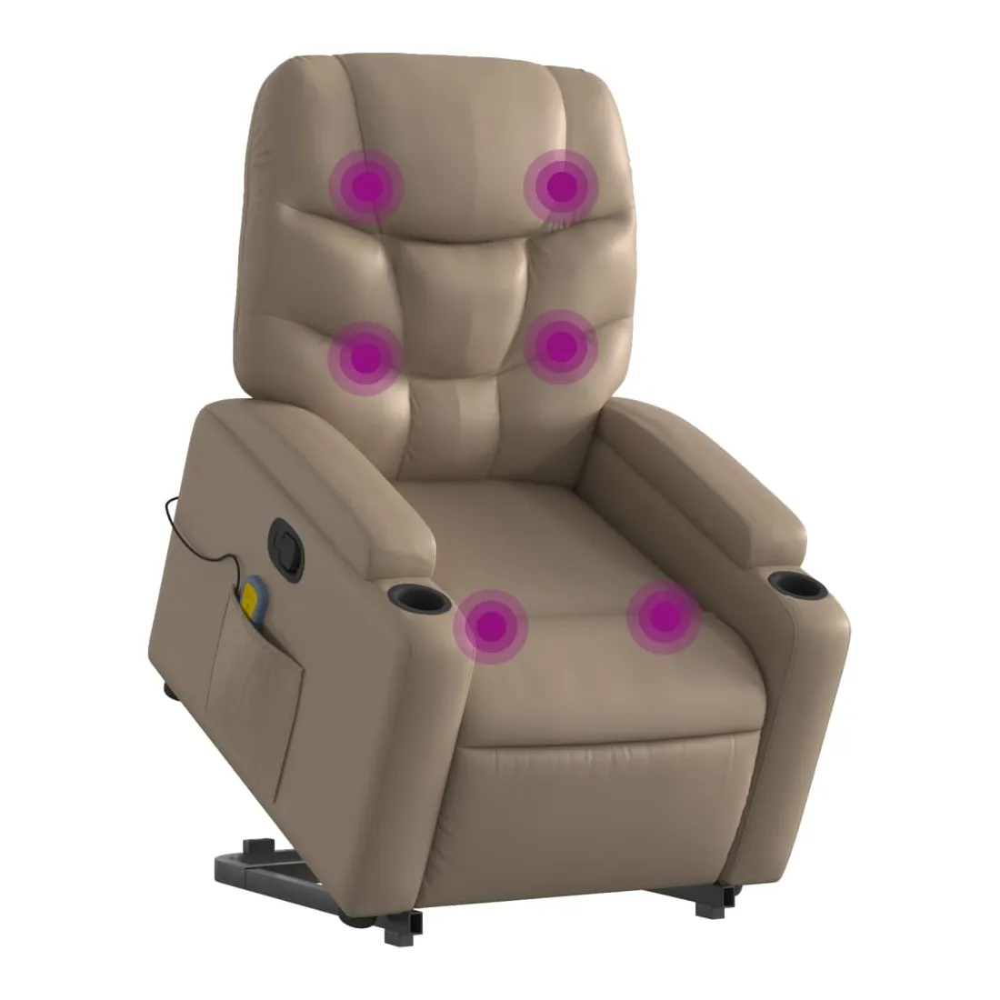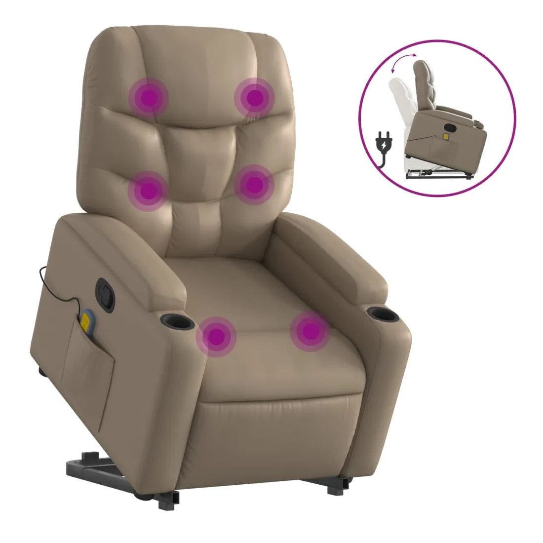 Asseyez-vous et détendez-vous dans ce fauteuil inclinable de massage très confortable ! Fonction de levage électrique : ce fauteuil inclinable pour personnes âgées est équipé d'un moteur électrique pour la fonction de levage. Grâce à la fonction qui pousse toute la chaise vers le haut, vous pouvez facilement vous tenir debout sans stresser votre dos et vos genoux en appuyant simplement sur le bouton.Fonction d'inclinaison manuelle : ce fauteuil inclinable est doté d'une poignée du côté droit. Vous pouvez régler manuellement le repose-pieds et le dossier dans n'importe quelle position selon votre confort en tirant simplement sur la poignée. Cette fonction permet une inclinaison maximale de 135 degrés. De plus, le dossier peut revenir rapidement à sa position d'origine en tirant simplement sur la poignée.Fonction de vibration : les 6 points de massage vous permettent de faire l'expérience d'un massage mieux ciblé. De plus, la télécommande incluse vous permet de choisir différents programmes de massage. La fonction de massage est alimentée par le connecteur USB qui nécessite une source d'alimentation USB certifiée de 5 V (non fournie).Expérience de siège confortable : le siège, le dossier et les larges accoudoirs rembourrés épais recouverts de similicuir procurent une sensation confortable, vous faisant vous sentir enlacé lorsque vous êtes assis. Le similicuir est un matériau très résistant. Il est résistant aux taches, ce qui le rend facile à nettoyer avec un chiffon humide. La surface lisse donne également un aspect luxueux et la beauté du cuir véritable.Porte-gobelets et poche latérale pratiques : ce fauteuil dispose de deux porte-gobelets pratiques pour vos boissons et d'une poche latérale pour garder vos objets essentiels à portée de main.Cadre solide et stable : le cadre en bois et en métal offre une structure solide et une grande stabilité. Ce fauteuil inclinable est confortable et durable.