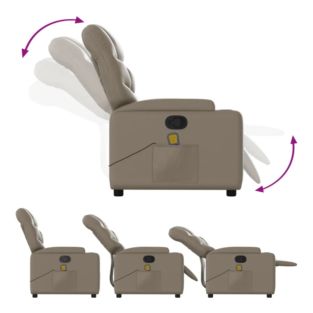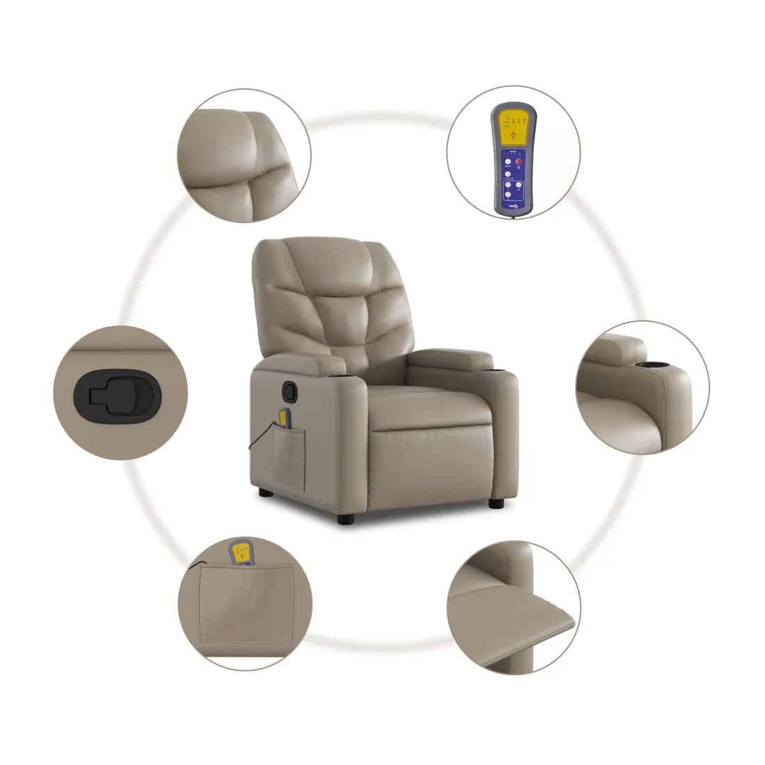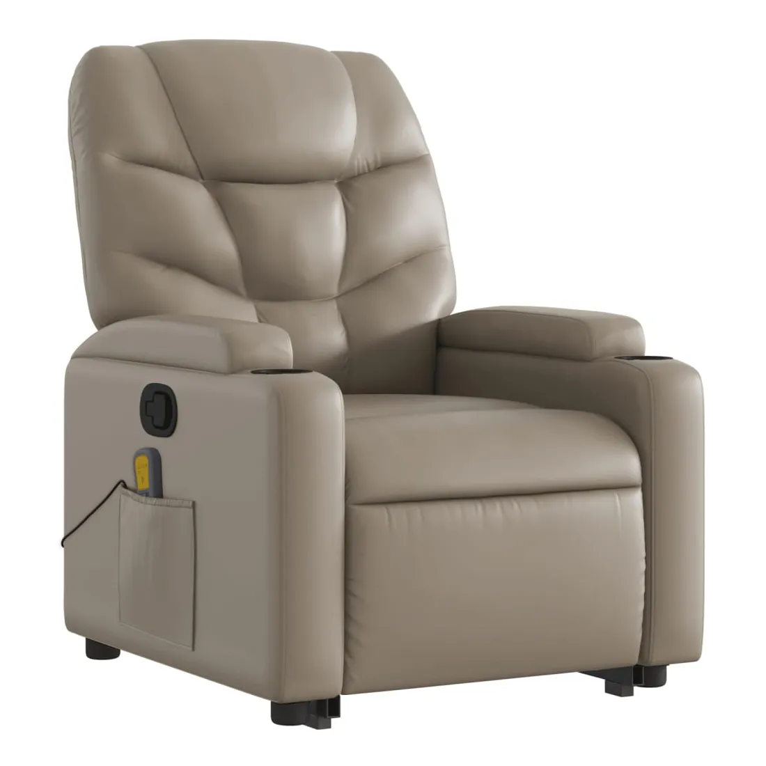 Asseyez-vous et détendez-vous dans ce fauteuil inclinable de massage très confortable ! Fonction de levage électrique : ce fauteuil inclinable pour personnes âgées est équipé d'un moteur électrique pour la fonction de levage. Grâce à la fonction qui pousse toute la chaise vers le haut, vous pouvez facilement vous tenir debout sans stresser votre dos et vos genoux en appuyant simplement sur le bouton.Fonction d'inclinaison manuelle : ce fauteuil inclinable est doté d'une poignée du côté droit. Vous pouvez régler manuellement le repose-pieds et le dossier dans n'importe quelle position selon votre confort en tirant simplement sur la poignée. Cette fonction permet une inclinaison maximale de 135 degrés. De plus, le dossier peut revenir rapidement à sa position d'origine en tirant simplement sur la poignée.Fonction de vibration : les 6 points de massage vous permettent de faire l'expérience d'un massage mieux ciblé. De plus, la télécommande incluse vous permet de choisir différents programmes de massage. La fonction de massage est alimentée par le connecteur USB qui nécessite une source d'alimentation USB certifiée de 5 V (non fournie).Expérience de siège confortable : le siège, le dossier et les larges accoudoirs rembourrés épais recouverts de similicuir procurent une sensation confortable, vous faisant vous sentir enlacé lorsque vous êtes assis. Le similicuir est un matériau très résistant. Il est résistant aux taches, ce qui le rend facile à nettoyer avec un chiffon humide. La surface lisse donne également un aspect luxueux et la beauté du cuir véritable.Porte-gobelets et poche latérale pratiques : ce fauteuil dispose de deux porte-gobelets pratiques pour vos boissons et d'une poche latérale pour garder vos objets essentiels à portée de main.Cadre solide et stable : le cadre en bois et en métal offre une structure solide et une grande stabilité. Ce fauteuil inclinable est confortable et durable.