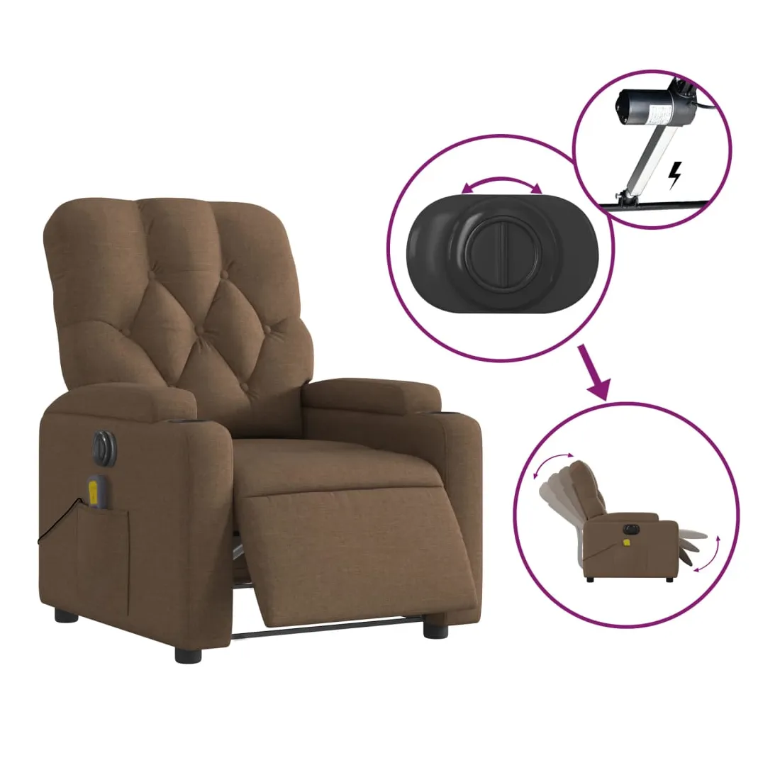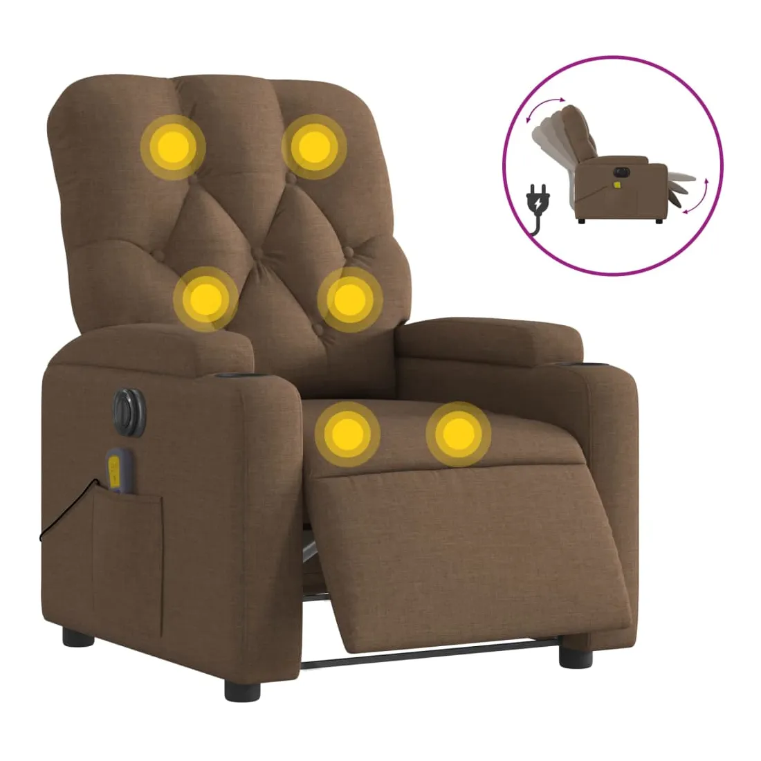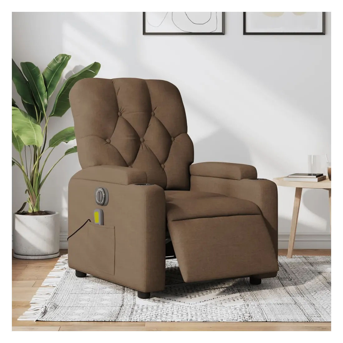 Asseyez-vous et détendez-vous dans ce fauteuil inclinable de massage électrique très confortable ! Fonction d'inclinaison électrique : ce fauteuil inclinable est équipé d'un moteur électrique qui permet de régler automatiquement le repose-pied et le dossier dans n'importe quelle position, selon votre confort, en appuyant simplement sur le bouton situé sur le côté du fauteuil. Cette fonction permet une inclinaison maximale de 135 degrés. En outre, le dossier peut revenir automatiquement à sa position d'origine par une simple pression sur le bouton.Fonction de vibration : les 6 points de massage vous permettent de faire l'expérience d'un massage mieux ciblé. De plus, la télécommande incluse vous permet de choisir différents programmes de massage. La fonction de massage est alimentée par le connecteur USB qui nécessite une source d'alimentation USB certifiée de 5 V (non fournie).Expérience d'assise confortable : le siège, le dossier et les larges accoudoirs bien rembourrés recouverts de tissu procurent une sensation confortable et chaleureuse, vous permettant de vous sentir enveloppé lorsque vous êtes assis. Le tissu présente un aspect simple et épuré et est respirant et durable.Porte-gobelets et poche latérale pratiques : ce fauteuil dispose de deux porte-gobelets pratiques pour vos boissons et d'une poche latérale pour garder vos objets essentiels à portée de main.Cadre solide et stable : le cadre en bois et en métal offre une structure solide et une grande stabilité. Ce fauteuil inclinable est confortable et durable.