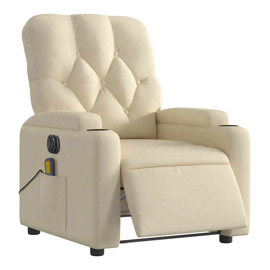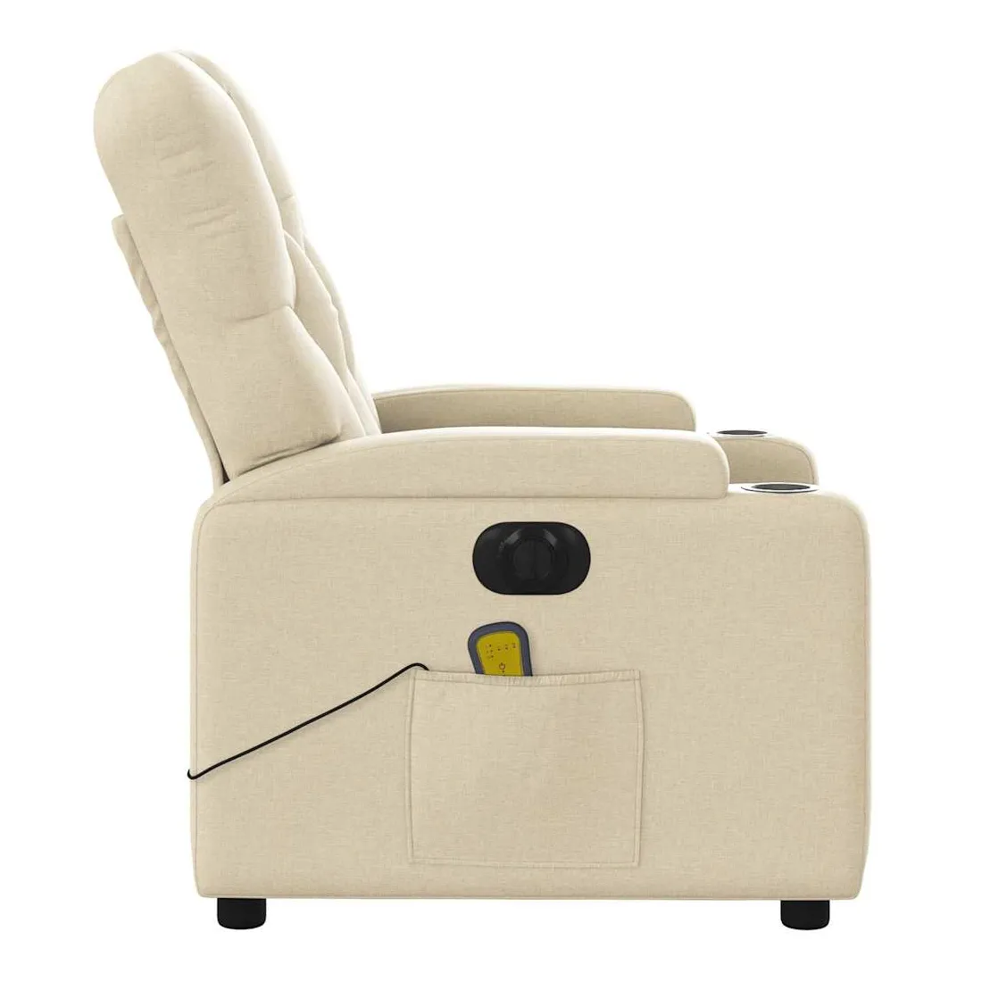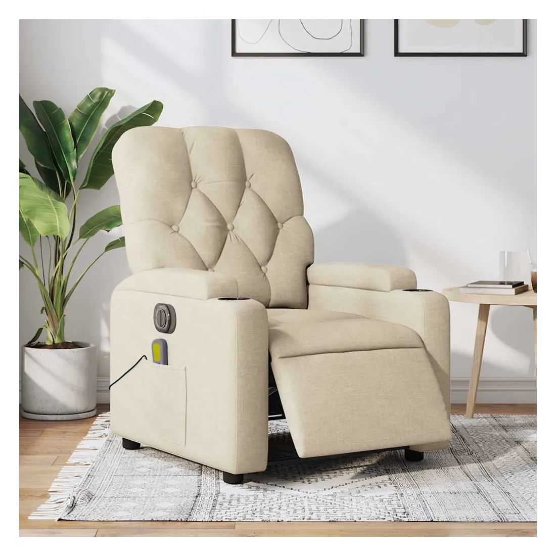 Asseyez-vous et détendez-vous dans ce fauteuil inclinable de massage électrique très confortable ! Fonction d'inclinaison électrique : ce fauteuil inclinable est équipé d'un moteur électrique qui permet de régler automatiquement le repose-pied et le dossier dans n'importe quelle position, selon votre confort, en appuyant simplement sur le bouton situé sur le côté du fauteuil. Cette fonction permet une inclinaison maximale de 135 degrés. En outre, le dossier peut revenir automatiquement à sa position d'origine par une simple pression sur le bouton.Fonction de vibration : les 6 points de massage vous permettent de faire l'expérience d'un massage mieux ciblé. De plus, la télécommande incluse vous permet de choisir différents programmes de massage. La fonction de massage est alimentée par le connecteur USB qui nécessite une source d'alimentation USB certifiée de 5 V (non fournie).Expérience d'assise confortable : le siège, le dossier et les larges accoudoirs bien rembourrés recouverts de tissu procurent une sensation confortable et chaleureuse, vous permettant de vous sentir enveloppé lorsque vous êtes assis. Le tissu présente un aspect simple et épuré et est respirant et durable.Porte-gobelets et poche latérale pratiques : ce fauteuil dispose de deux porte-gobelets pratiques pour vos boissons et d'une poche latérale pour garder vos objets essentiels à portée de main.Cadre solide et stable : le cadre en bois et en métal offre une structure solide et une grande stabilité. Ce fauteuil inclinable est confortable et durable.