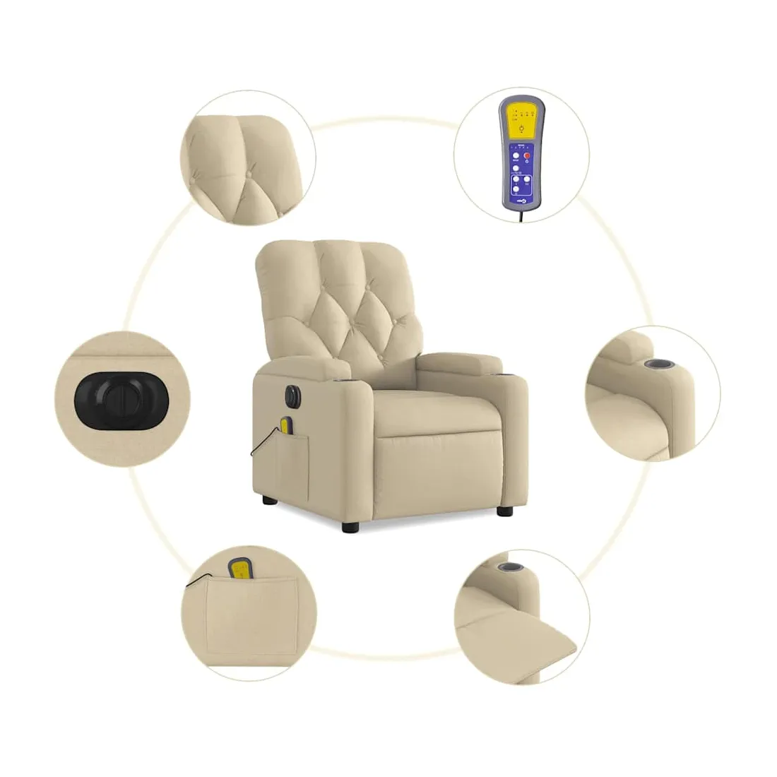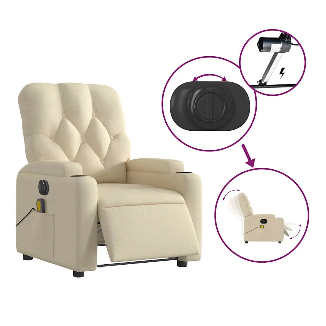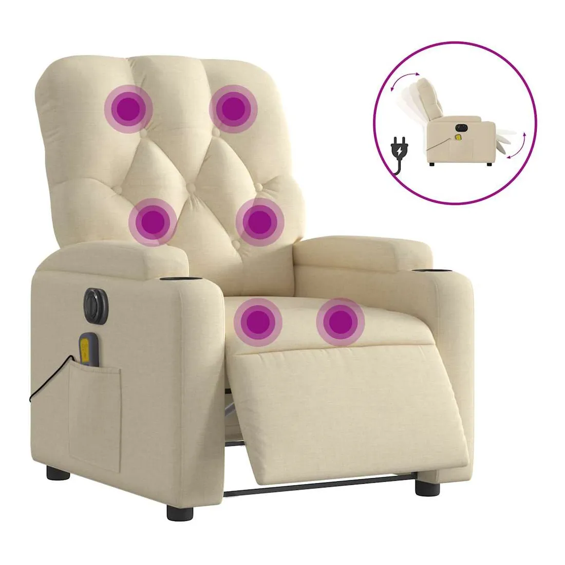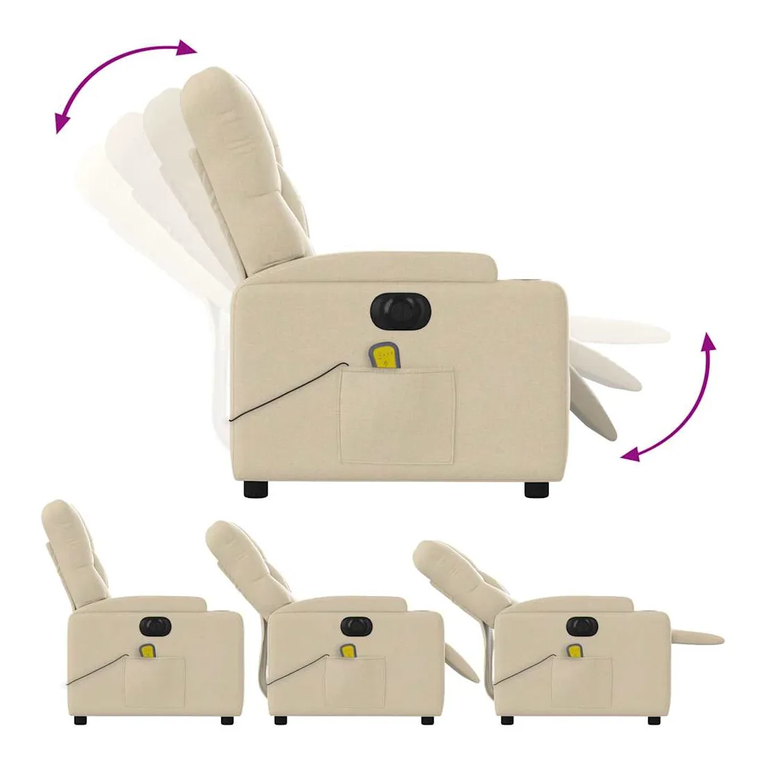 Asseyez-vous et détendez-vous dans ce fauteuil inclinable de massage électrique très confortable ! Fonction d'inclinaison électrique : ce fauteuil inclinable est équipé d'un moteur électrique qui permet de régler automatiquement le repose-pied et le dossier dans n'importe quelle position, selon votre confort, en appuyant simplement sur le bouton situé sur le côté du fauteuil. Cette fonction permet une inclinaison maximale de 135 degrés. En outre, le dossier peut revenir automatiquement à sa position d'origine par une simple pression sur le bouton.Fonction de vibration : les 6 points de massage vous permettent de faire l'expérience d'un massage mieux ciblé. De plus, la télécommande incluse vous permet de choisir différents programmes de massage. La fonction de massage est alimentée par le connecteur USB qui nécessite une source d'alimentation USB certifiée de 5 V (non fournie).Expérience d'assise confortable : le siège, le dossier et les larges accoudoirs bien rembourrés recouverts de tissu procurent une sensation confortable et chaleureuse, vous permettant de vous sentir enveloppé lorsque vous êtes assis. Le tissu présente un aspect simple et épuré et est respirant et durable.Porte-gobelets et poche latérale pratiques : ce fauteuil dispose de deux porte-gobelets pratiques pour vos boissons et d'une poche latérale pour garder vos objets essentiels à portée de main.Cadre solide et stable : le cadre en bois et en métal offre une structure solide et une grande stabilité. Ce fauteuil inclinable est confortable et durable.