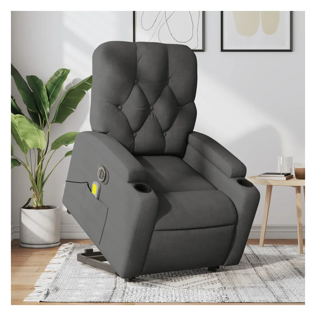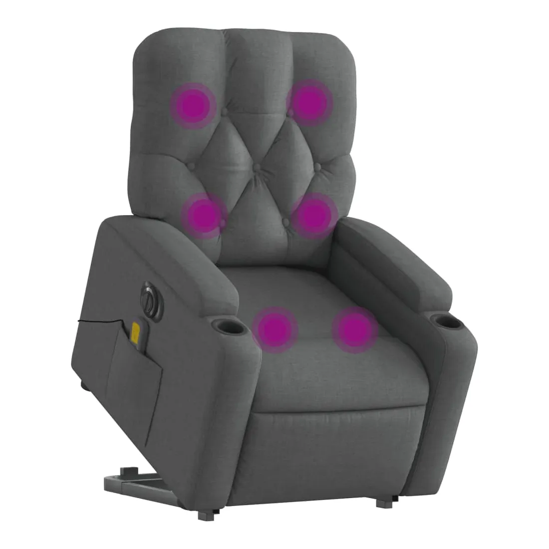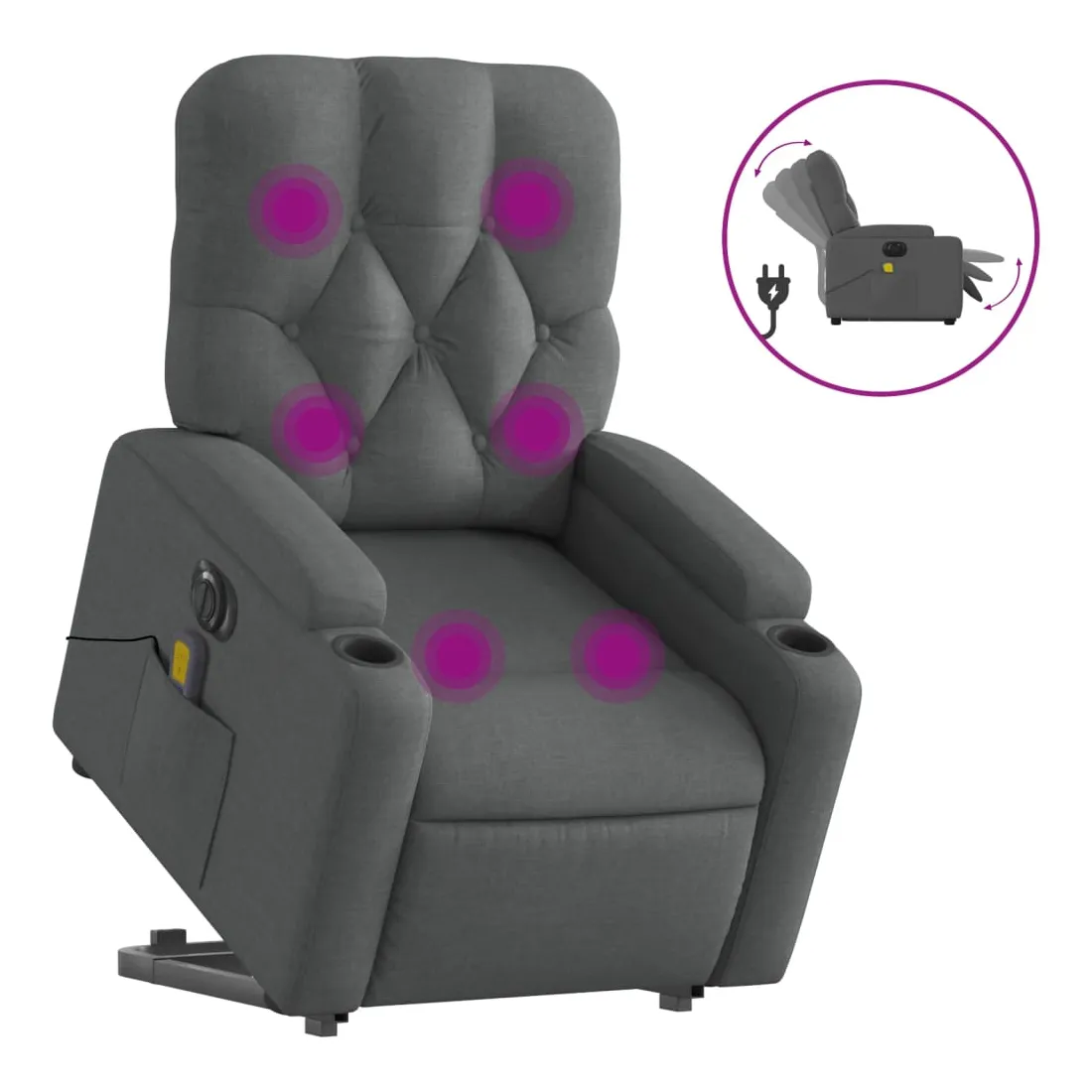 Asseyez-vous et détendez-vous dans ce fauteuil inclinable de massage électrique très confortable ! Fonction de levage électrique : ce fauteuil inclinable pour personnes âgées est équipé d'un moteur électrique pour la fonction de levage. Grâce à la fonction qui pousse toute la chaise vers le haut, vous pouvez facilement vous tenir debout sans stresser votre dos et vos genoux en appuyant simplement sur le bouton.Fonction d'inclinaison électrique : ce fauteuil inclinable est également équipé d'un moteur électrique qui permet de régler automatiquement le repose-pied et le dossier dans n'importe quelle position, selon votre confort, en appuyant simplement sur le bouton situé sur le côté du fauteuil. Cette fonction permet une inclinaison maximale de 135 degrés. En outre, le dossier peut revenir automatiquement à sa position d'origine par une simple pression sur le bouton.Fonction de vibration : les 6 points de massage vous permettent de faire l'expérience d'un massage mieux ciblé. De plus, la télécommande incluse vous permet de choisir différents programmes de massage. La fonction de massage est alimentée par le connecteur USB qui nécessite une source d'alimentation USB certifiée de 5 V (non fournie).Expérience d'assise confortable : le siège, le dossier et les larges accoudoirs bien rembourrés recouverts de tissu procurent une sensation confortable et chaleureuse, vous permettant de vous sentir enveloppé lorsque vous êtes assis. Le tissu présente un aspect simple et épuré et est respirant et durable.Porte-gobelets et poche latérale pratiques : ce fauteuil dispose de deux porte-gobelets pratiques pour vos boissons et d'une poche latérale pour garder vos objets essentiels à portée de main.Cadre solide et stable : le cadre en bois et en métal offre une structure solide et une grande stabilité. Ce fauteuil inclinable est confortable et durable.