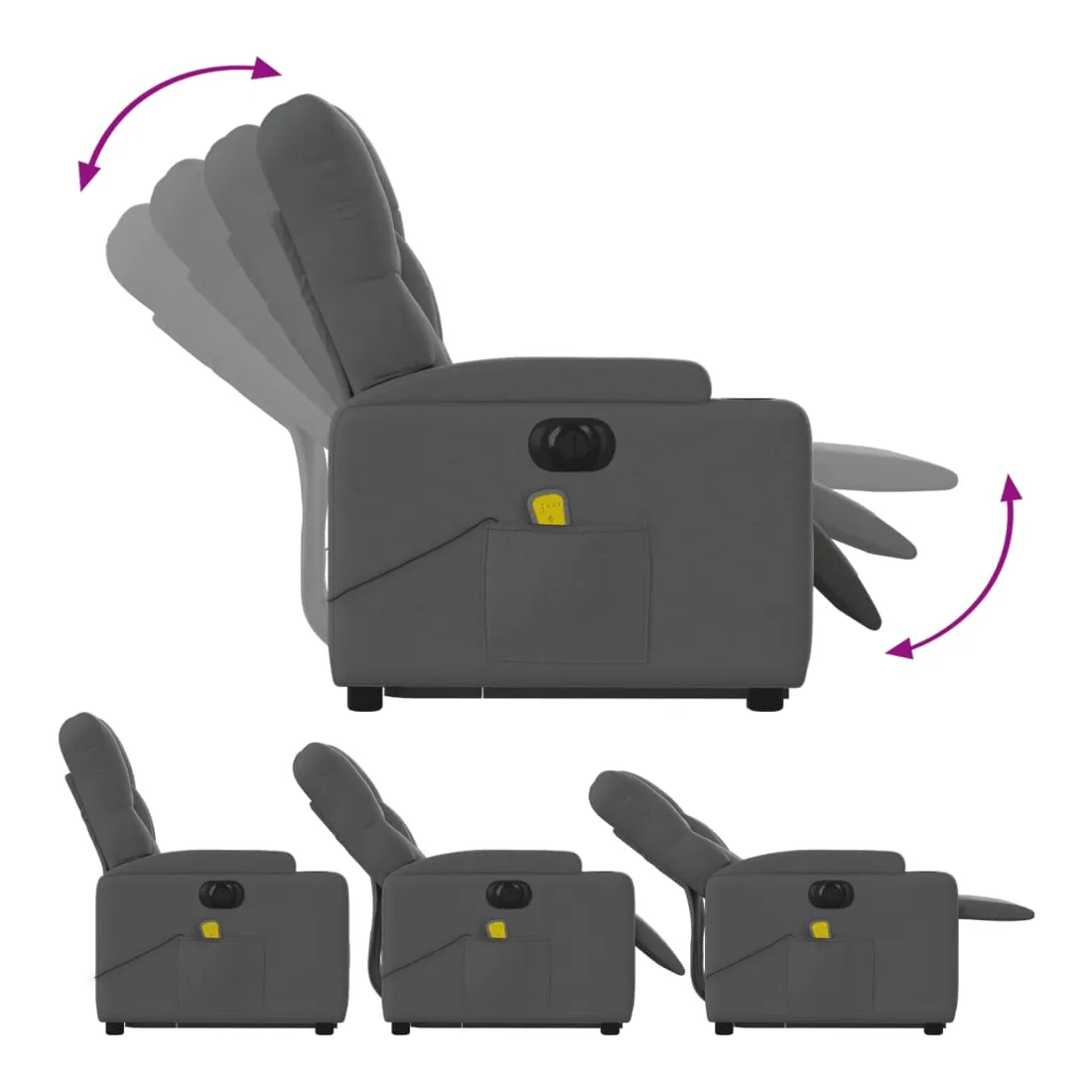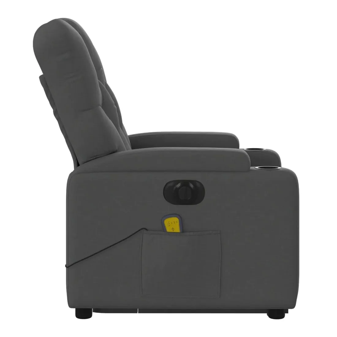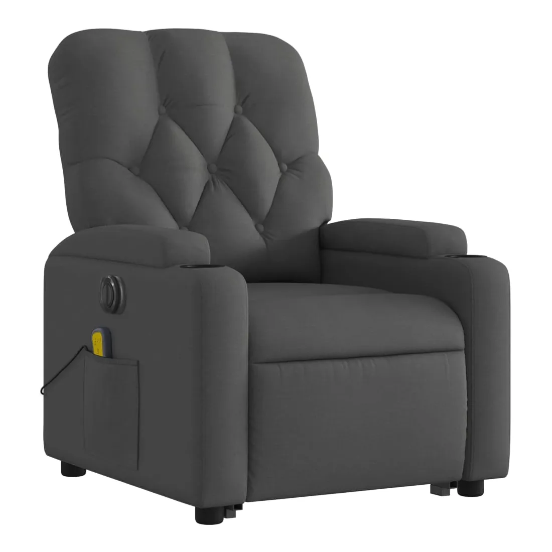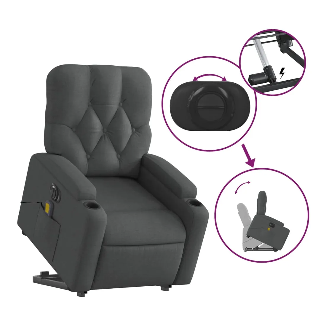 Asseyez-vous et détendez-vous dans ce fauteuil inclinable de massage électrique très confortable ! Fonction de levage électrique : ce fauteuil inclinable pour personnes âgées est équipé d'un moteur électrique pour la fonction de levage. Grâce à la fonction qui pousse toute la chaise vers le haut, vous pouvez facilement vous tenir debout sans stresser votre dos et vos genoux en appuyant simplement sur le bouton.Fonction d'inclinaison électrique : ce fauteuil inclinable est également équipé d'un moteur électrique qui permet de régler automatiquement le repose-pied et le dossier dans n'importe quelle position, selon votre confort, en appuyant simplement sur le bouton situé sur le côté du fauteuil. Cette fonction permet une inclinaison maximale de 135 degrés. En outre, le dossier peut revenir automatiquement à sa position d'origine par une simple pression sur le bouton.Fonction de vibration : les 6 points de massage vous permettent de faire l'expérience d'un massage mieux ciblé. De plus, la télécommande incluse vous permet de choisir différents programmes de massage. La fonction de massage est alimentée par le connecteur USB qui nécessite une source d'alimentation USB certifiée de 5 V (non fournie).Expérience d'assise confortable : le siège, le dossier et les larges accoudoirs bien rembourrés recouverts de tissu procurent une sensation confortable et chaleureuse, vous permettant de vous sentir enveloppé lorsque vous êtes assis. Le tissu présente un aspect simple et épuré et est respirant et durable.Porte-gobelets et poche latérale pratiques : ce fauteuil dispose de deux porte-gobelets pratiques pour vos boissons et d'une poche latérale pour garder vos objets essentiels à portée de main.Cadre solide et stable : le cadre en bois et en métal offre une structure solide et une grande stabilité. Ce fauteuil inclinable est confortable et durable.