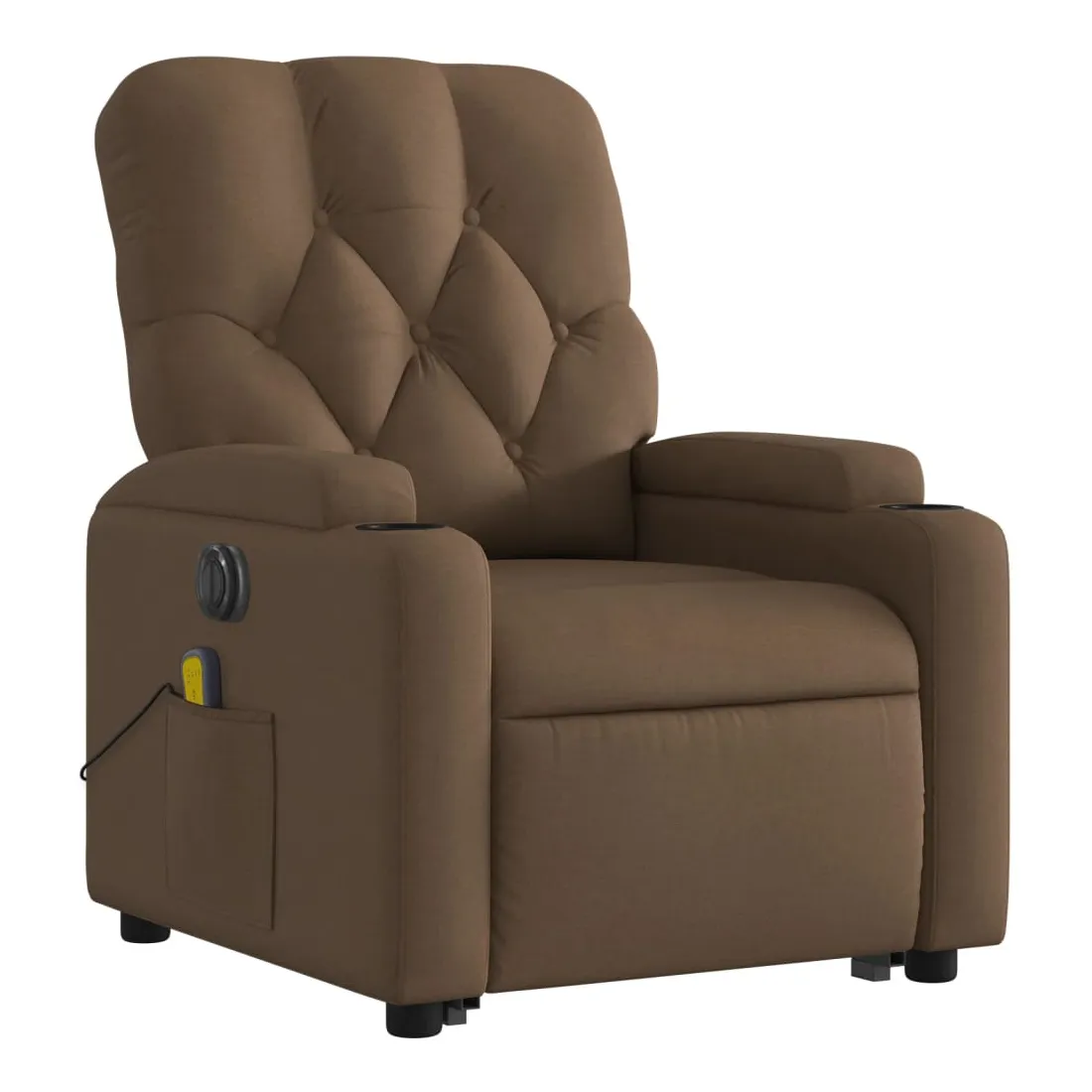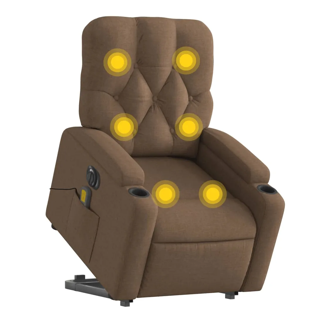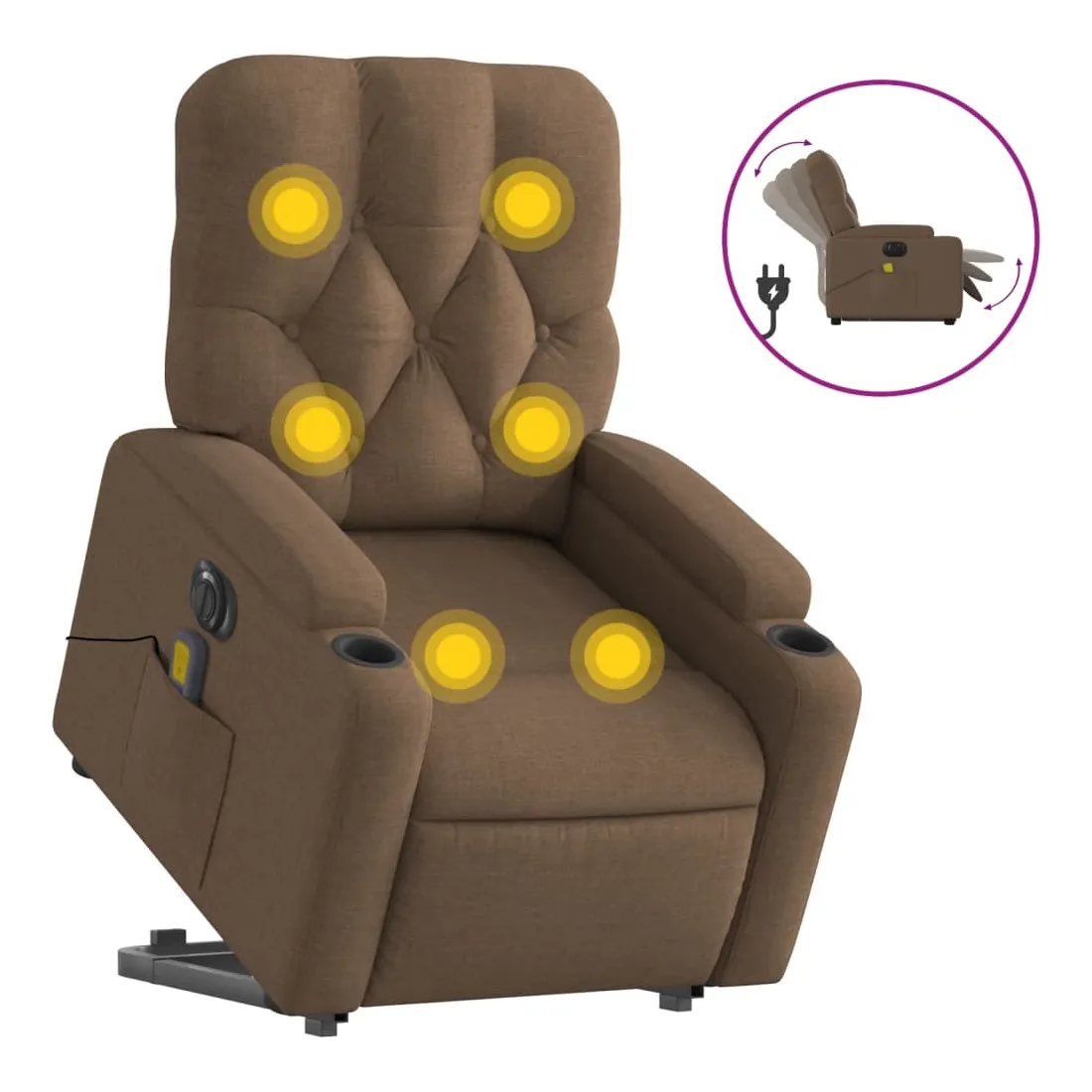 Asseyez-vous et détendez-vous dans ce fauteuil inclinable de massage électrique très confortable ! Fonction de levage électrique : ce fauteuil inclinable pour personnes âgées est équipé d'un moteur électrique pour la fonction de levage. Grâce à la fonction qui pousse toute la chaise vers le haut, vous pouvez facilement vous tenir debout sans stresser votre dos et vos genoux en appuyant simplement sur le bouton.Fonction d'inclinaison électrique : ce fauteuil inclinable est également équipé d'un moteur électrique qui permet de régler automatiquement le repose-pied et le dossier dans n'importe quelle position, selon votre confort, en appuyant simplement sur le bouton situé sur le côté du fauteuil. Cette fonction permet une inclinaison maximale de 135 degrés. En outre, le dossier peut revenir automatiquement à sa position d'origine par une simple pression sur le bouton.Fonction de vibration : les 6 points de massage vous permettent de faire l'expérience d'un massage mieux ciblé. De plus, la télécommande incluse vous permet de choisir différents programmes de massage. La fonction de massage est alimentée par le connecteur USB qui nécessite une source d'alimentation USB certifiée de 5 V (non fournie).Expérience d'assise confortable : le siège, le dossier et les larges accoudoirs bien rembourrés recouverts de tissu procurent une sensation confortable et chaleureuse, vous permettant de vous sentir enveloppé lorsque vous êtes assis. Le tissu présente un aspect simple et épuré et est respirant et durable.Porte-gobelets et poche latérale pratiques : ce fauteuil dispose de deux porte-gobelets pratiques pour vos boissons et d'une poche latérale pour garder vos objets essentiels à portée de main.Cadre solide et stable : le cadre en bois et en métal offre une structure solide et une grande stabilité. Ce fauteuil inclinable est confortable et durable.