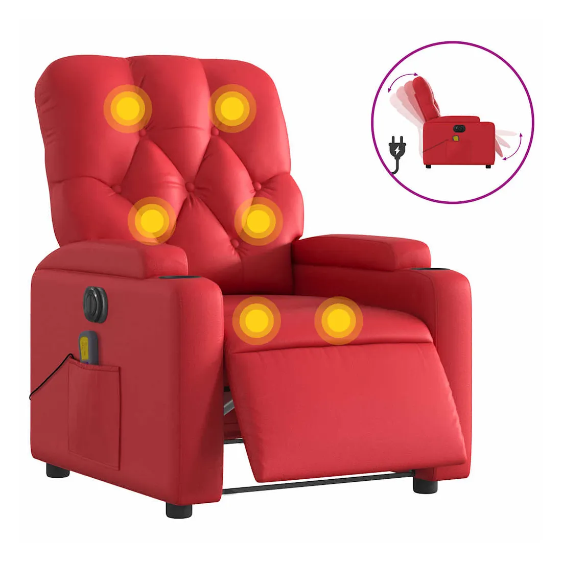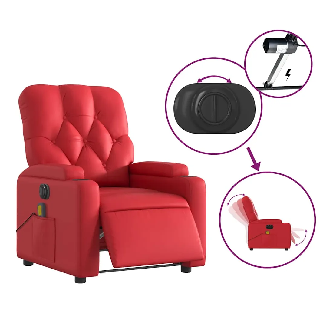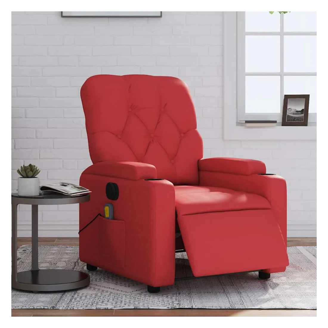 Asseyez-vous et détendez-vous dans ce fauteuil inclinable de massage électrique très confortable ! Fonction d'inclinaison électrique : ce fauteuil inclinable est équipé d'un moteur électrique qui permet de régler automatiquement le repose-pied et le dossier dans n'importe quelle position, selon votre confort, en appuyant simplement sur le bouton situé sur le côté du fauteuil. Cette fonction permet une inclinaison maximale de 135 degrés. En outre, le dossier peut revenir automatiquement à sa position d'origine par une simple pression sur le bouton.Fonction de vibration : les 6 points de massage vous permettent de faire l'expérience d'un massage mieux ciblé. De plus, la télécommande incluse vous permet de choisir différents programmes de massage. La fonction de massage est alimentée par le connecteur USB qui nécessite une source d'alimentation USB certifiée de 5 V (non fournie).Expérience de siège confortable : le siège, le dossier et les larges accoudoirs rembourrés épais recouverts de similicuir procurent une sensation confortable, vous faisant vous sentir enlacé lorsque vous êtes assis. Le similicuir est un matériau très résistant. Il est résistant aux taches, ce qui le rend facile à nettoyer avec un chiffon humide. La surface lisse donne également un aspect luxueux et la beauté du cuir véritable.Poche latérale pratique : ce fauteuil est doté d'une poche latérale pour ranger votre télécommande ou garder vos objets essentiels à portée de main.Cadre solide et stable : le cadre en bois et en métal offre une structure solide et une grande stabilité. Ce fauteuil inclinable est confortable et durable.