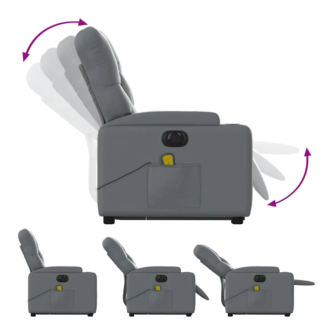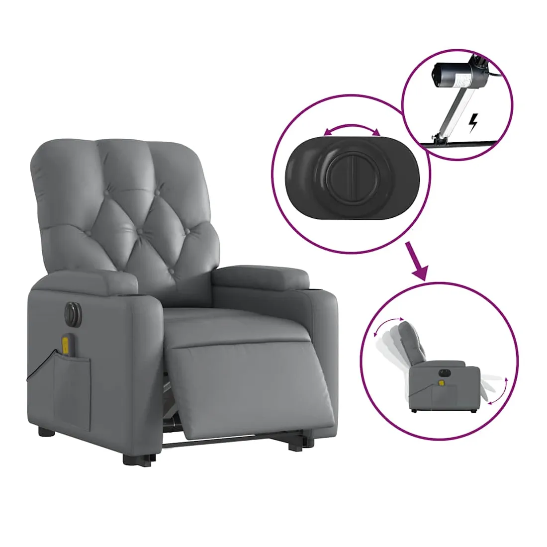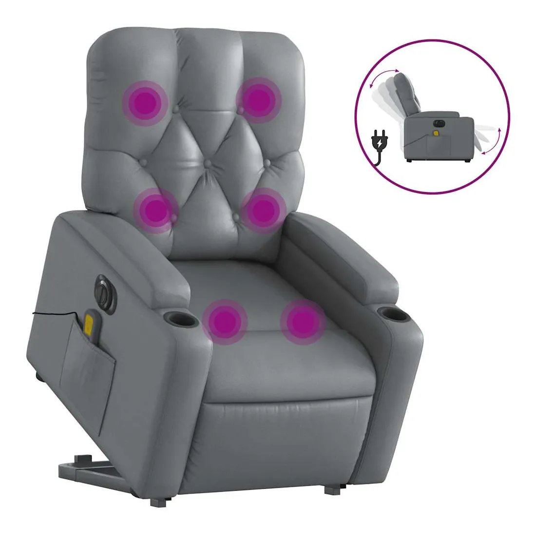 Asseyez-vous et détendez-vous dans ce fauteuil inclinable de massage électrique très confortable ! Fonction de levage électrique : ce fauteuil inclinable pour personnes âgées est équipé d'un moteur électrique pour la fonction de levage. Grâce à la fonction qui pousse toute la chaise vers le haut, vous pouvez facilement vous tenir debout sans stresser votre dos et vos genoux en appuyant simplement sur le bouton.Fonction d'inclinaison électrique : ce fauteuil inclinable est également équipé d'un moteur électrique qui permet de régler automatiquement le repose-pied et le dossier dans n'importe quelle position, selon votre confort, en appuyant simplement sur le bouton situé sur le côté du fauteuil. Cette fonction permet une inclinaison maximale de 135 degrés. En outre, le dossier peut revenir automatiquement à sa position d'origine par une simple pression sur le bouton.Fonction de vibration : les 6 points de massage vous permettent de faire l'expérience d'un massage mieux ciblé. De plus, la télécommande incluse vous permet de choisir différents programmes de massage. La fonction de massage est alimentée par le connecteur USB qui nécessite une source d'alimentation USB certifiée de 5 V (non fournie).Expérience de siège confortable : le siège, le dossier et les larges accoudoirs rembourrés épais recouverts de similicuir procurent une sensation confortable, vous faisant vous sentir enlacé lorsque vous êtes assis. Le similicuir est un matériau très résistant. Il est résistant aux taches, ce qui le rend facile à nettoyer avec un chiffon humide. La surface lisse donne également un aspect luxueux et la beauté du cuir véritable.Poche latérale pratique : ce fauteuil est doté d'une poche latérale pour ranger votre télécommande ou garder vos objets essentiels à portée de main.Cadre solide et stable : le cadre en bois et en métal offre une structure solide et une grande stabilité. Ce fauteuil inclinable est confortable et durable.