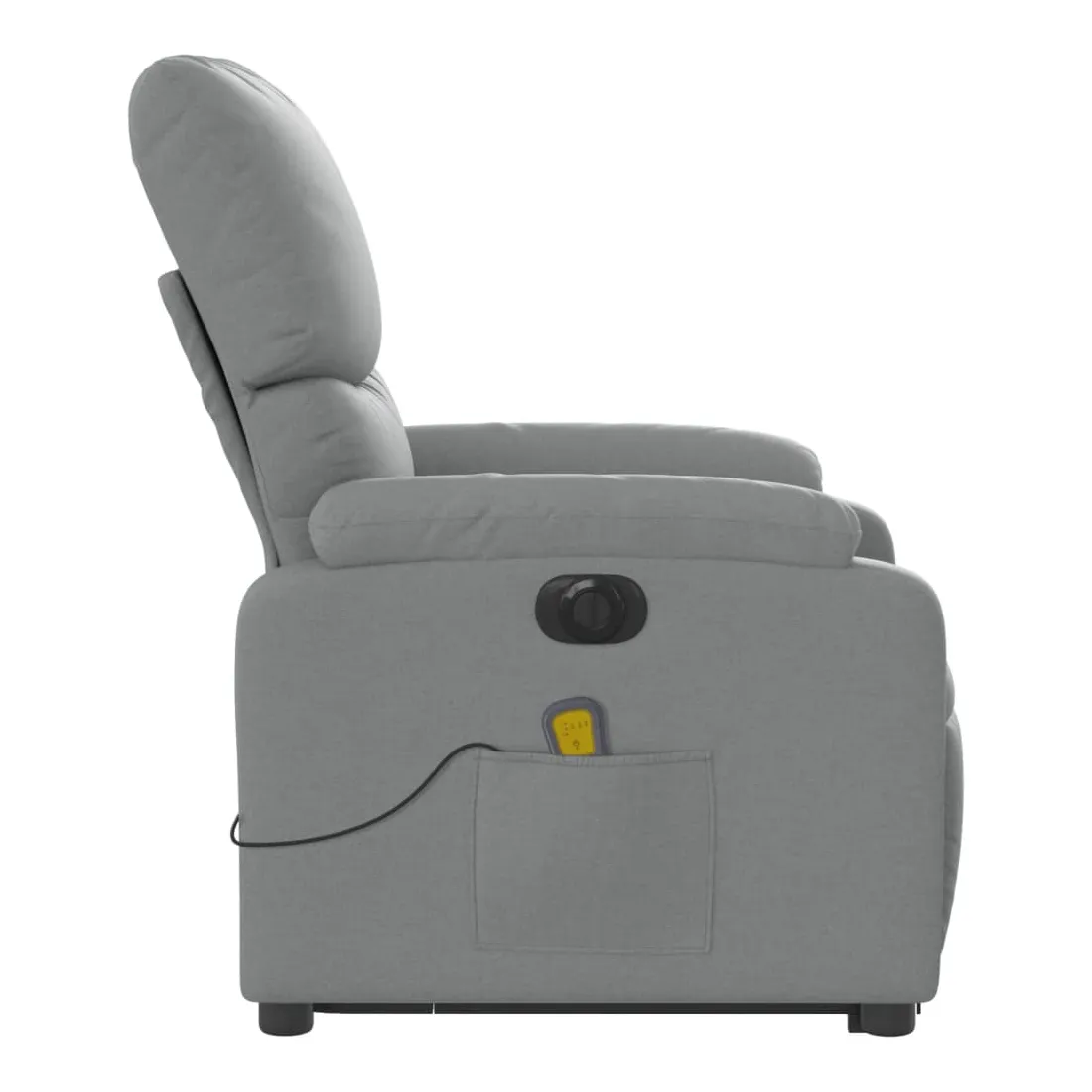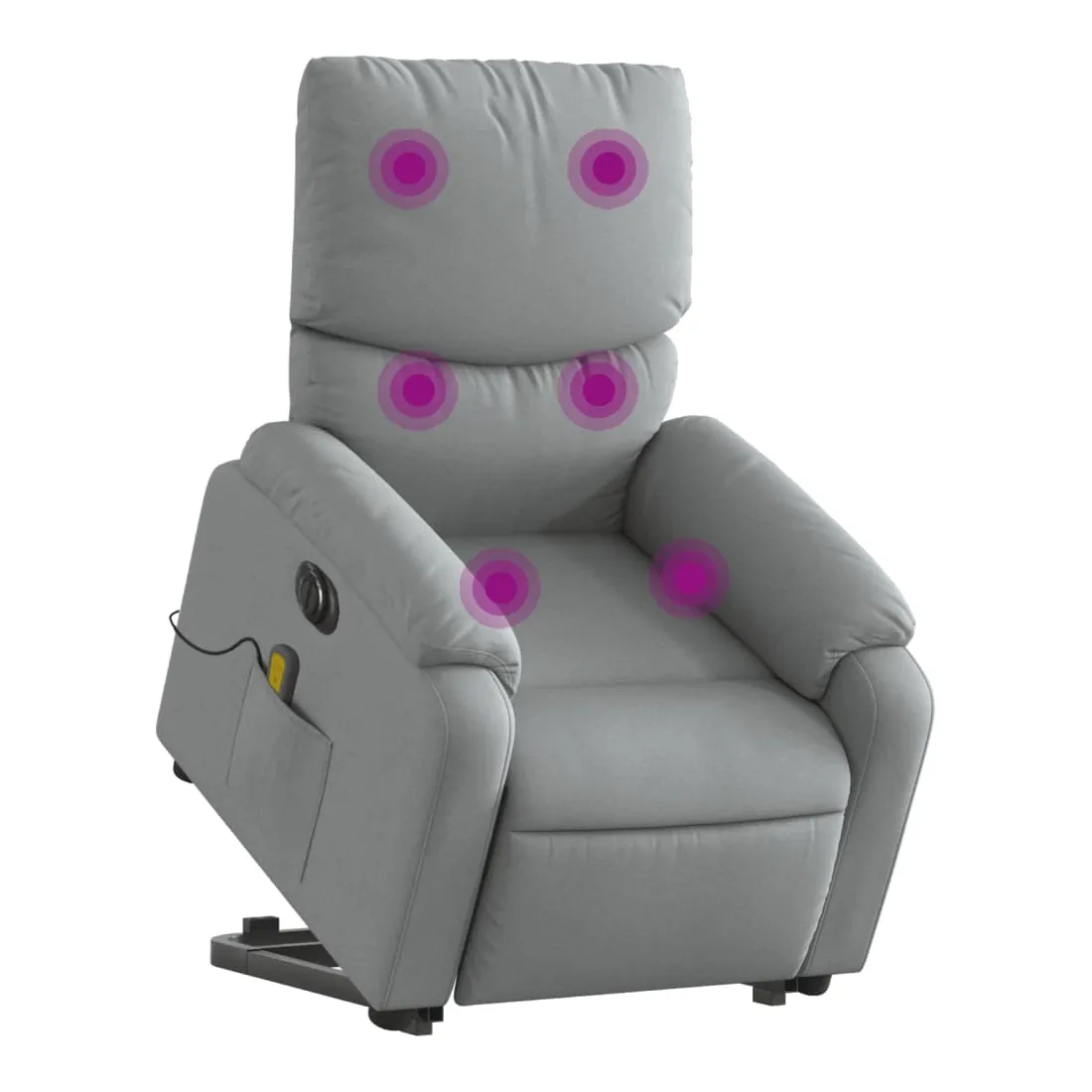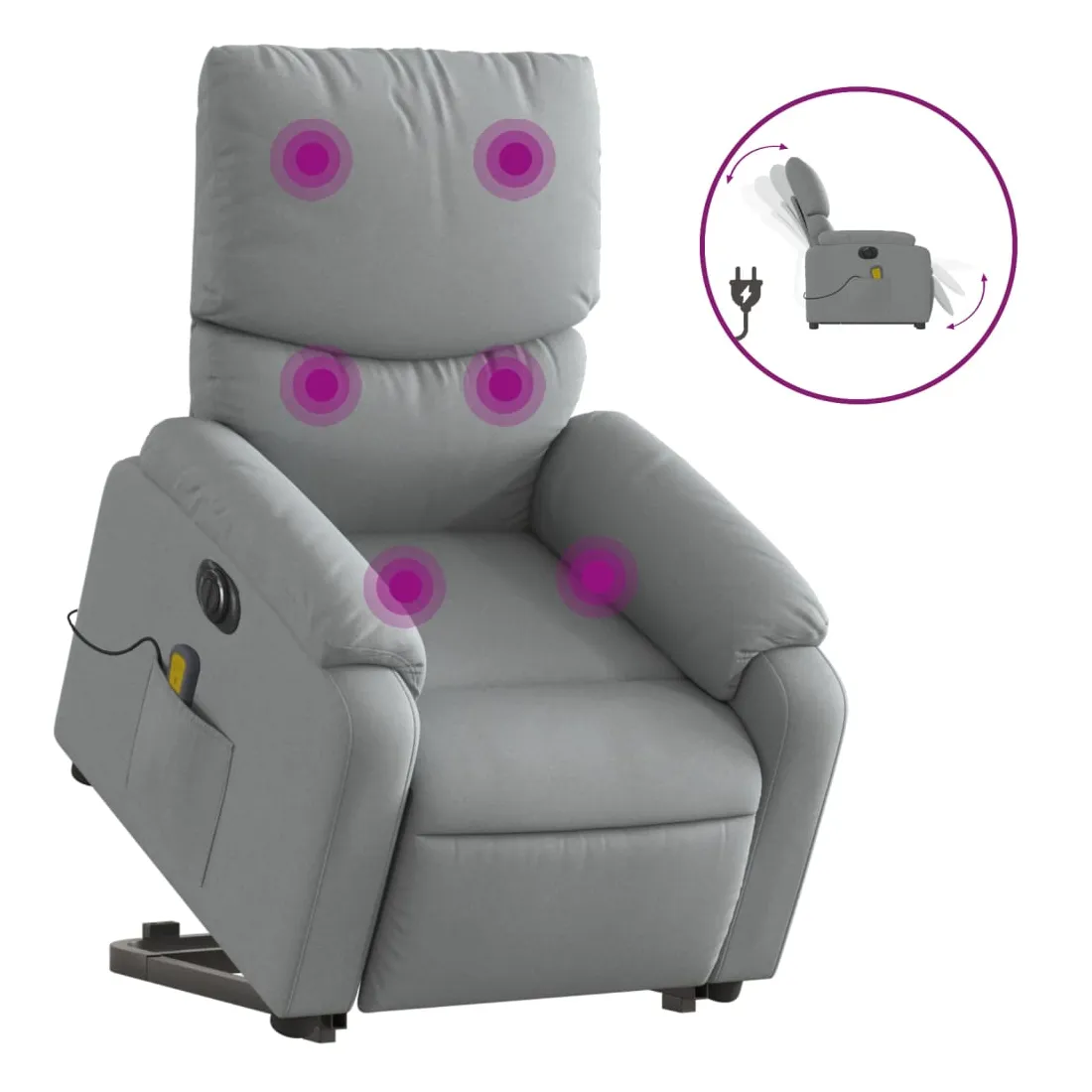 Asseyez-vous et détendez-vous dans ce fauteuil inclinable de massage électrique très confortable ! Fonction de levage électrique : ce fauteuil inclinable pour personnes âgées est équipé d'un moteur électrique pour la fonction de levage. Grâce à la fonction qui pousse toute la chaise vers le haut, vous pouvez facilement vous tenir debout sans stresser votre dos et vos genoux en appuyant simplement sur le bouton.Fonction d'inclinaison électrique : ce fauteuil inclinable est également équipé d'un moteur électrique qui permet de régler automatiquement le repose-pied et le dossier dans n'importe quelle position, selon votre confort, en appuyant simplement sur le bouton situé sur le côté du fauteuil. Cette fonction permet une inclinaison maximale de 135 degrés. En outre, le dossier peut revenir automatiquement à sa position d'origine par une simple pression sur le bouton.Fonction de vibration : les 6 points de massage vous permettent de faire l'expérience d'un massage mieux ciblé. De plus, la télécommande incluse vous permet de choisir différents programmes de massage. La fonction de massage est alimentée par le connecteur USB qui nécessite une source d'alimentation USB certifiée de 5 V (non fournie).Expérience d'assise confortable : le siège, le dossier et les larges accoudoirs bien rembourrés recouverts de tissu procurent une sensation confortable et chaleureuse, vous permettant de vous sentir enveloppé lorsque vous êtes assis. Le tissu présente un aspect simple et épuré et est respirant et durable.Poche latérale pratique : ce fauteuil est doté d'une poche latérale pour ranger votre télécommande ou garder vos objets essentiels à portée de main.Cadre solide et stable : le cadre en bois et en métal offre une structure solide et une grande stabilité. Ce fauteuil inclinable est confortable et durable.