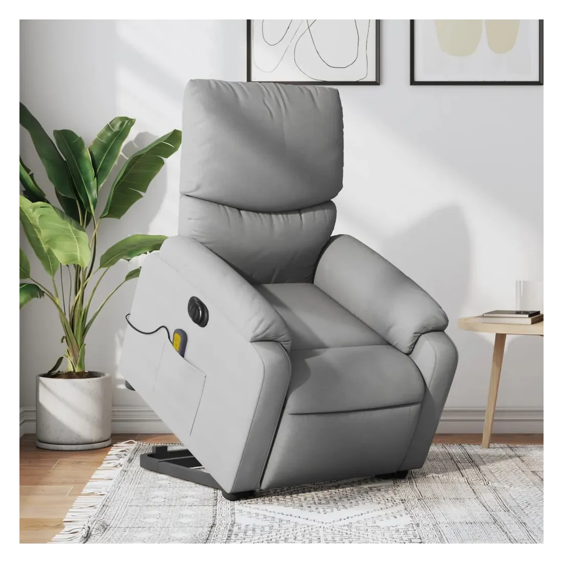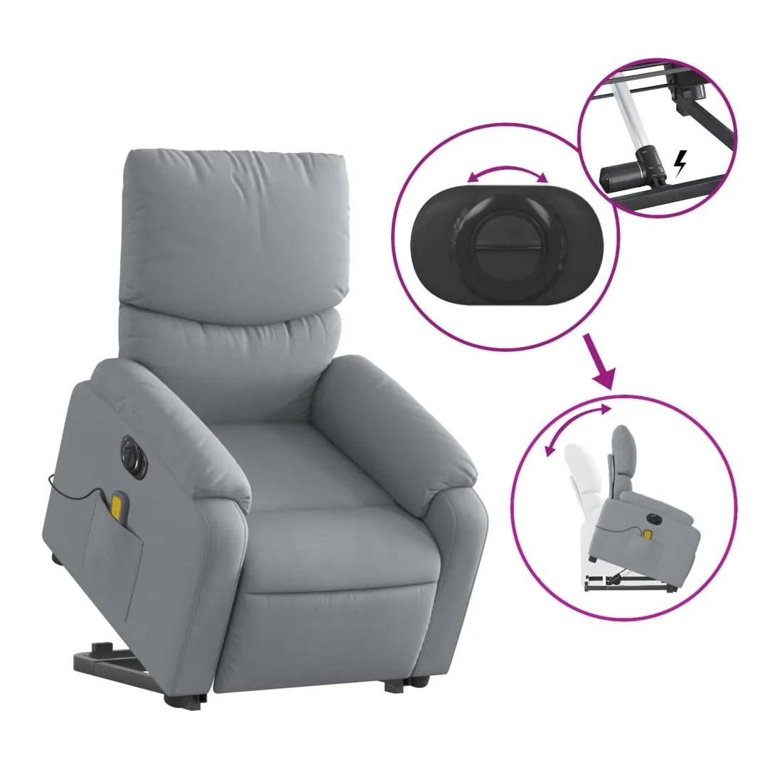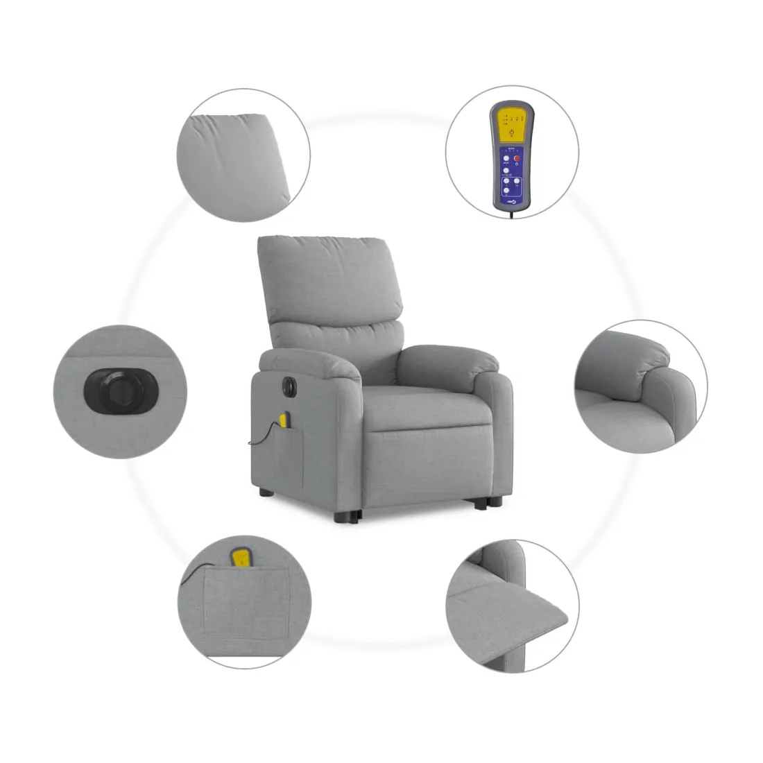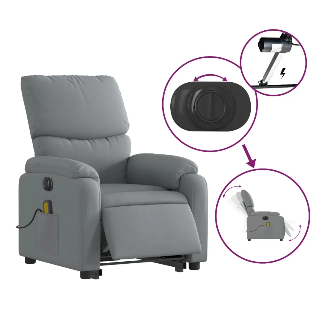 Asseyez-vous et détendez-vous dans ce fauteuil inclinable de massage électrique très confortable ! Fonction de levage électrique : ce fauteuil inclinable pour personnes âgées est équipé d'un moteur électrique pour la fonction de levage. Grâce à la fonction qui pousse toute la chaise vers le haut, vous pouvez facilement vous tenir debout sans stresser votre dos et vos genoux en appuyant simplement sur le bouton.Fonction d'inclinaison électrique : ce fauteuil inclinable est également équipé d'un moteur électrique qui permet de régler automatiquement le repose-pied et le dossier dans n'importe quelle position, selon votre confort, en appuyant simplement sur le bouton situé sur le côté du fauteuil. Cette fonction permet une inclinaison maximale de 135 degrés. En outre, le dossier peut revenir automatiquement à sa position d'origine par une simple pression sur le bouton.Fonction de vibration : les 6 points de massage vous permettent de faire l'expérience d'un massage mieux ciblé. De plus, la télécommande incluse vous permet de choisir différents programmes de massage. La fonction de massage est alimentée par le connecteur USB qui nécessite une source d'alimentation USB certifiée de 5 V (non fournie).Expérience d'assise confortable : le siège, le dossier et les larges accoudoirs bien rembourrés recouverts de tissu procurent une sensation confortable et chaleureuse, vous permettant de vous sentir enveloppé lorsque vous êtes assis. Le tissu présente un aspect simple et épuré et est respirant et durable.Poche latérale pratique : ce fauteuil est doté d'une poche latérale pour ranger votre télécommande ou garder vos objets essentiels à portée de main.Cadre solide et stable : le cadre en bois et en métal offre une structure solide et une grande stabilité. Ce fauteuil inclinable est confortable et durable.