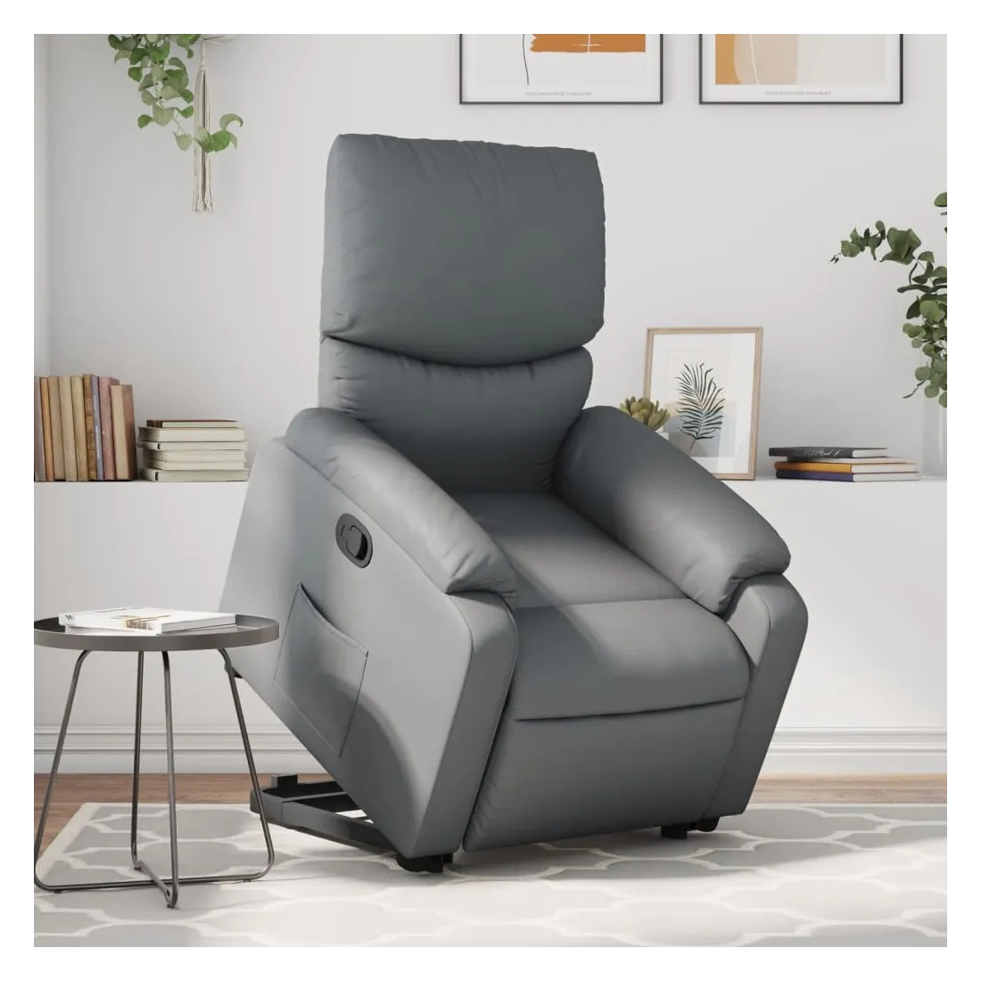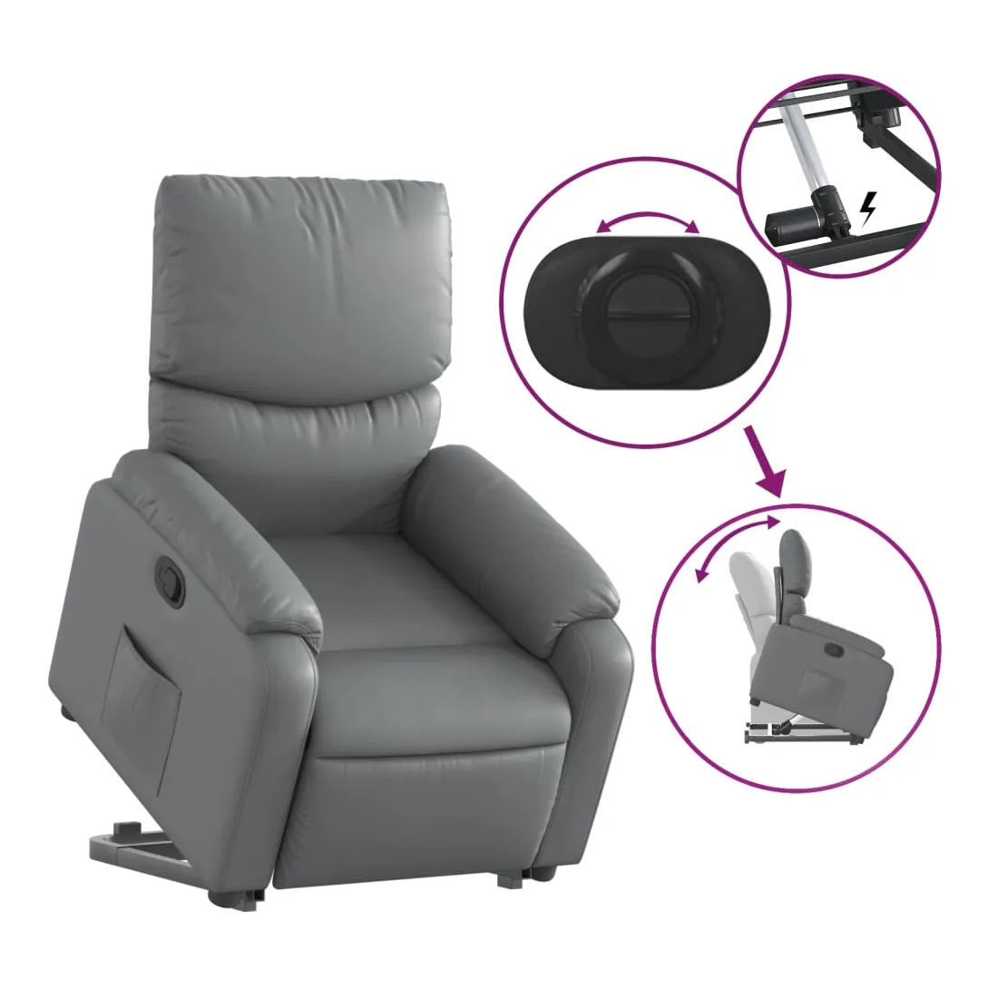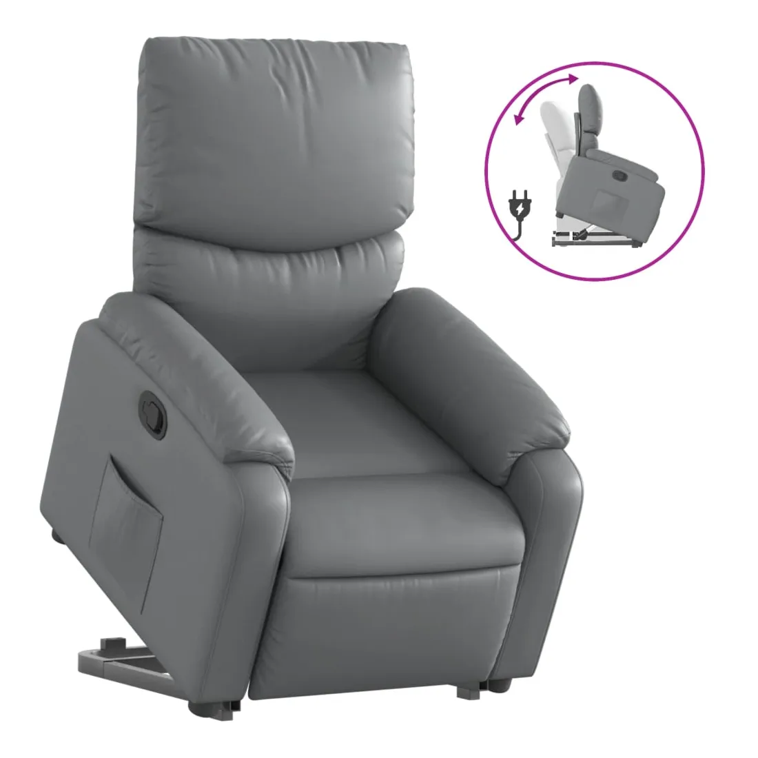 Asseyez-vous et détendez-vous dans ce fauteuil inclinable très confortable ! Fonction de levage électrique : ce fauteuil inclinable pour personnes âgées est équipé d'un moteur électrique pour la fonction de levage. Grâce à la fonction qui pousse toute la chaise vers le haut, vous pouvez facilement vous tenir debout sans stresser votre dos et vos genoux en appuyant simplement sur le bouton.Fonction d'inclinaison manuelle : ce fauteuil inclinable est doté d'une poignée du côté droit. Vous pouvez régler manuellement le repose-pieds et le dossier dans n'importe quelle position selon votre confort en tirant simplement sur la poignée. Cette fonction permet une inclinaison maximale de 135 degrés. De plus, le dossier peut revenir rapidement à sa position d'origine en tirant simplement sur la poignée.Expérience de siège confortable : le siège, le dossier et les larges accoudoirs rembourrés épais recouverts de similicuir procurent une sensation confortable, vous faisant vous sentir enlacé lorsque vous êtes assis. Le similicuir est un matériau très résistant. Il est résistant aux taches, ce qui le rend facile à nettoyer avec un chiffon humide. La surface lisse donne également un aspect luxueux et la beauté du cuir véritable.Poche latérale pratique : ce fauteuil est doté d'une poche latérale pour vous permettre de garder vos objets essentiels à portée de main.Cadre solide et stable : le cadre en bois et en métal offre une structure solide et une grande stabilité. Ce fauteuil inclinable est confortable et durable.