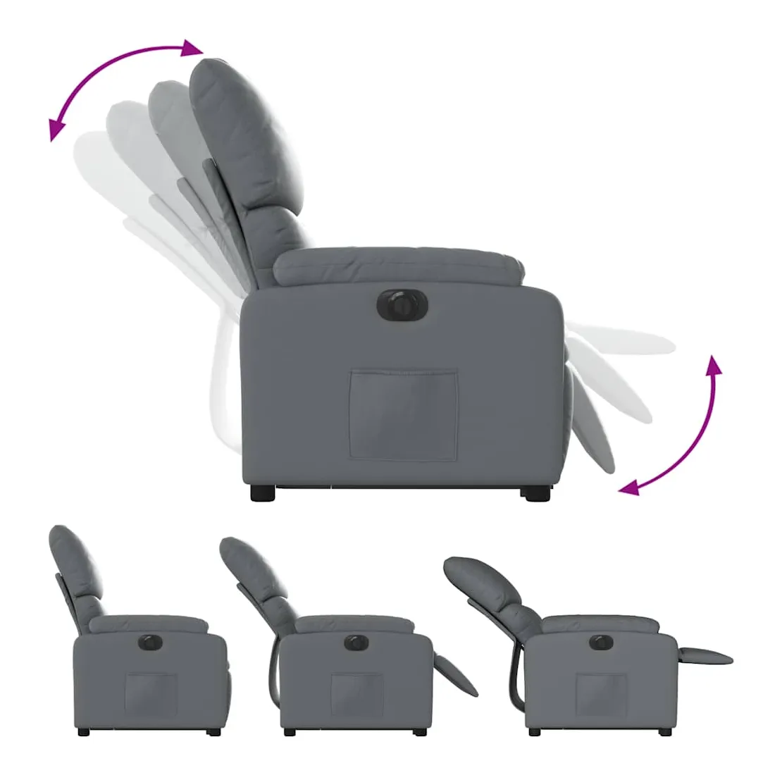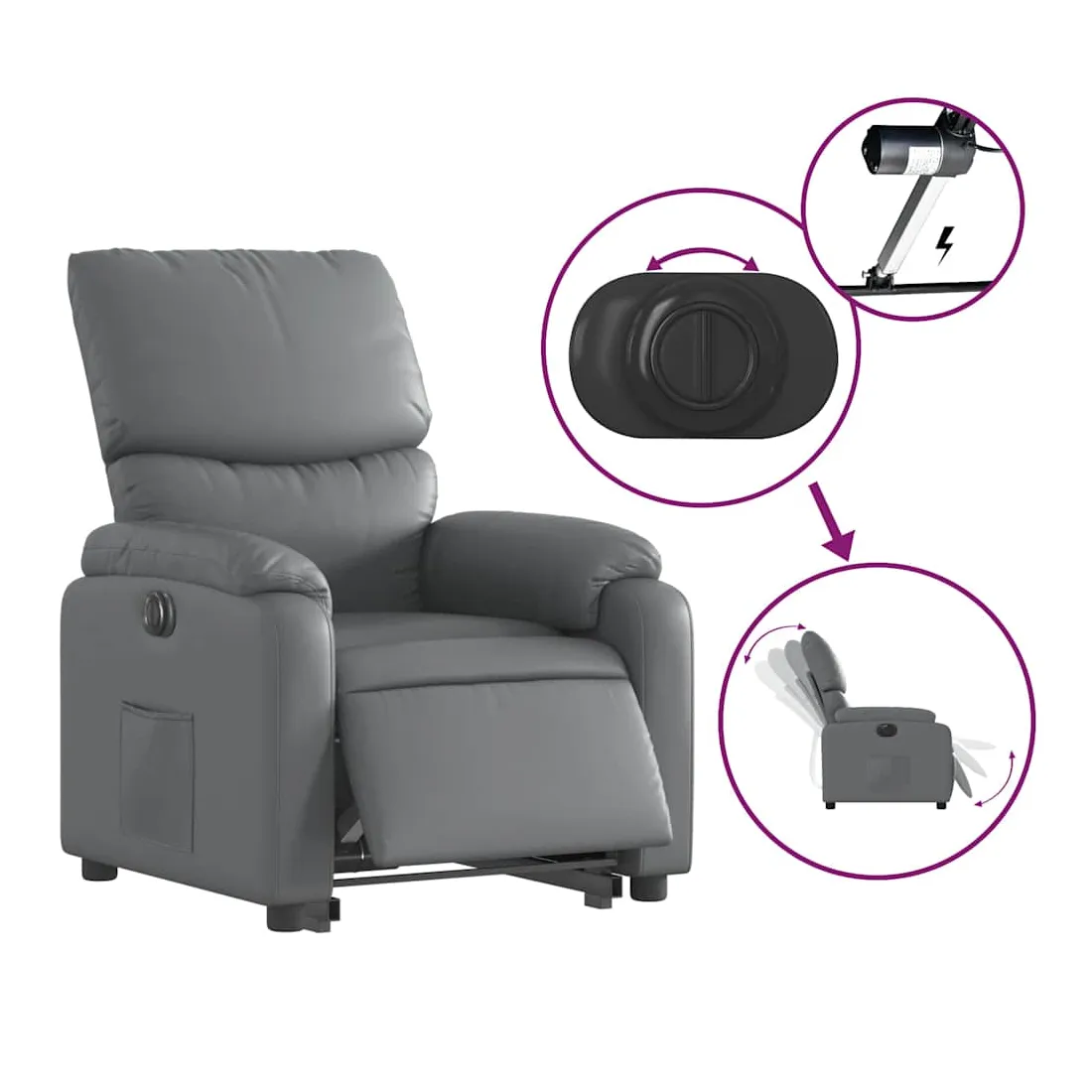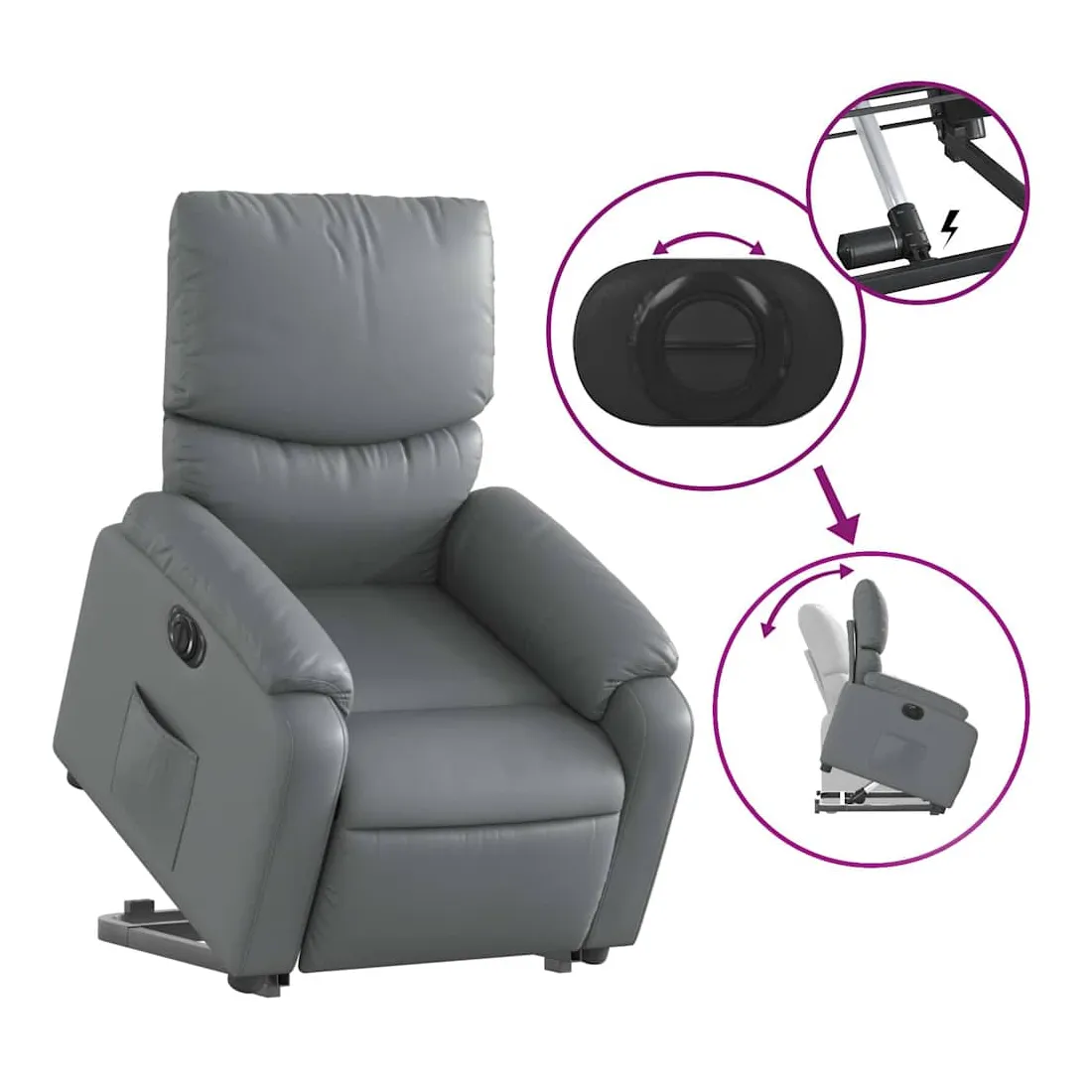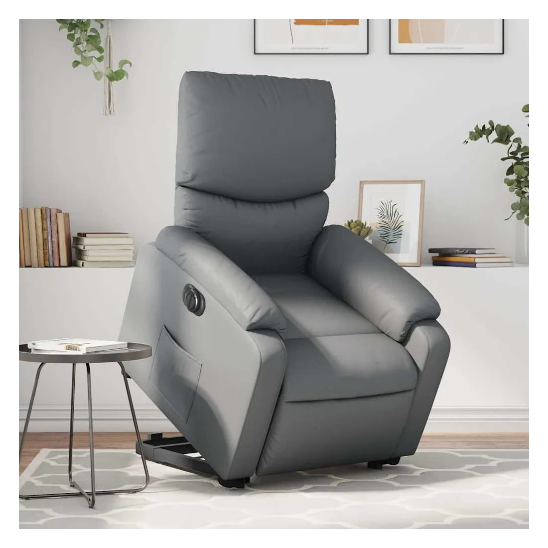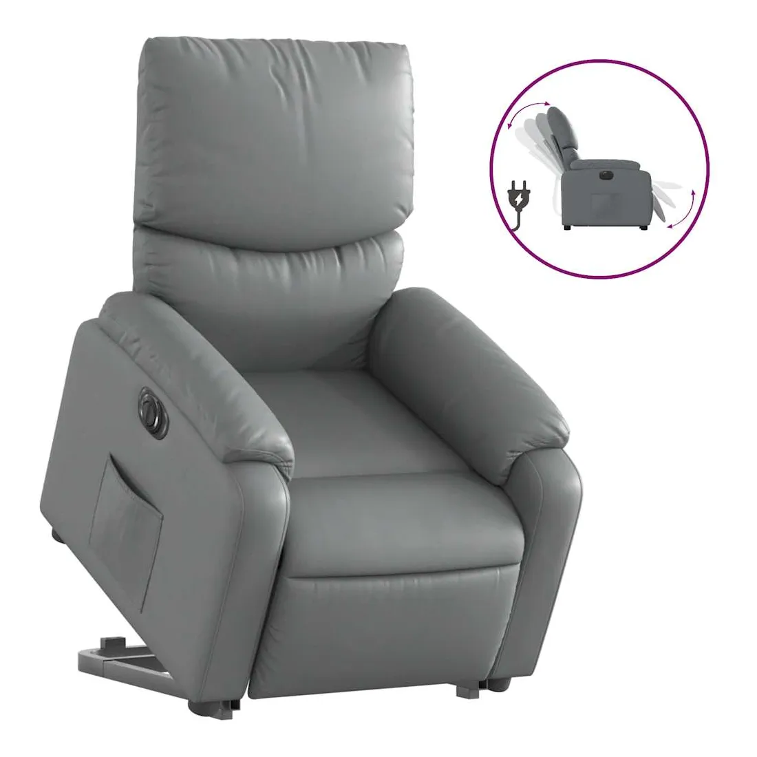 Asseyez-vous et détendez-vous dans ce fauteuil inclinable électrique très confortable ! Fonction de levage électrique : ce fauteuil inclinable pour personnes âgées est équipé d'un moteur électrique pour la fonction de levage. Grâce à la fonction qui pousse toute la chaise vers le haut, vous pouvez facilement vous tenir debout sans stresser votre dos et vos genoux en appuyant simplement sur le bouton.Fonction d'inclinaison électrique : ce fauteuil inclinable est également équipé d'un moteur électrique qui permet de régler automatiquement le repose-pied et le dossier dans n'importe quelle position, selon votre confort, en appuyant simplement sur le bouton situé sur le côté du fauteuil. Cette fonction permet une inclinaison maximale de 135 degrés. En outre, le dossier peut revenir automatiquement à sa position d'origine par une simple pression sur le bouton.Expérience de siège confortable : le siège, le dossier et les larges accoudoirs rembourrés épais recouverts de similicuir procurent une sensation confortable, vous faisant vous sentir enlacé lorsque vous êtes assis. Le similicuir est un matériau très résistant. Il est résistant aux taches, ce qui le rend facile à nettoyer avec un chiffon humide. La surface lisse donne également un aspect luxueux et la beauté du cuir véritable.Poche latérale pratique : ce fauteuil est doté d'une poche latérale pour vous permettre de garder vos objets essentiels à portée de main.Cadre solide et stable : le cadre en bois et en métal offre une structure solide et une grande stabilité. Ce fauteuil inclinable est confortable et durable.