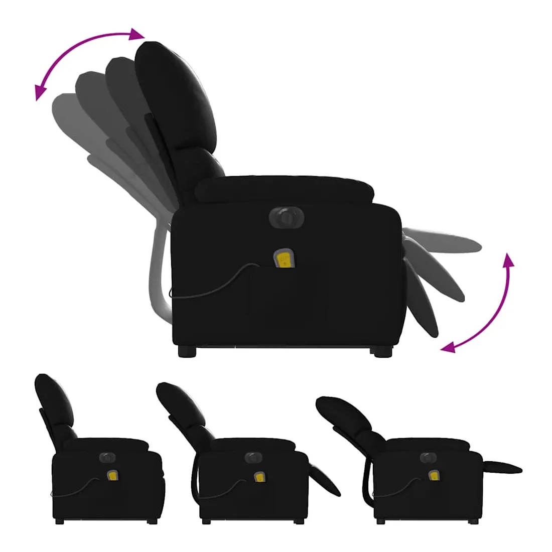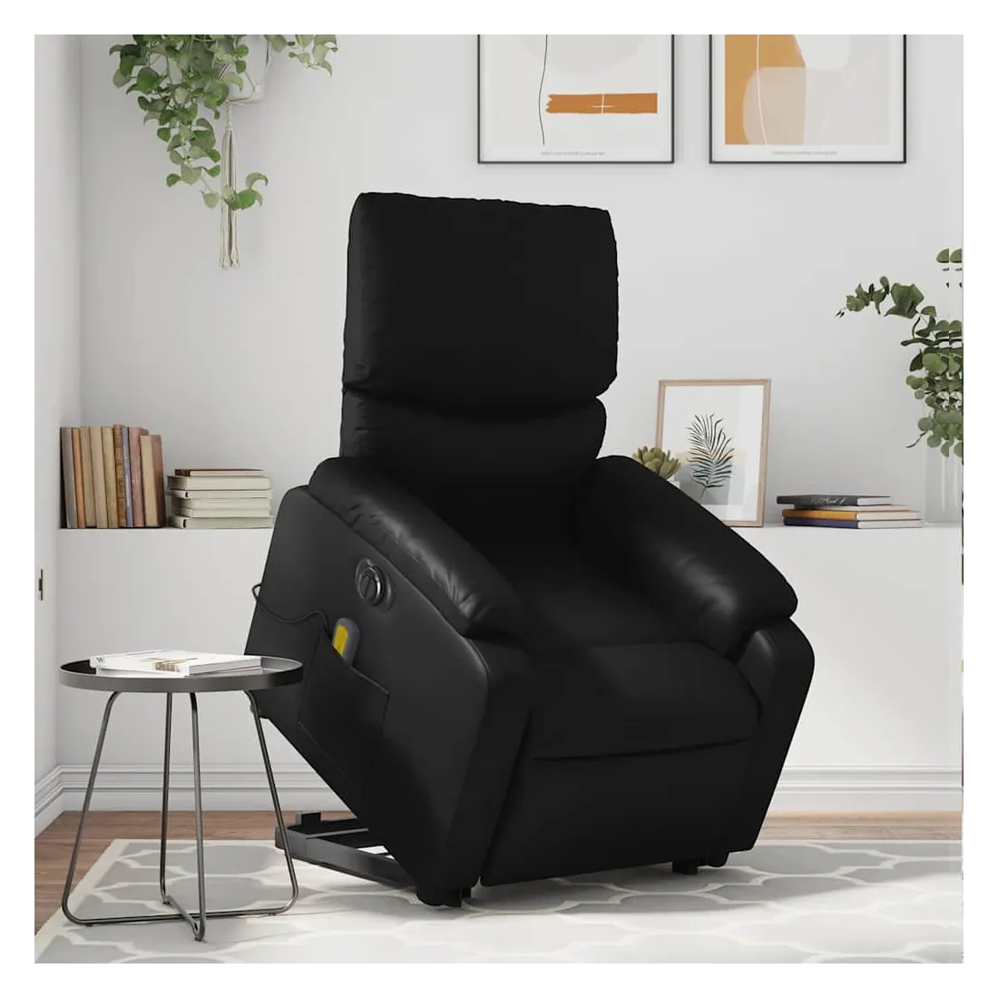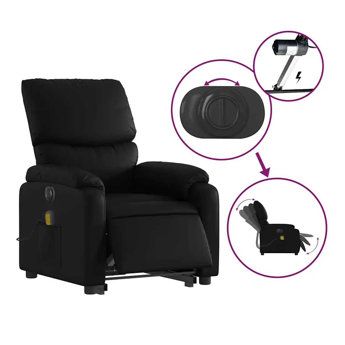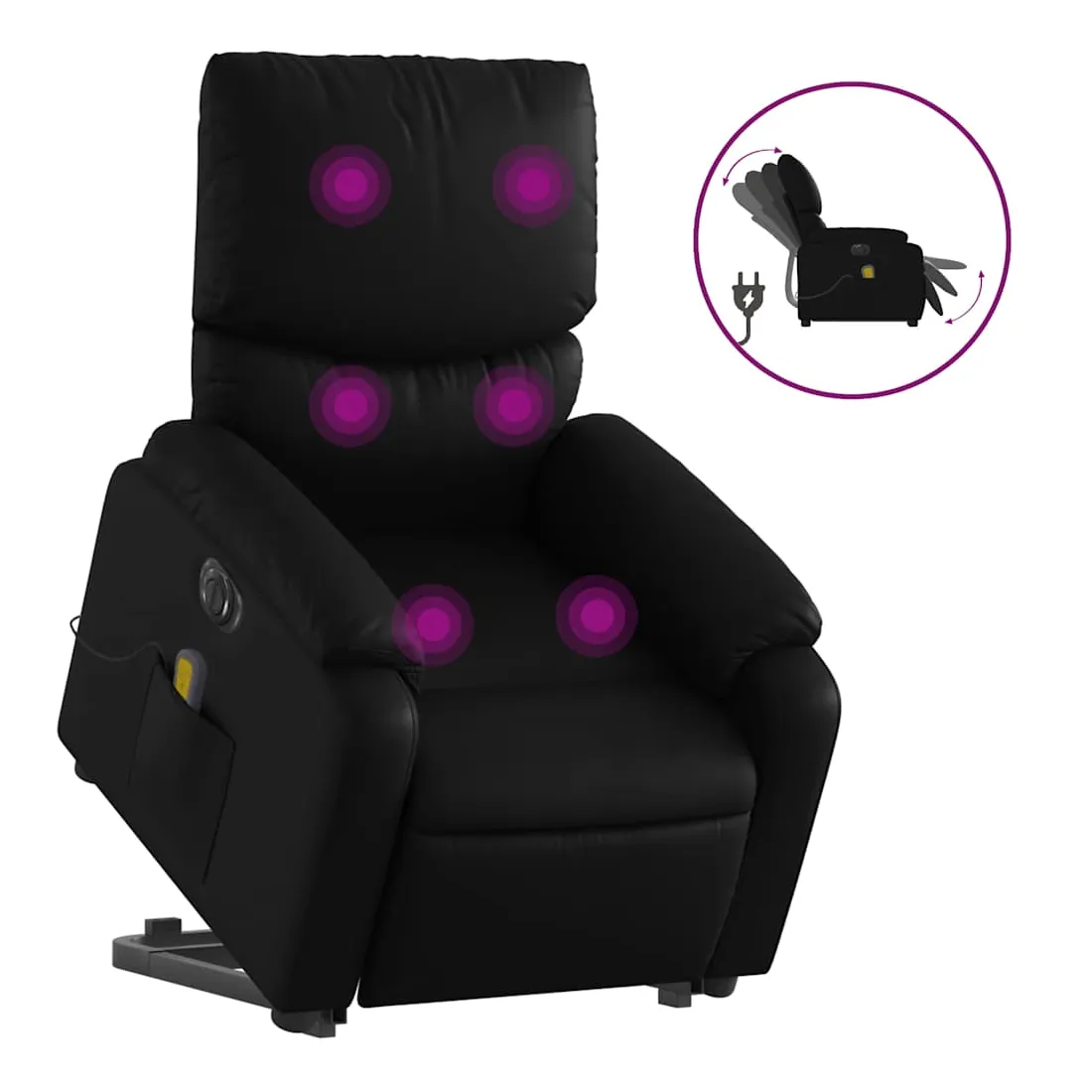 Asseyez-vous et détendez-vous dans ce fauteuil inclinable de massage électrique très confortable ! Fonction de levage électrique : ce fauteuil inclinable pour personnes âgées est équipé d'un moteur électrique pour la fonction de levage. Grâce à la fonction qui pousse toute la chaise vers le haut, vous pouvez facilement vous tenir debout sans stresser votre dos et vos genoux en appuyant simplement sur le bouton.Fonction d'inclinaison électrique : ce fauteuil inclinable est également équipé d'un moteur électrique qui permet de régler automatiquement le repose-pied et le dossier dans n'importe quelle position, selon votre confort, en appuyant simplement sur le bouton situé sur le côté du fauteuil. Cette fonction permet une inclinaison maximale de 135 degrés. En outre, le dossier peut revenir automatiquement à sa position d'origine par une simple pression sur le bouton.Fonction de vibration : les 6 points de massage vous permettent de faire l'expérience d'un massage mieux ciblé. De plus, la télécommande incluse vous permet de choisir différents programmes de massage. La fonction de massage est alimentée par le connecteur USB qui nécessite une source d'alimentation USB certifiée de 5 V (non fournie).Expérience de siège confortable : le siège, le dossier et les larges accoudoirs rembourrés épais recouverts de similicuir procurent une sensation confortable, vous faisant vous sentir enlacé lorsque vous êtes assis. Le similicuir est un matériau très résistant. Il est résistant aux taches, ce qui le rend facile à nettoyer avec un chiffon humide. La surface lisse donne également un aspect luxueux et la beauté du cuir véritable.Poche latérale pratique : ce fauteuil est doté d'une poche latérale pour ranger votre télécommande ou garder vos objets essentiels à portée de main.Cadre solide et stable : le cadre en bois et en métal offre une structure solide et une grande stabilité. Ce fauteuil inclinable est confortable et durable.