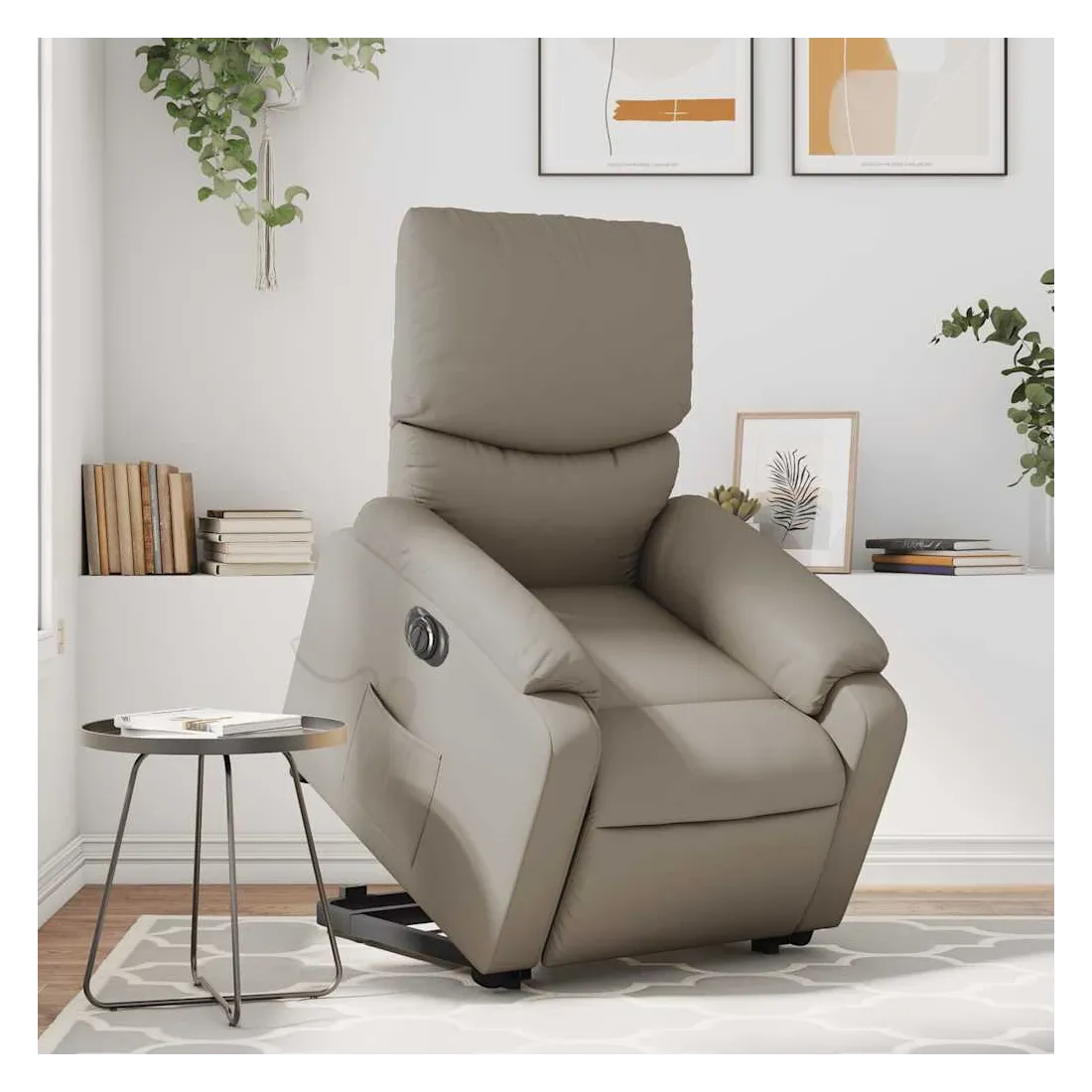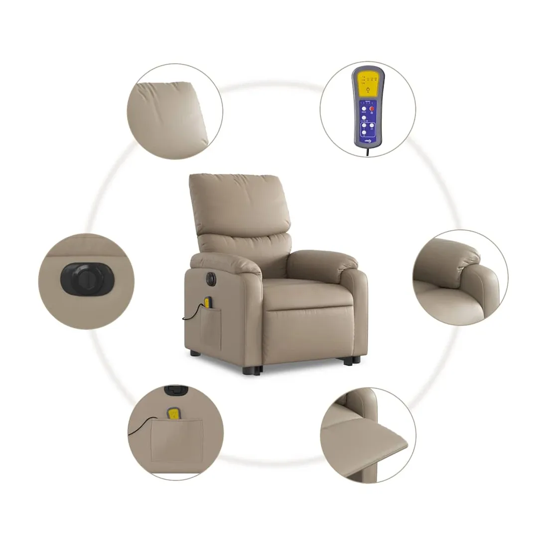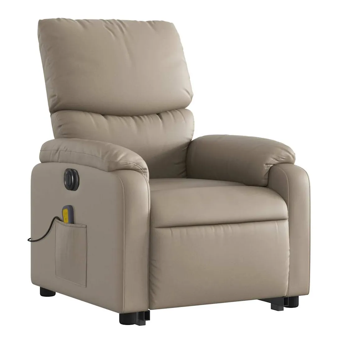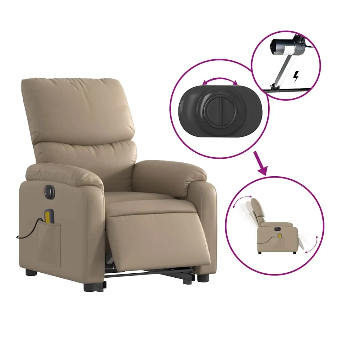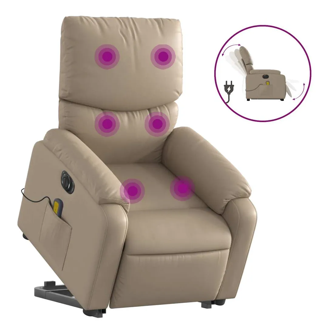 Asseyez-vous et détendez-vous dans ce fauteuil inclinable de massage électrique très confortable ! Fonction de levage électrique : ce fauteuil inclinable pour personnes âgées est équipé d'un moteur électrique pour la fonction de levage. Grâce à la fonction qui pousse toute la chaise vers le haut, vous pouvez facilement vous tenir debout sans stresser votre dos et vos genoux en appuyant simplement sur le bouton.Fonction d'inclinaison électrique : ce fauteuil inclinable est également équipé d'un moteur électrique qui permet de régler automatiquement le repose-pied et le dossier dans n'importe quelle position, selon votre confort, en appuyant simplement sur le bouton situé sur le côté du fauteuil. Cette fonction permet une inclinaison maximale de 135 degrés. En outre, le dossier peut revenir automatiquement à sa position d'origine par une simple pression sur le bouton.Fonction de vibration : les 6 points de massage vous permettent de faire l'expérience d'un massage mieux ciblé. De plus, la télécommande incluse vous permet de choisir différents programmes de massage. La fonction de massage est alimentée par le connecteur USB qui nécessite une source d'alimentation USB certifiée de 5 V (non fournie).Expérience de siège confortable : le siège, le dossier et les larges accoudoirs rembourrés épais recouverts de similicuir procurent une sensation confortable, vous faisant vous sentir enlacé lorsque vous êtes assis. Le similicuir est un matériau très résistant. Il est résistant aux taches, ce qui le rend facile à nettoyer avec un chiffon humide. La surface lisse donne également un aspect luxueux et la beauté du cuir véritable.Poche latérale pratique : ce fauteuil est doté d'une poche latérale pour ranger votre télécommande ou garder vos objets essentiels à portée de main.Cadre solide et stable : le cadre en bois et en métal offre une structure solide et une grande stabilité. Ce fauteuil inclinable est confortable et durable.