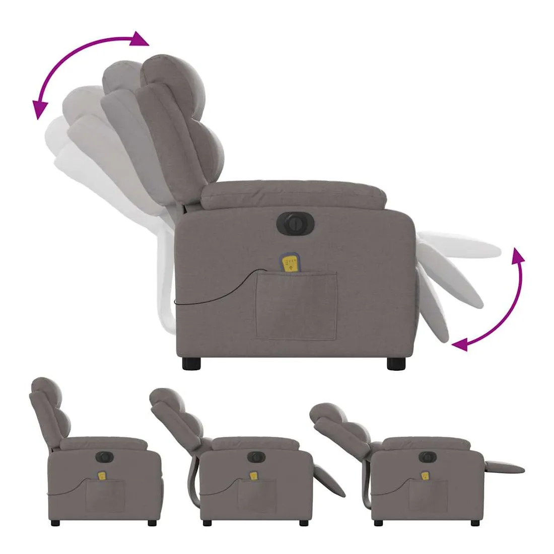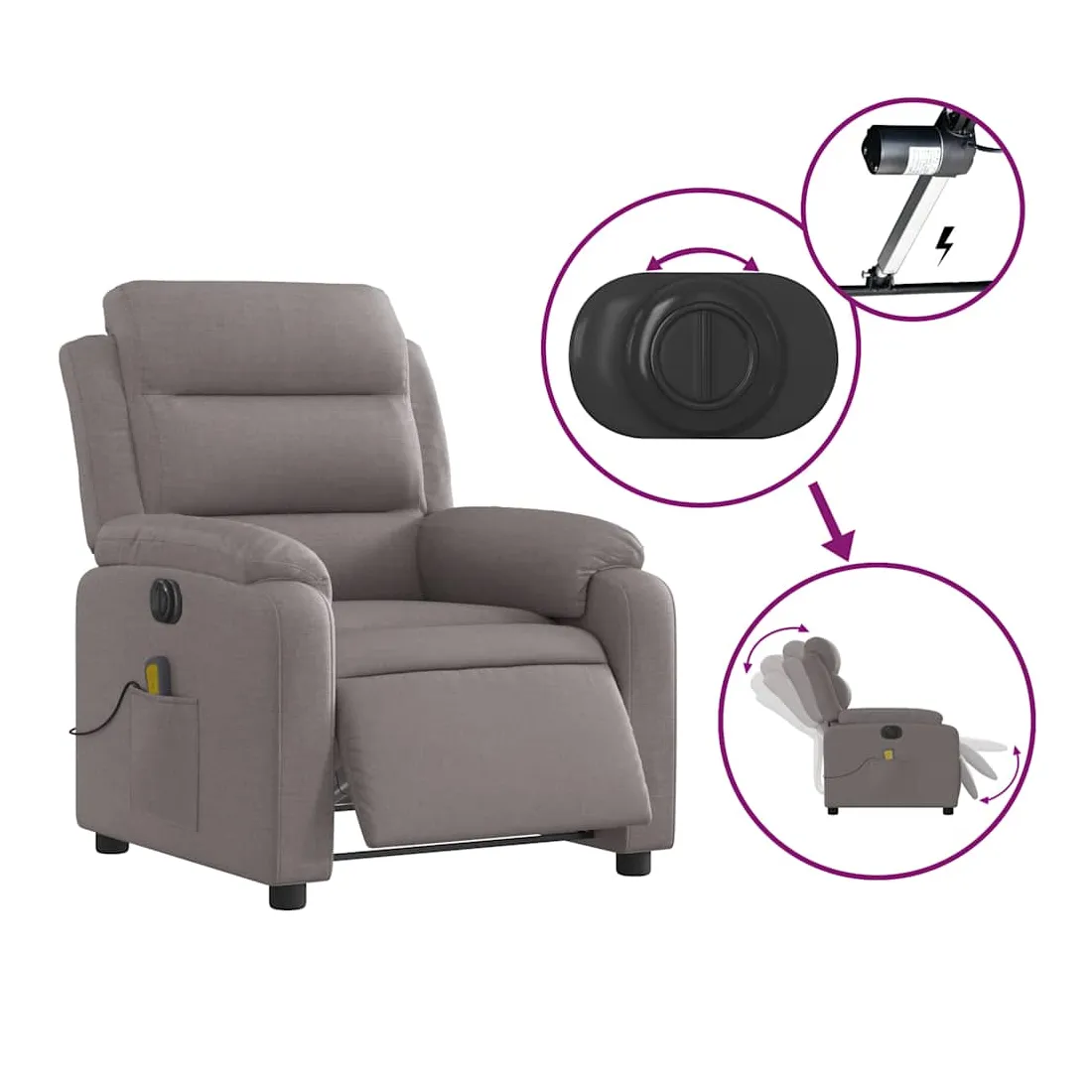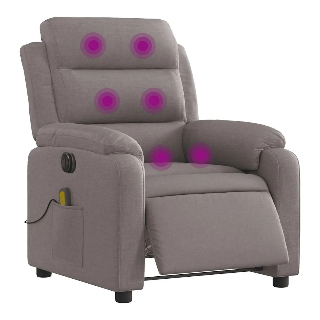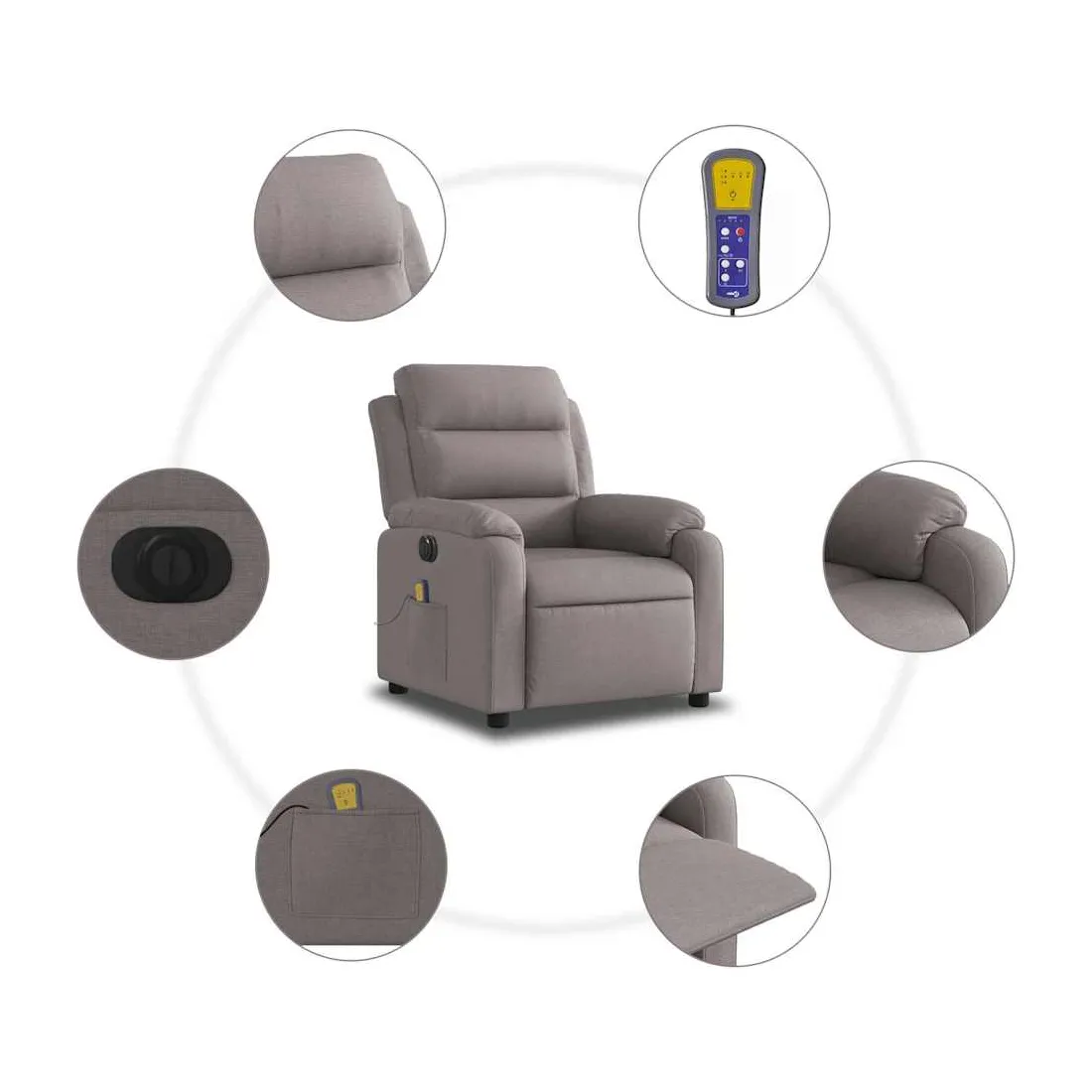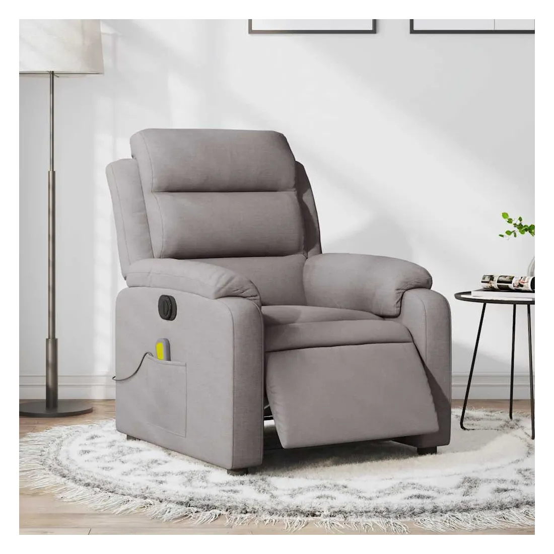 Asseyez-vous et détendez-vous dans ce fauteuil inclinable de massage électrique très confortable ! Fonction d'inclinaison électrique : ce fauteuil inclinable est équipé d'un moteur électrique qui permet de régler automatiquement le repose-pied et le dossier dans n'importe quelle position, selon votre confort, en appuyant simplement sur le bouton situé sur le côté du fauteuil. Cette fonction permet une inclinaison maximale de 135 degrés. En outre, le dossier peut revenir automatiquement à sa position d'origine par une simple pression sur le bouton.Fonction de vibration : les 6 points de massage vous permettent de faire l'expérience d'un massage mieux ciblé. De plus, la télécommande incluse vous permet de choisir différents programmes de massage. La fonction de massage est alimentée par le connecteur USB qui nécessite une source d'alimentation USB certifiée de 5 V (non fournie).Expérience d'assise confortable : le siège, le dossier et les larges accoudoirs bien rembourrés recouverts de tissu procurent une sensation confortable et chaleureuse, vous permettant de vous sentir enveloppé lorsque vous êtes assis. Le tissu présente un aspect simple et épuré et est respirant et durable.Poche latérale pratique : ce fauteuil est doté d'une poche latérale pour ranger votre télécommande ou garder vos objets essentiels à portée de main.Cadre solide et stable : le cadre en bois et en métal offre une structure solide et une grande stabilité. Ce fauteuil inclinable est confortable et durable.