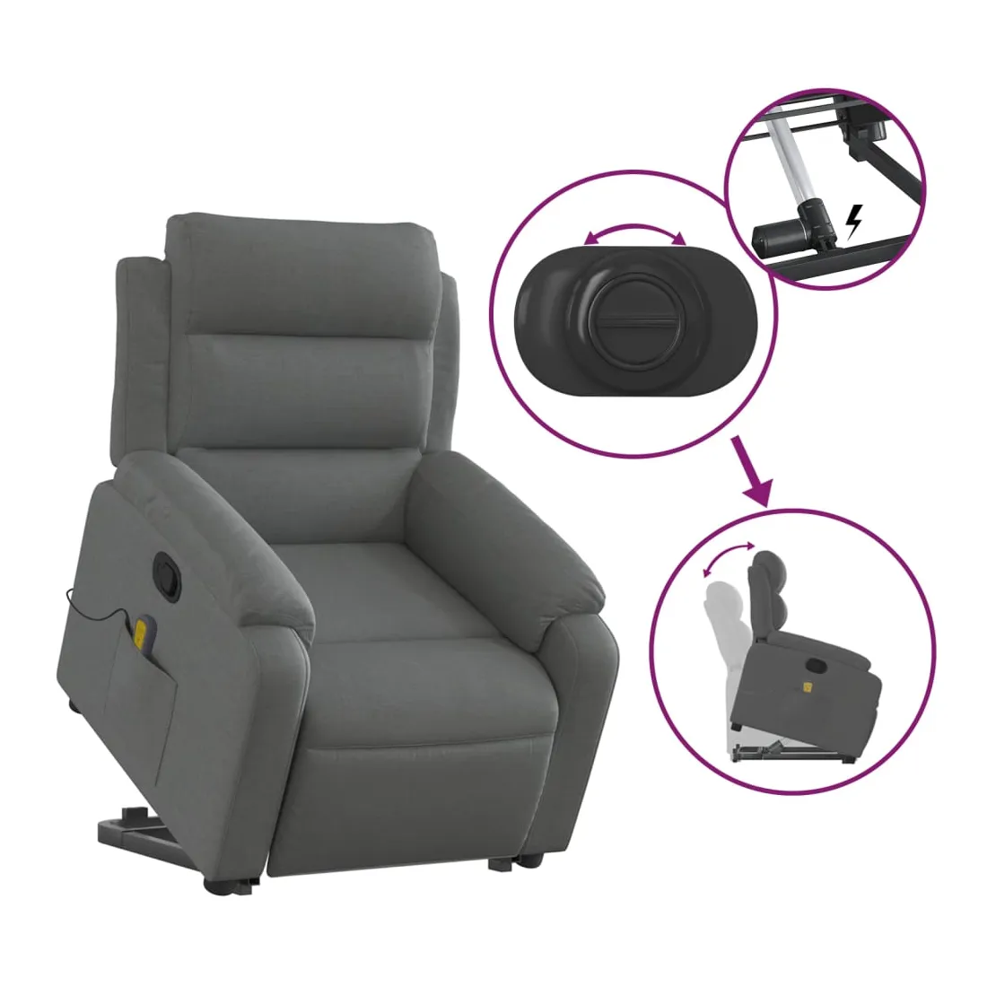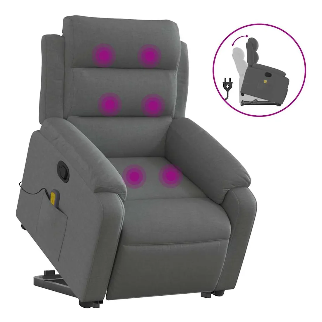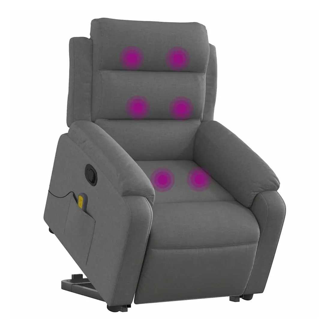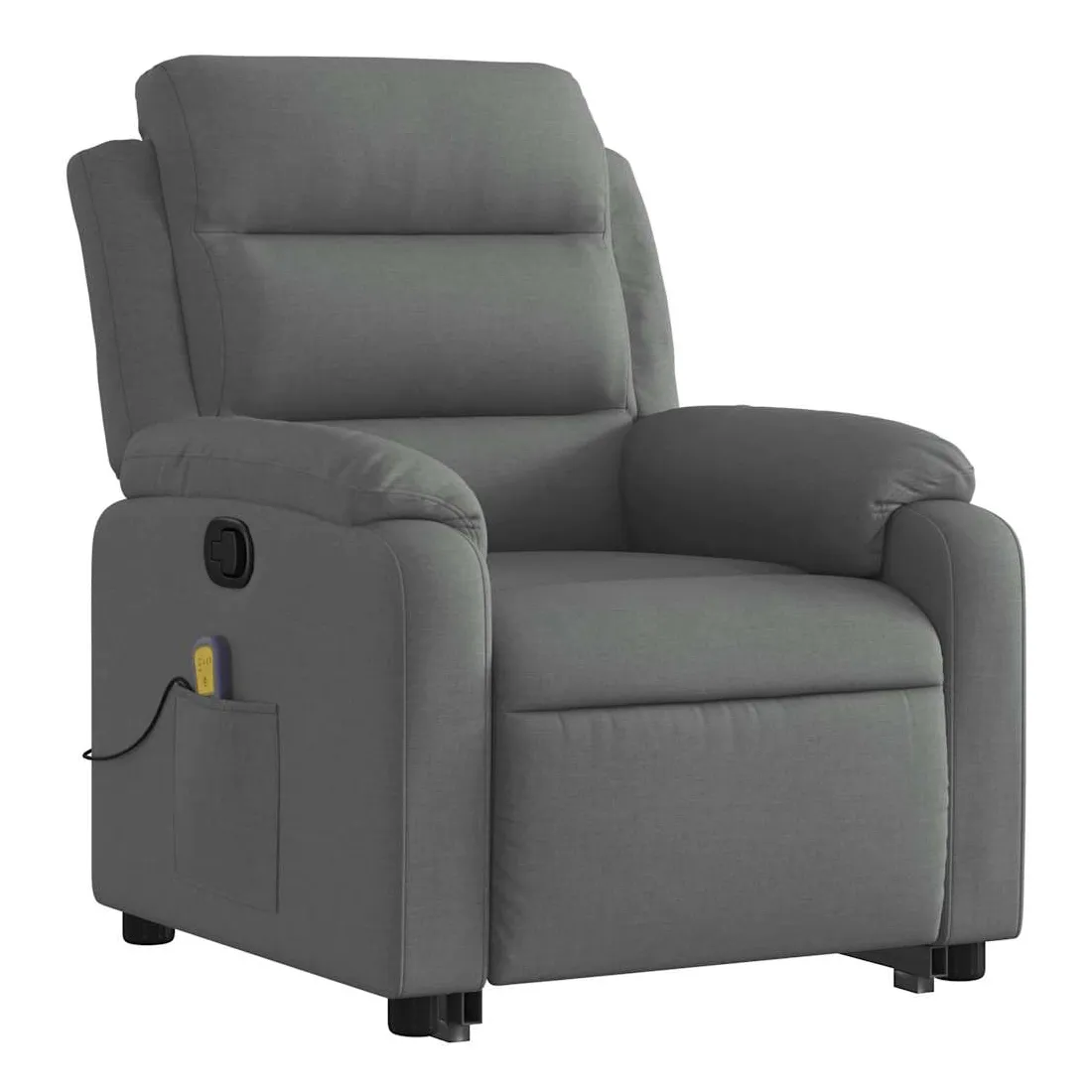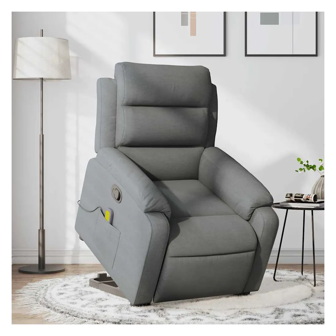 Asseyez-vous et détendez-vous dans ce fauteuil inclinable de massage très confortable ! Fonction de levage électrique : ce fauteuil inclinable pour personnes âgées est équipé d'un moteur électrique pour la fonction de levage. Grâce à la fonction qui pousse toute la chaise vers le haut, vous pouvez facilement vous tenir debout sans stresser votre dos et vos genoux en appuyant simplement sur le bouton.Fonction d'inclinaison manuelle : ce fauteuil inclinable est doté d'une poignée du côté droit. Vous pouvez régler manuellement le repose-pieds et le dossier dans n'importe quelle position selon votre confort en tirant simplement sur la poignée. Cette fonction permet une inclinaison maximale de 135 degrés. De plus, le dossier peut revenir rapidement à sa position d'origine en tirant simplement sur la poignée.Fonction de vibration : les 6 points de massage vous permettent de faire l'expérience d'un massage mieux ciblé. De plus, la télécommande incluse vous permet de choisir différents programmes de massage. La fonction de massage est alimentée par le connecteur USB qui nécessite une source d'alimentation USB certifiée de 5 V (non fournie).Expérience d'assise confortable : le siège, le dossier et les larges accoudoirs bien rembourrés recouverts de tissu procurent une sensation confortable et chaleureuse, vous permettant de vous sentir enveloppé lorsque vous êtes assis. Le tissu présente un aspect simple et épuré et est respirant et durable.Poche latérale pratique : ce fauteuil est doté d'une poche latérale pour ranger votre télécommande ou garder vos objets essentiels à portée de main.Cadre solide et stable : le cadre en bois et en métal offre une structure solide et une grande stabilité. Ce fauteuil inclinable est confortable et durable.