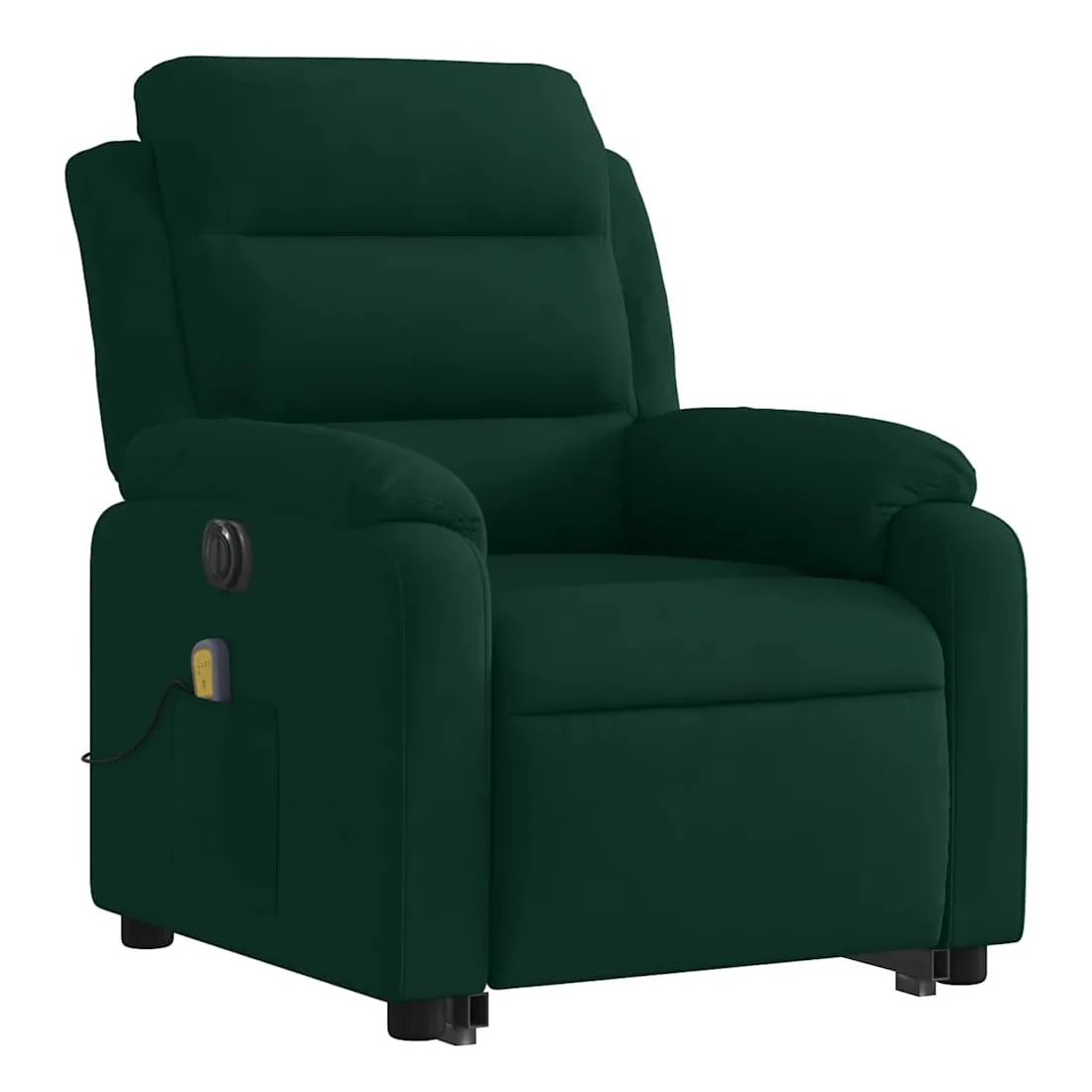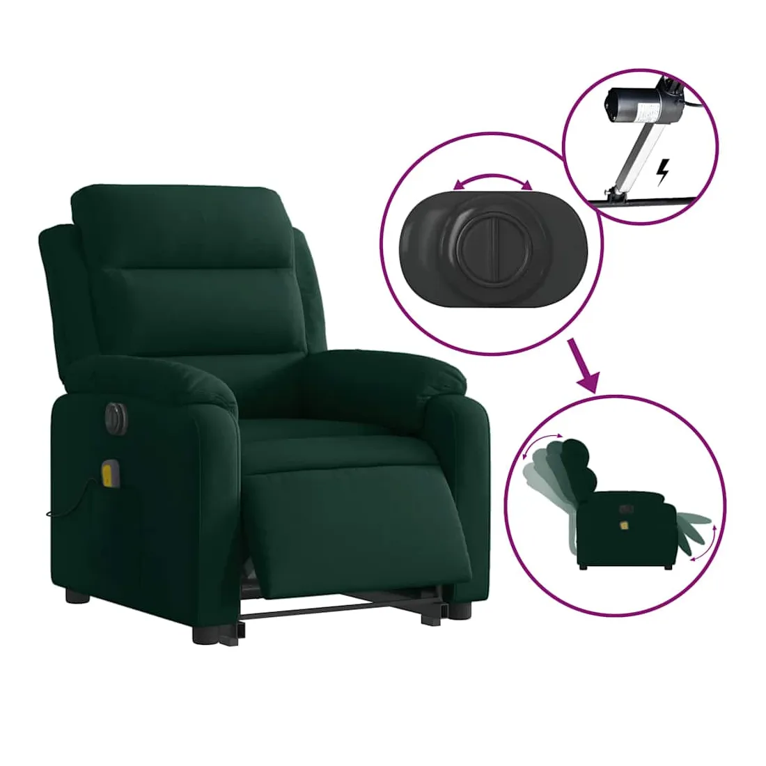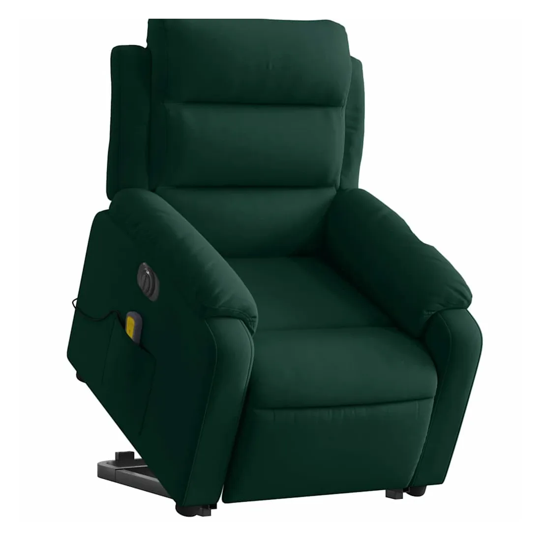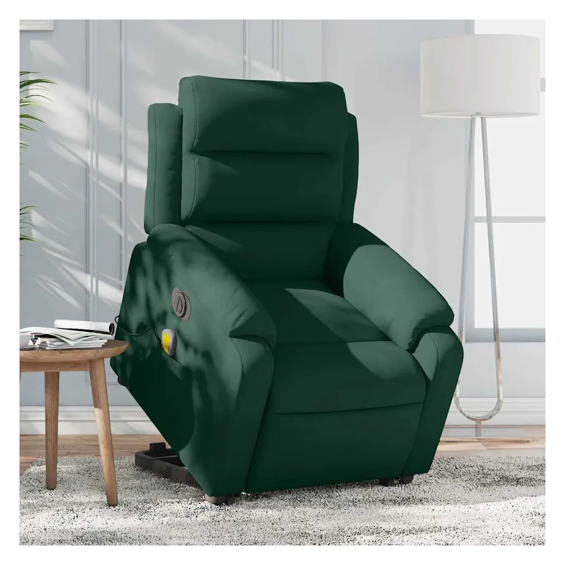 Asseyez-vous et détendez-vous dans ce fauteuil inclinable de massage électrique très confortable ! Fonction de levage électrique : ce fauteuil inclinable pour personnes âgées est équipé d'un moteur électrique pour la fonction de levage. Grâce à la fonction qui pousse toute la chaise vers le haut, vous pouvez facilement vous tenir debout sans stresser votre dos et vos genoux en appuyant simplement sur le bouton.Fonction d'inclinaison électrique : ce fauteuil inclinable est également équipé d'un moteur électrique qui permet de régler automatiquement le repose-pied et le dossier dans n'importe quelle position, selon votre confort, en appuyant simplement sur le bouton situé sur le côté du fauteuil. Cette fonction permet une inclinaison maximale de 135 degrés. En outre, le dossier peut revenir automatiquement à sa position d'origine par une simple pression sur le bouton.Fonction de vibration : les 6 points de massage vous permettent de faire l'expérience d'un massage mieux ciblé. De plus, la télécommande incluse vous permet de choisir différents programmes de massage. La fonction de massage est alimentée par le connecteur USB qui nécessite une source d'alimentation USB certifiée de 5 V (non fournie).Expérience d'assise confortable : le siège, le dossier et les larges accoudoirs rembourrés épais recouverts de velours procurent une sensation confortable et chaleureuse, vous faisant vous sentir enlacé lorsque vous êtes assis. Le velours est un tissu doux et confortable qui est agréable sur la peau.Poche latérale pratique : ce fauteuil est doté d'une poche latérale pour ranger votre télécommande ou garder vos objets essentiels à portée de main.Cadre solide et stable : le cadre en bois et en métal offre une structure solide et une grande stabilité. Ce fauteuil inclinable est confortable et durable.