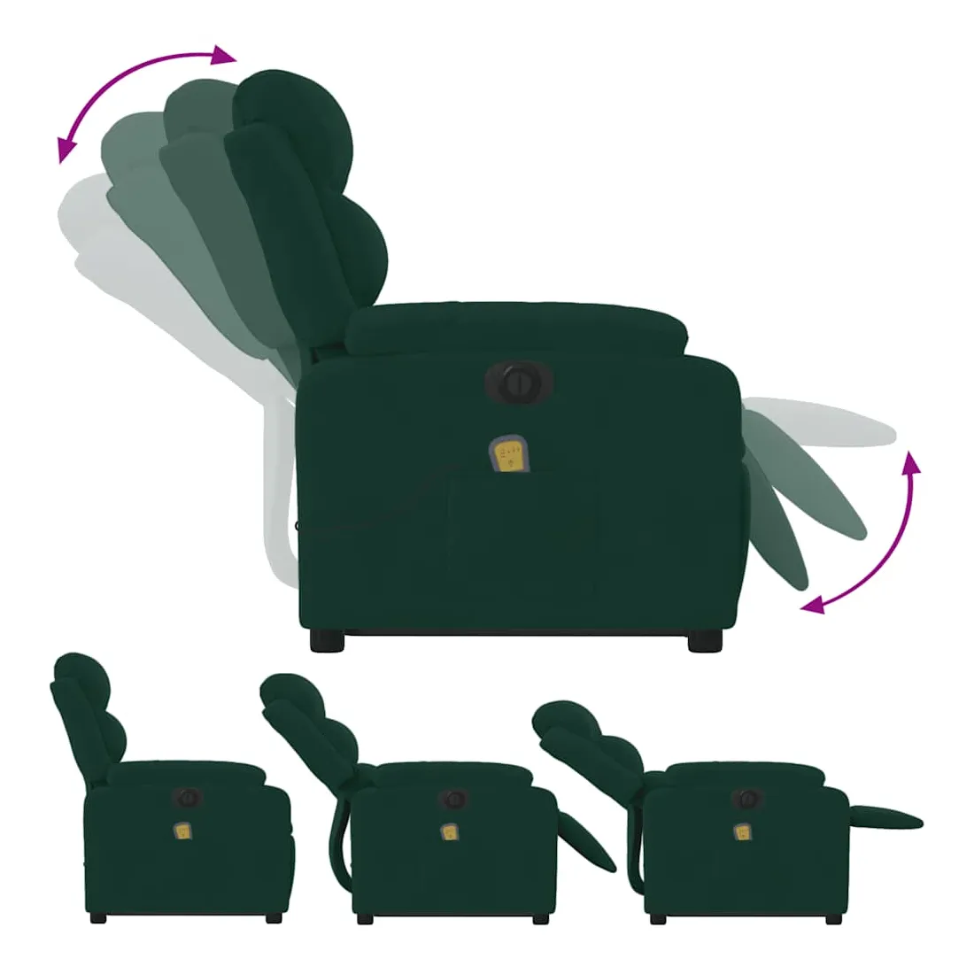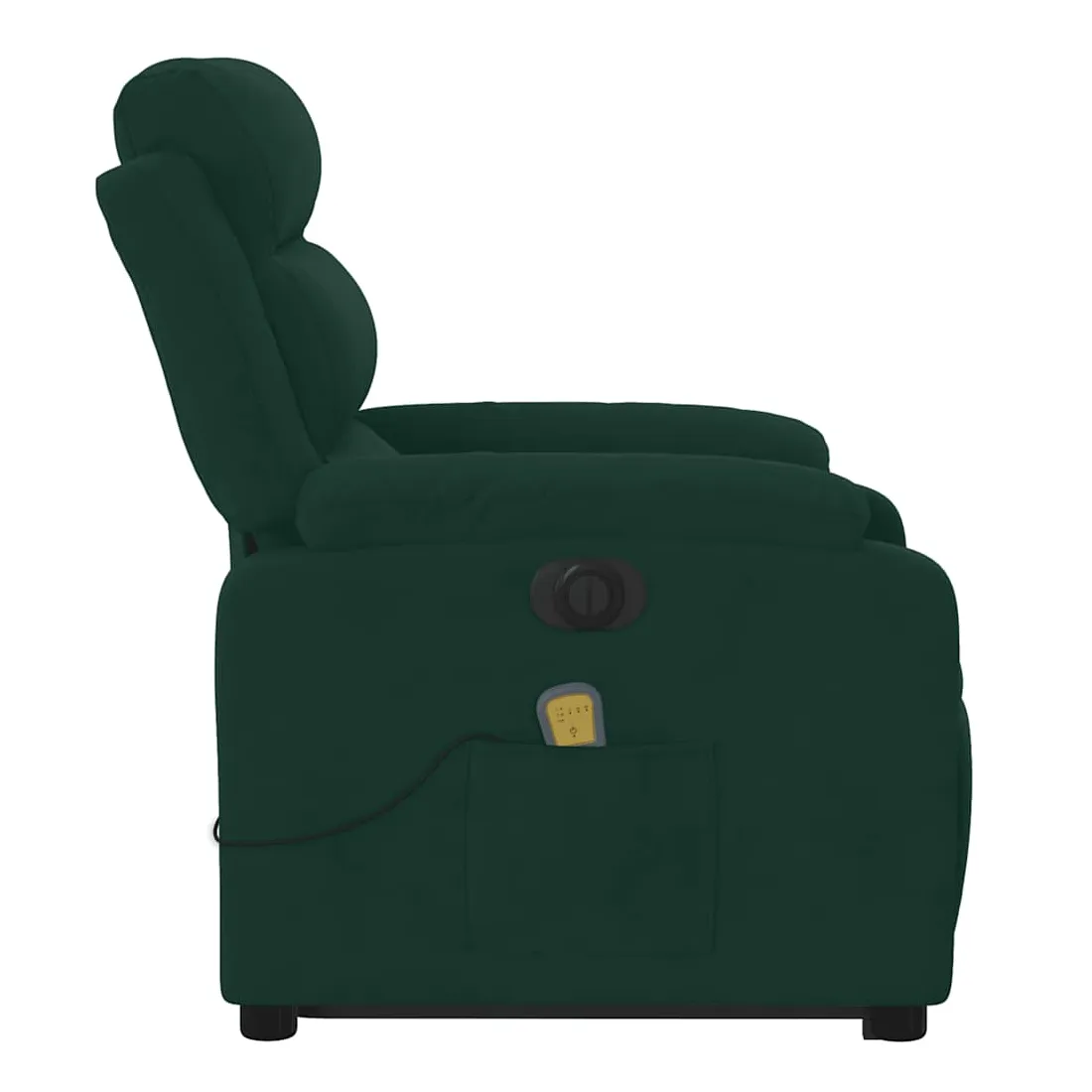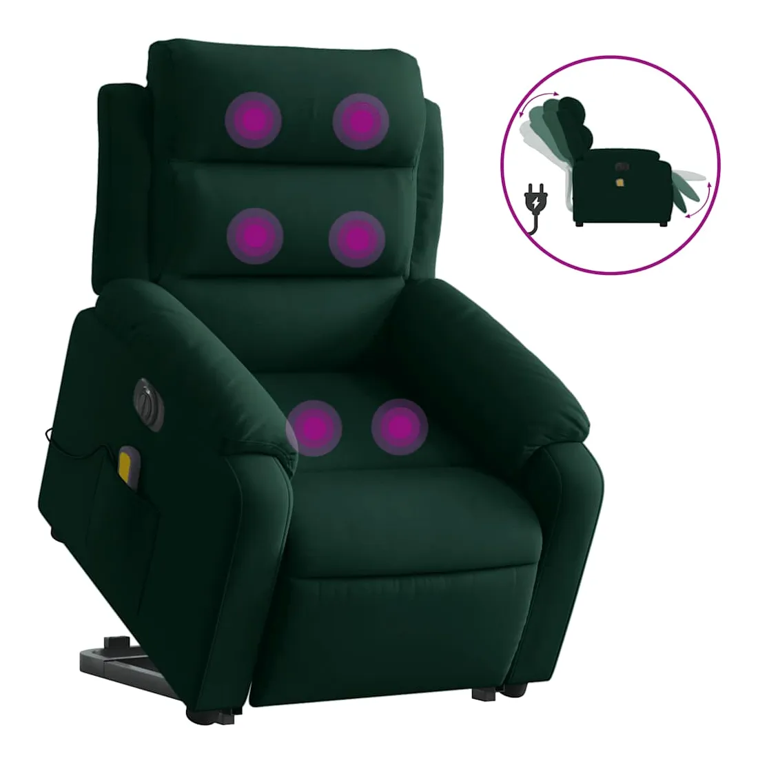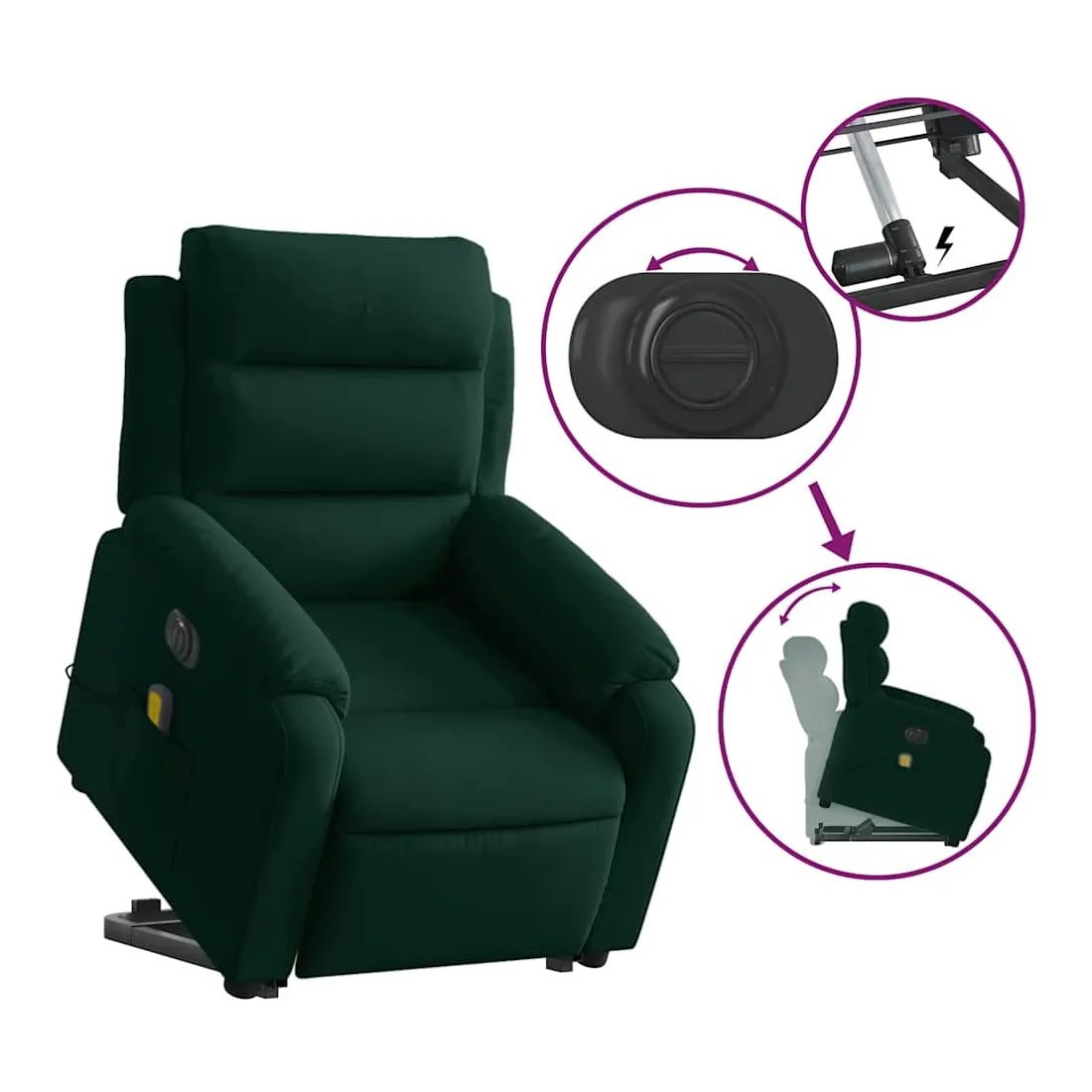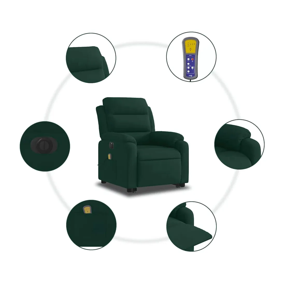 Asseyez-vous et détendez-vous dans ce fauteuil inclinable de massage électrique très confortable ! Fonction de levage électrique : ce fauteuil inclinable pour personnes âgées est équipé d'un moteur électrique pour la fonction de levage. Grâce à la fonction qui pousse toute la chaise vers le haut, vous pouvez facilement vous tenir debout sans stresser votre dos et vos genoux en appuyant simplement sur le bouton.Fonction d'inclinaison électrique : ce fauteuil inclinable est également équipé d'un moteur électrique qui permet de régler automatiquement le repose-pied et le dossier dans n'importe quelle position, selon votre confort, en appuyant simplement sur le bouton situé sur le côté du fauteuil. Cette fonction permet une inclinaison maximale de 135 degrés. En outre, le dossier peut revenir automatiquement à sa position d'origine par une simple pression sur le bouton.Fonction de vibration : les 6 points de massage vous permettent de faire l'expérience d'un massage mieux ciblé. De plus, la télécommande incluse vous permet de choisir différents programmes de massage. La fonction de massage est alimentée par le connecteur USB qui nécessite une source d'alimentation USB certifiée de 5 V (non fournie).Expérience d'assise confortable : le siège, le dossier et les larges accoudoirs rembourrés épais recouverts de velours procurent une sensation confortable et chaleureuse, vous faisant vous sentir enlacé lorsque vous êtes assis. Le velours est un tissu doux et confortable qui est agréable sur la peau.Poche latérale pratique : ce fauteuil est doté d'une poche latérale pour ranger votre télécommande ou garder vos objets essentiels à portée de main.Cadre solide et stable : le cadre en bois et en métal offre une structure solide et une grande stabilité. Ce fauteuil inclinable est confortable et durable.