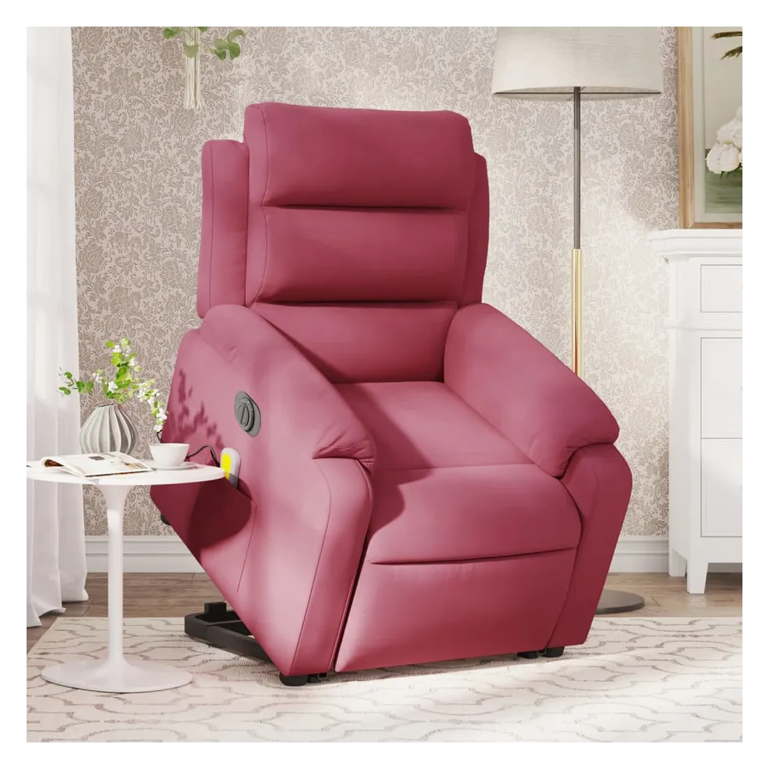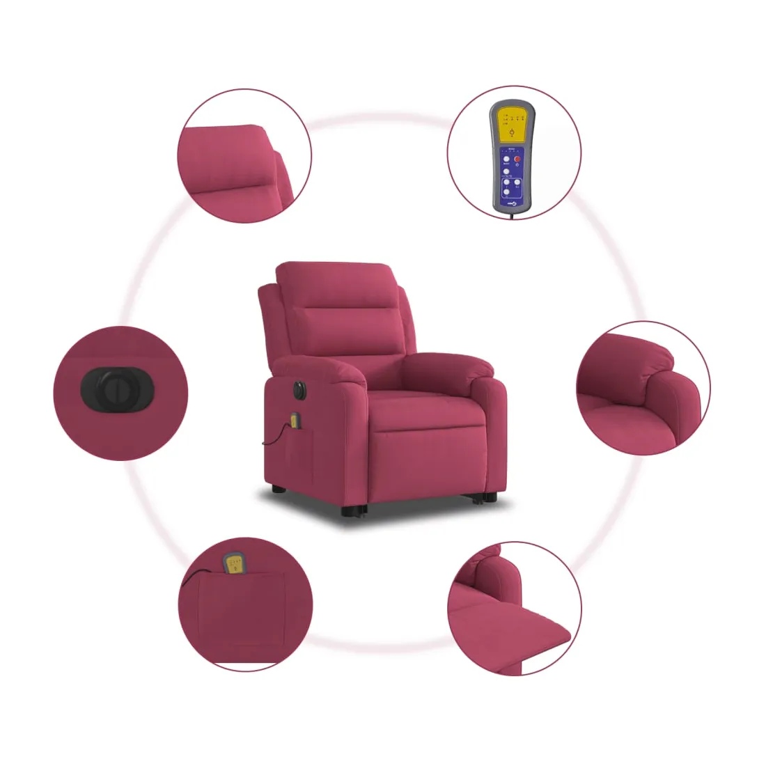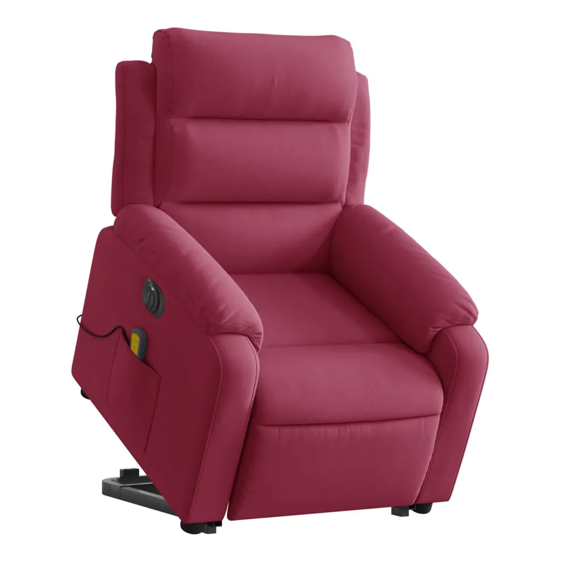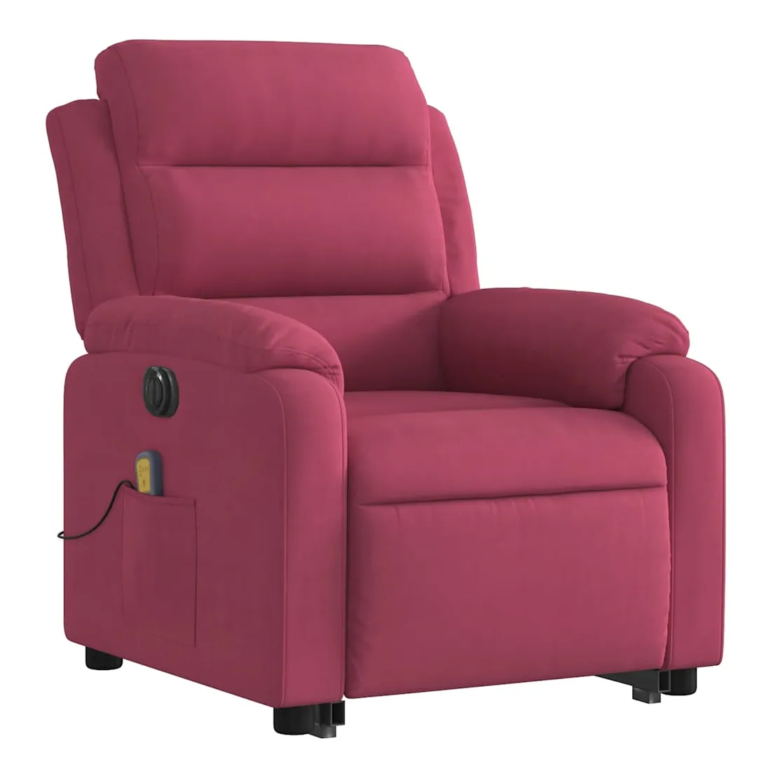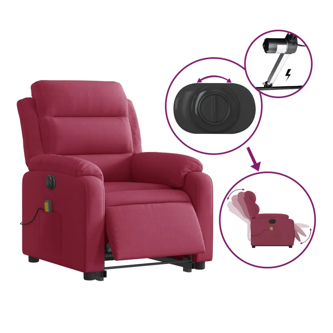 Asseyez-vous et détendez-vous dans ce fauteuil inclinable de massage électrique très confortable ! Fonction de levage électrique : ce fauteuil inclinable pour personnes âgées est équipé d'un moteur électrique pour la fonction de levage. Grâce à la fonction qui pousse toute la chaise vers le haut, vous pouvez facilement vous tenir debout sans stresser votre dos et vos genoux en appuyant simplement sur le bouton.Fonction d'inclinaison électrique : ce fauteuil inclinable est également équipé d'un moteur électrique qui permet de régler automatiquement le repose-pied et le dossier dans n'importe quelle position, selon votre confort, en appuyant simplement sur le bouton situé sur le côté du fauteuil. Cette fonction permet une inclinaison maximale de 135 degrés. En outre, le dossier peut revenir automatiquement à sa position d'origine par une simple pression sur le bouton.Fonction de vibration : les 6 points de massage vous permettent de faire l'expérience d'un massage mieux ciblé. De plus, la télécommande incluse vous permet de choisir différents programmes de massage. La fonction de massage est alimentée par le connecteur USB qui nécessite une source d'alimentation USB certifiée de 5 V (non fournie).Expérience d'assise confortable : le siège, le dossier et les larges accoudoirs rembourrés épais recouverts de velours procurent une sensation confortable et chaleureuse, vous faisant vous sentir enlacé lorsque vous êtes assis. Le velours est un tissu doux et confortable qui est agréable sur la peau.Poche latérale pratique : ce fauteuil est doté d'une poche latérale pour ranger votre télécommande ou garder vos objets essentiels à portée de main.Cadre solide et stable : le cadre en bois et en métal offre une structure solide et une grande stabilité. Ce fauteuil inclinable est confortable et durable.