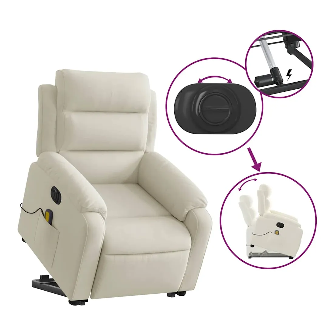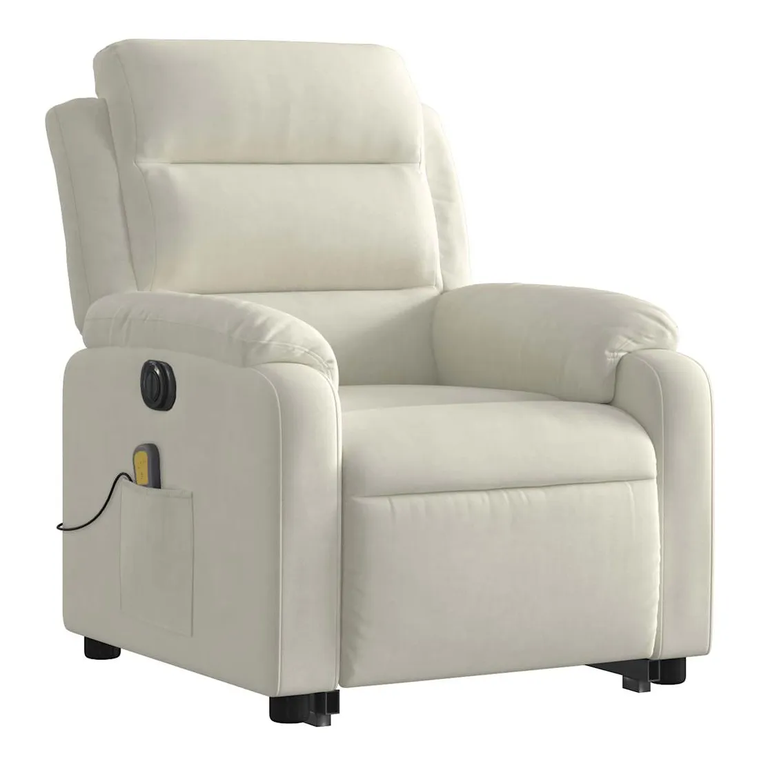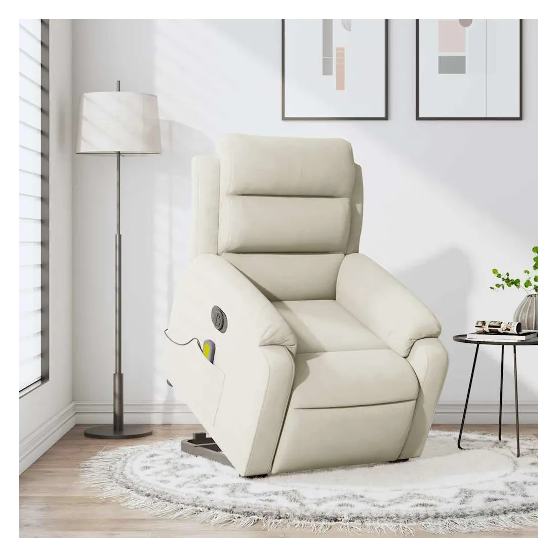 Asseyez-vous et détendez-vous dans ce fauteuil inclinable de massage électrique très confortable ! Fonction de levage électrique : ce fauteuil inclinable pour personnes âgées est équipé d'un moteur électrique pour la fonction de levage. Grâce à la fonction qui pousse toute la chaise vers le haut, vous pouvez facilement vous tenir debout sans stresser votre dos et vos genoux en appuyant simplement sur le bouton.Fonction d'inclinaison électrique : ce fauteuil inclinable est également équipé d'un moteur électrique qui permet de régler automatiquement le repose-pied et le dossier dans n'importe quelle position, selon votre confort, en appuyant simplement sur le bouton situé sur le côté du fauteuil. Cette fonction permet une inclinaison maximale de 135 degrés. En outre, le dossier peut revenir automatiquement à sa position d'origine par une simple pression sur le bouton.Fonction de vibration : les 6 points de massage vous permettent de faire l'expérience d'un massage mieux ciblé. De plus, la télécommande incluse vous permet de choisir différents programmes de massage. La fonction de massage est alimentée par le connecteur USB qui nécessite une source d'alimentation USB certifiée de 5 V (non fournie).Expérience d'assise confortable : le siège, le dossier et les larges accoudoirs rembourrés épais recouverts de velours procurent une sensation confortable et chaleureuse, vous faisant vous sentir enlacé lorsque vous êtes assis. Le velours est un tissu doux et confortable qui est agréable sur la peau.Poche latérale pratique : ce fauteuil est doté d'une poche latérale pour ranger votre télécommande ou garder vos objets essentiels à portée de main.Cadre solide et stable : le cadre en bois et en métal offre une structure solide et une grande stabilité. Ce fauteuil inclinable est confortable et durable.