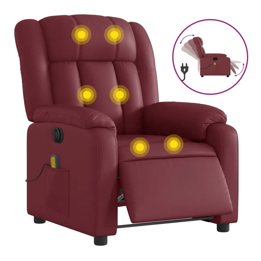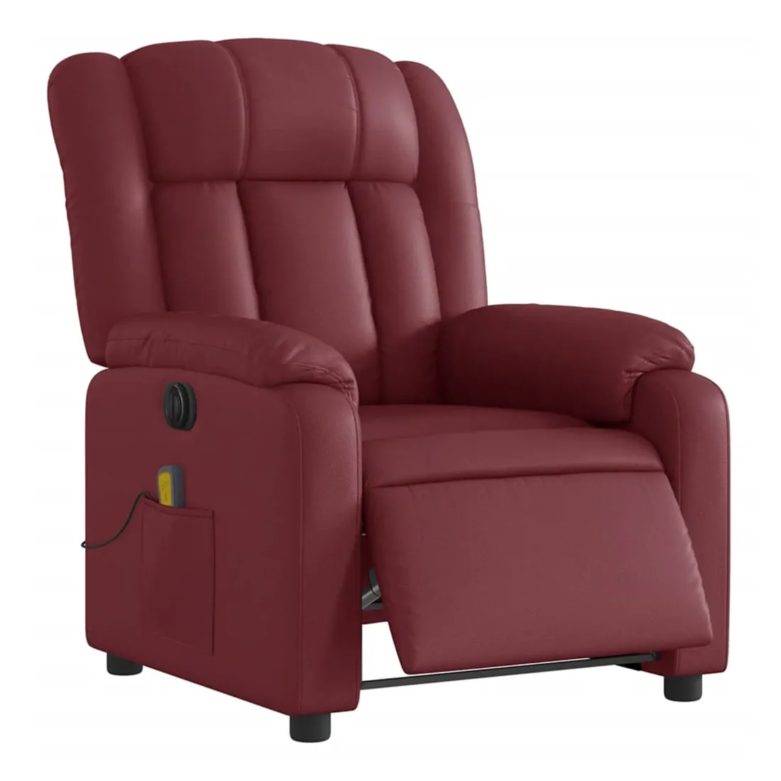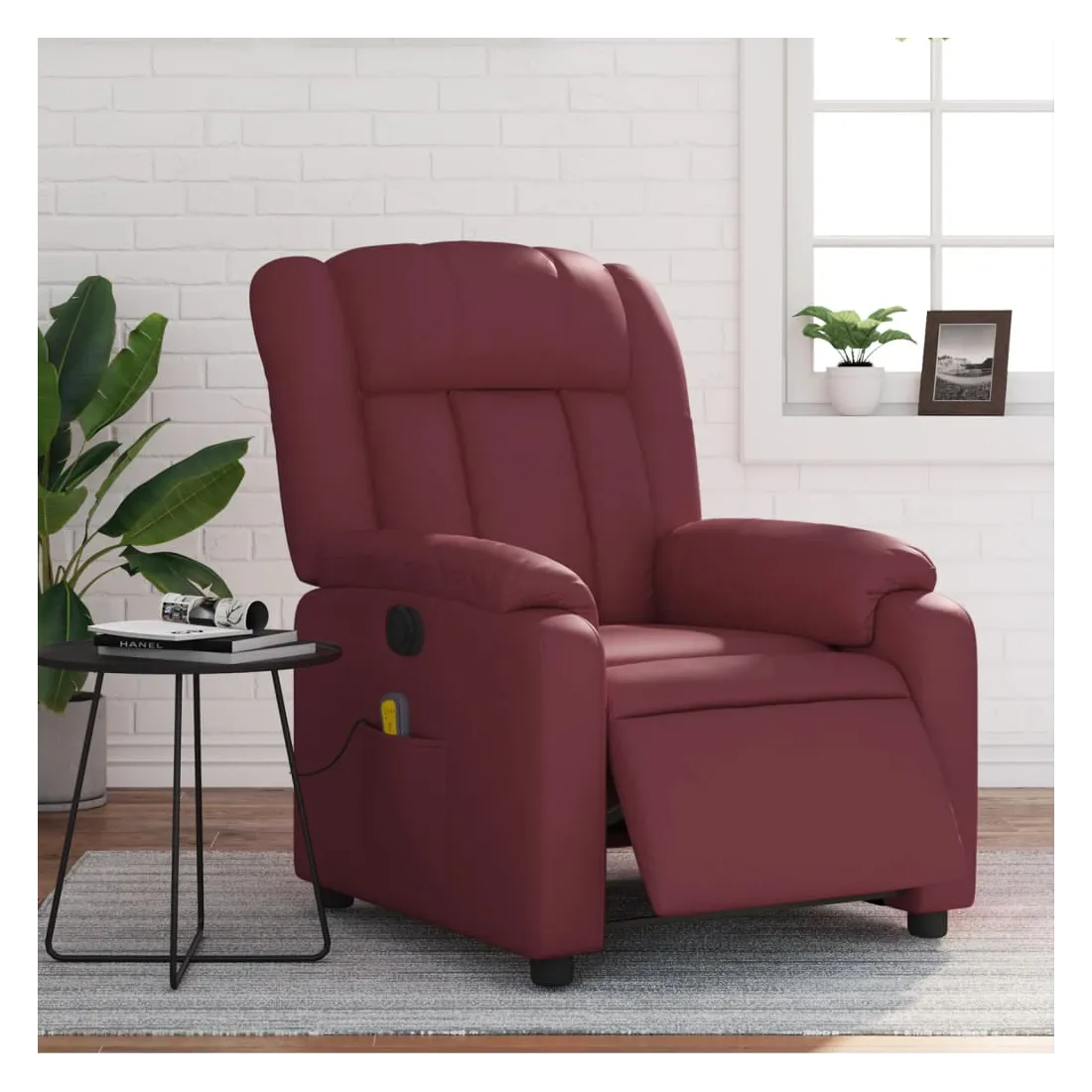 Asseyez-vous et détendez-vous dans ce fauteuil inclinable de massage électrique très confortable ! Fonction d'inclinaison électrique : ce fauteuil inclinable est équipé d'un moteur électrique qui permet de régler automatiquement le repose-pied et le dossier dans n'importe quelle position, selon votre confort, en appuyant simplement sur le bouton situé sur le côté du fauteuil. Cette fonction permet une inclinaison maximale de 135 degrés. En outre, le dossier peut revenir automatiquement à sa position d'origine par une simple pression sur le bouton.Fonction de vibration : les 6 points de massage vous permettent de faire l'expérience d'un massage mieux ciblé. De plus, la télécommande incluse vous permet de choisir différents programmes de massage. La fonction de massage est alimentée par le connecteur USB qui nécessite une source d'alimentation USB certifiée de 5 V (non fournie).Expérience de siège confortable : le siège, le dossier et les larges accoudoirs rembourrés épais recouverts de similicuir procurent une sensation confortable et chaleureuse, vous faisant vous sentir enlacé lorsque vous êtes assis. Le simili cuir est un matériau très résistant. Il est résistant aux taches, ce qui le rend facile à nettoyer avec un chiffon humide. La surface lisse donne également un aspect luxueux et la beauté du cuir véritable.Poche latérale pratique : ce fauteuil est doté d'une poche latérale pour ranger votre télécommande ou garder vos objets essentiels à portée de main.Cadre solide et stable : le cadre en bois et en métal offre une structure solide et une grande stabilité. Ce fauteuil inclinable est confortable et durable.