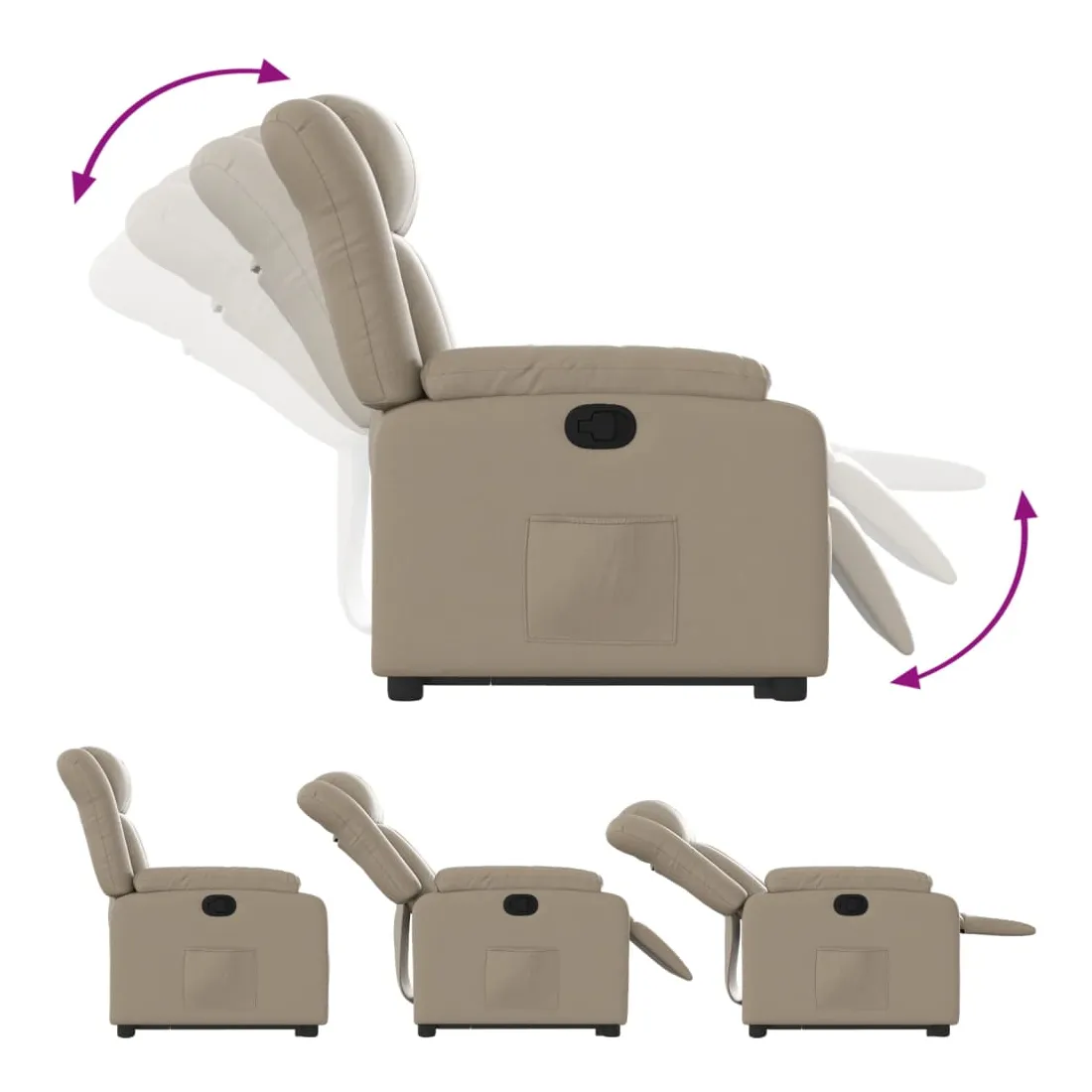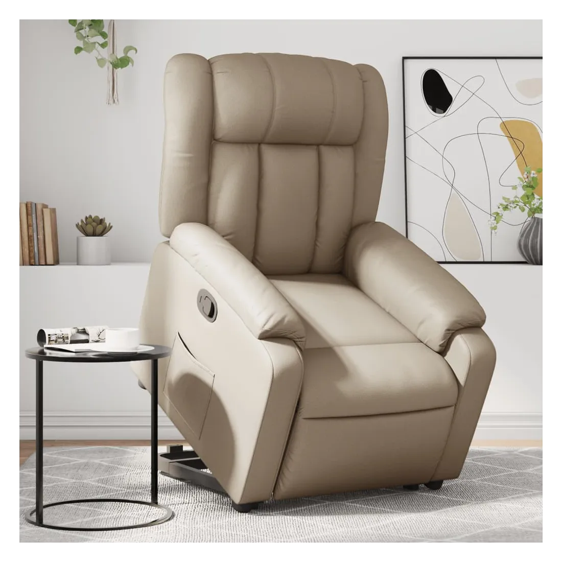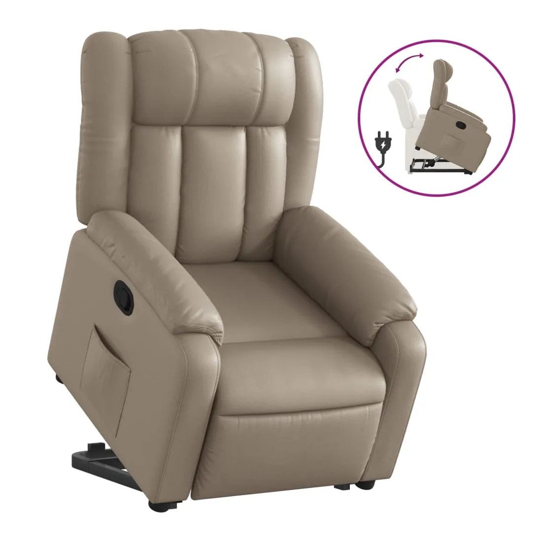 Asseyez-vous et détendez-vous dans ce fauteuil inclinable très confortable ! Fonction de levage électrique : ce fauteuil inclinable pour personnes âgées est équipé d'un moteur électrique pour la fonction de levage. Grâce à la fonction qui pousse toute la chaise vers le haut, vous pouvez facilement vous tenir debout sans stresser votre dos et vos genoux en appuyant simplement sur le bouton.Fonction d'inclinaison manuelle : ce fauteuil inclinable est doté d'une poignée du côté droit. Vous pouvez régler manuellement le repose-pieds et le dossier dans n'importe quelle position selon votre confort en tirant simplement sur la poignée. Cette fonction permet une inclinaison maximale de 135 degrés. De plus, le dossier peut revenir rapidement à sa position d'origine en tirant simplement sur la poignée.Expérience de siège confortable : le siège, le dossier et les larges accoudoirs rembourrés épais recouverts de similicuir procurent une sensation confortable et chaleureuse, vous faisant vous sentir enlacé lorsque vous êtes assis. Le simili cuir est un matériau très résistant. Il est résistant aux taches, ce qui le rend facile à nettoyer avec un chiffon humide. La surface lisse donne également un aspect luxueux et la beauté du cuir véritable.Poche latérale pratique : ce fauteuil est doté d'une poche latérale pour vous permettre de garder vos objets essentiels à portée de main.Cadre solide et stable : le cadre en bois et en métal offre une structure solide et une grande stabilité. Ce fauteuil inclinable est confortable et durable.