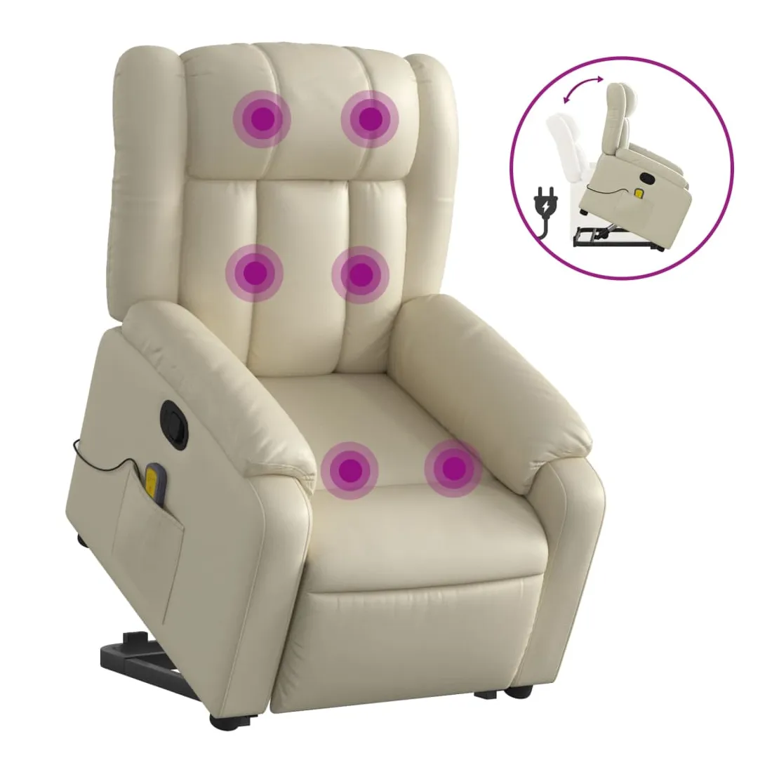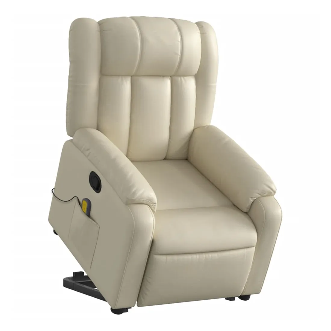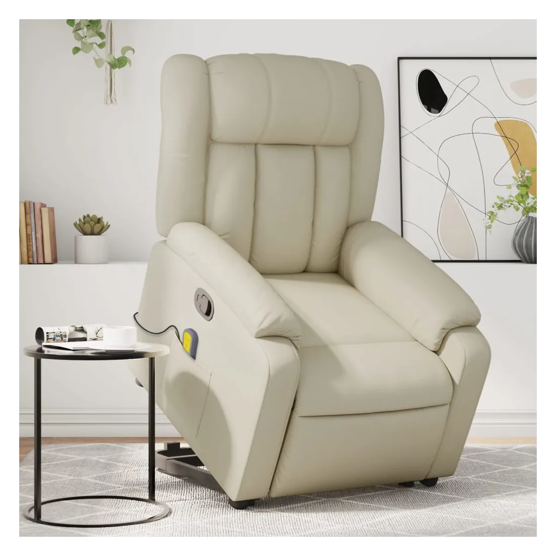 Asseyez-vous et détendez-vous dans ce fauteuil inclinable de massage très confortable ! Fonction de levage électrique : ce fauteuil inclinable pour personnes âgées est équipé d'un moteur électrique pour la fonction de levage. Grâce à la fonction qui pousse toute la chaise vers le haut, vous pouvez facilement vous tenir debout sans stresser votre dos et vos genoux en appuyant simplement sur le bouton.Fonction d'inclinaison manuelle : ce fauteuil inclinable est doté d'une poignée du côté droit. Vous pouvez régler manuellement le repose-pieds et le dossier dans n'importe quelle position selon votre confort en tirant simplement sur la poignée. Cette fonction permet une inclinaison maximale de 135 degrés. De plus, le dossier peut revenir rapidement à sa position d'origine en tirant simplement sur la poignée.Fonction de vibration : les 6 points de massage vous permettent de faire l'expérience d'un massage mieux ciblé. De plus, la télécommande incluse vous permet de choisir différents programmes de massage. La fonction de massage est alimentée par le connecteur USB qui nécessite une source d'alimentation USB certifiée de 5 V (non fournie).Expérience de siège confortable : le siège, le dossier et les larges accoudoirs rembourrés épais recouverts de similicuir procurent une sensation confortable et chaleureuse, vous faisant vous sentir enlacé lorsque vous êtes assis. Le simili cuir est un matériau très résistant. Il est résistant aux taches, ce qui le rend facile à nettoyer avec un chiffon humide. La surface lisse donne également un aspect luxueux et la beauté du cuir véritable.Poche latérale pratique : ce fauteuil est doté d'une poche latérale pour ranger votre télécommande ou garder vos objets essentiels à portée de main.Cadre solide et stable : le cadre en bois et en métal offre une structure solide et une grande stabilité. Ce fauteuil inclinable est confortable et durable.